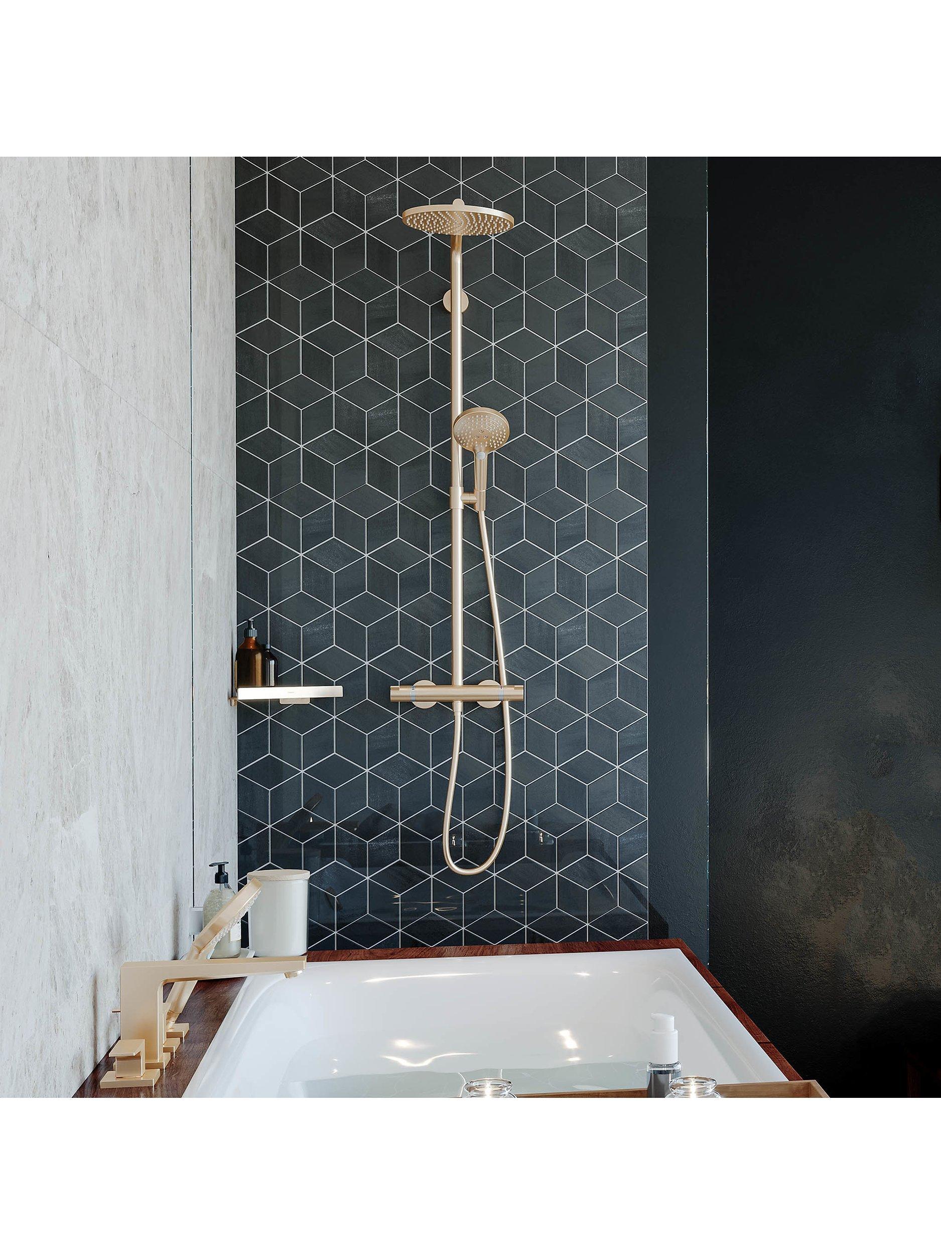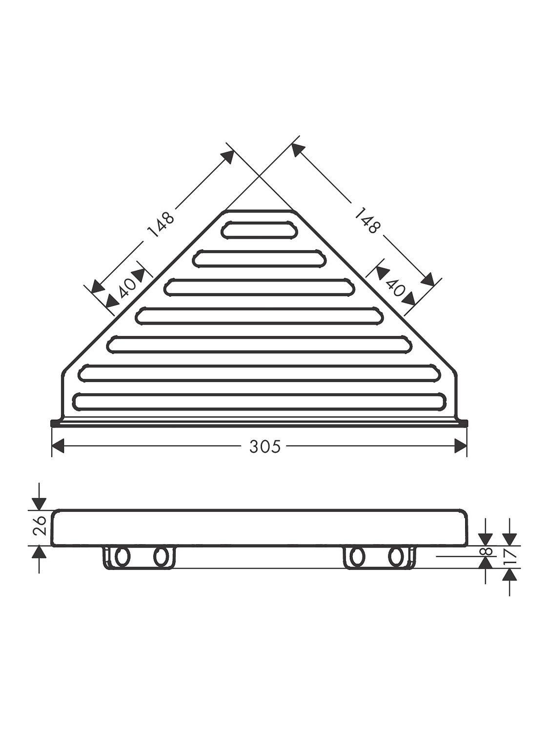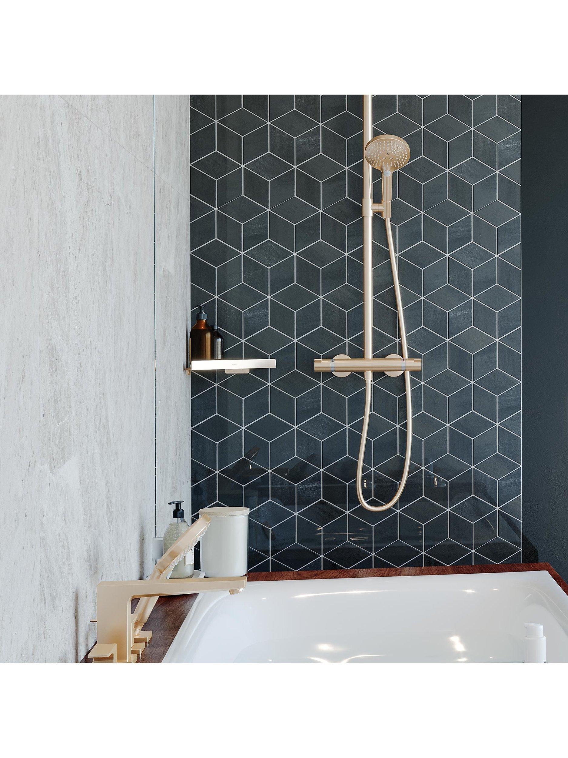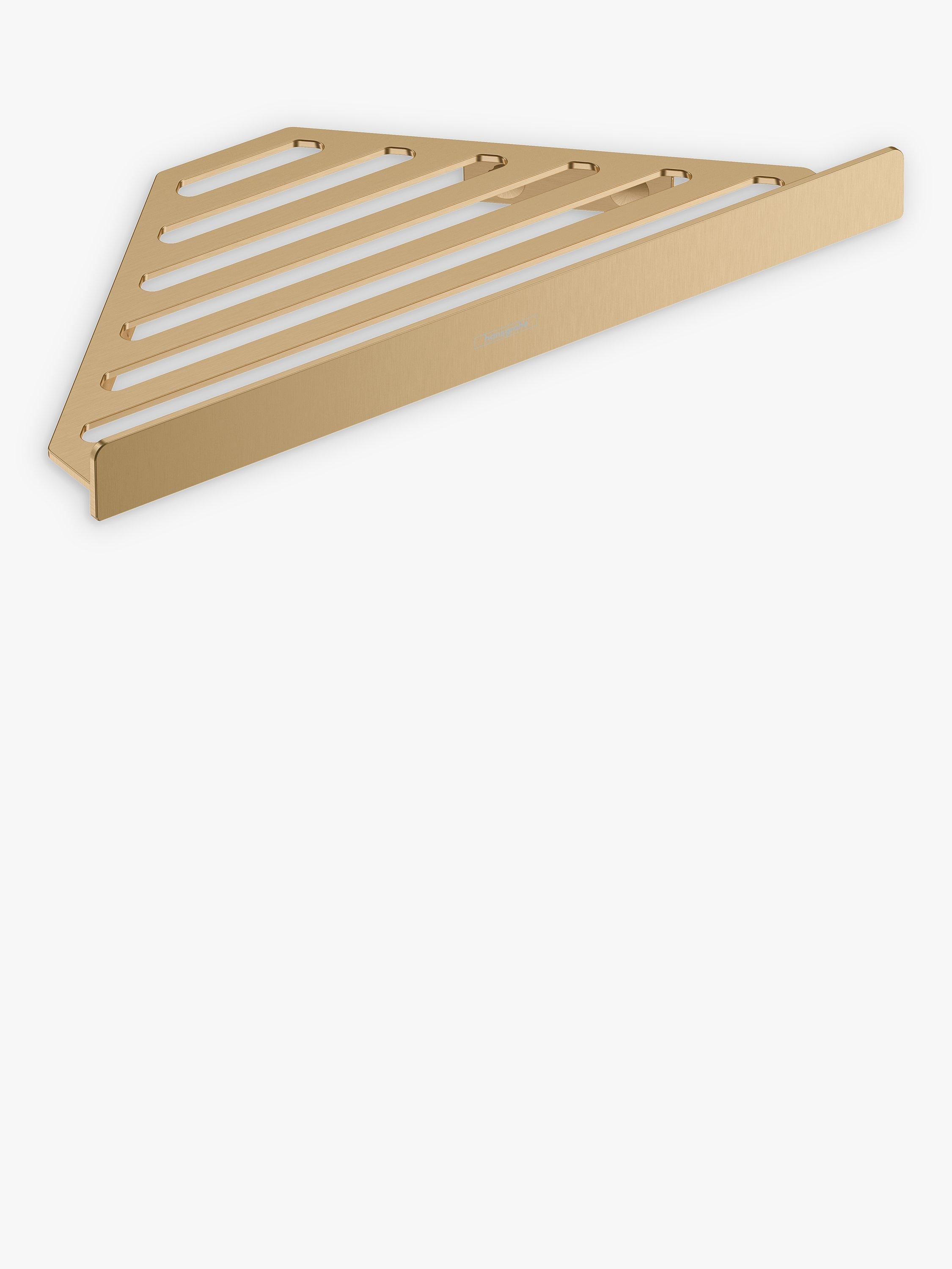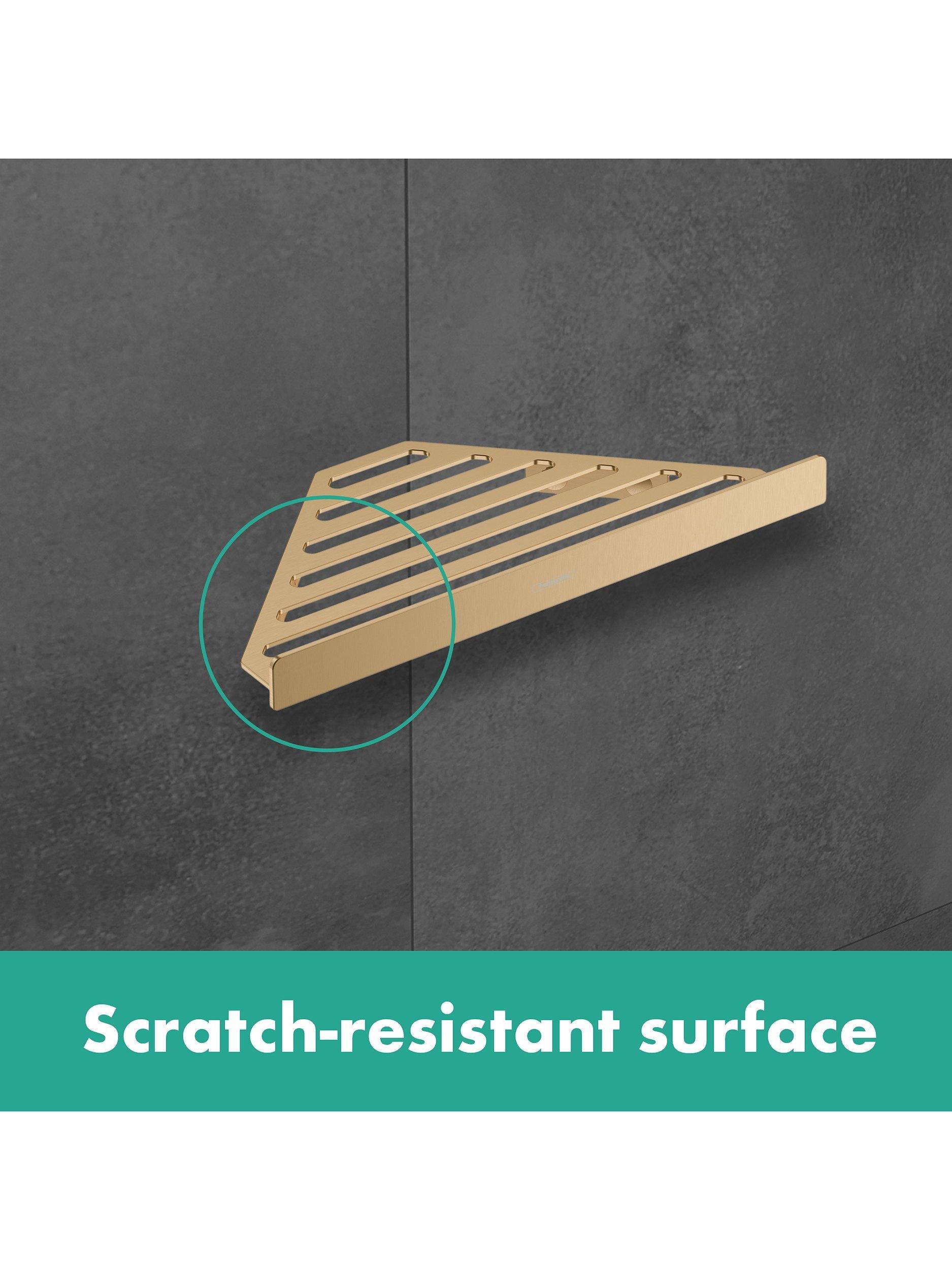 A stylish AddStoris wall-mounted corner shelf, adding visual and functional flair to a shower. With this modern and minimalist design from Hansgrohe, shampoo and other toiletries are always within easy reach.