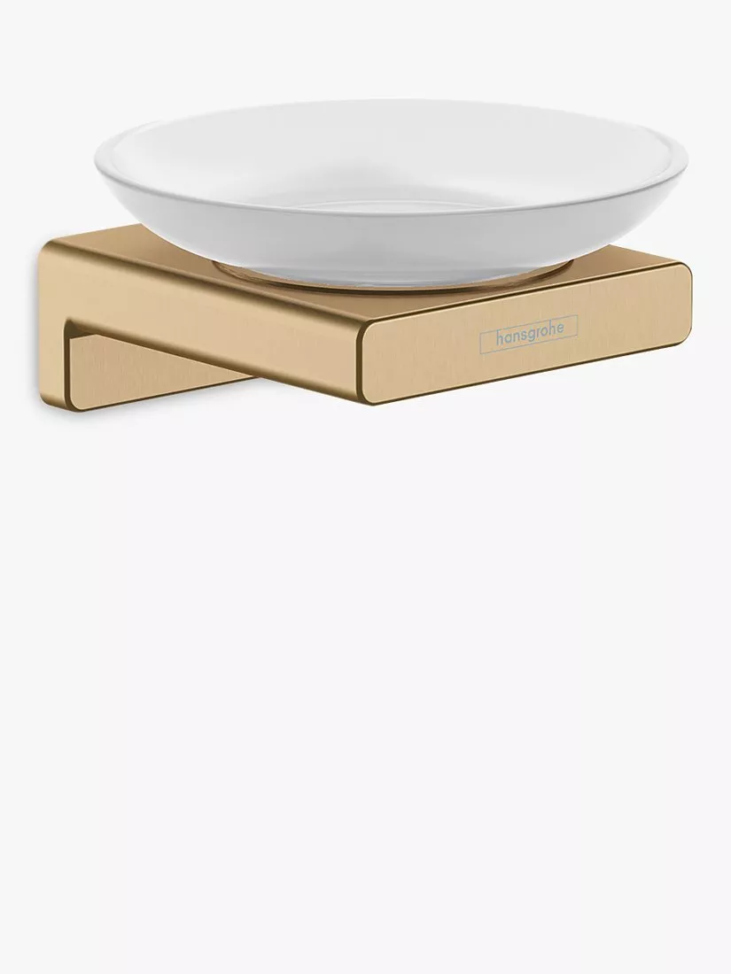 The AddStoris soap dish from Hansgrohe adds visual and functional flair to a bathroom or kitchen. With this modern and minimalist design, an elegant glass soap dish rests on a metal wall-mounted support.