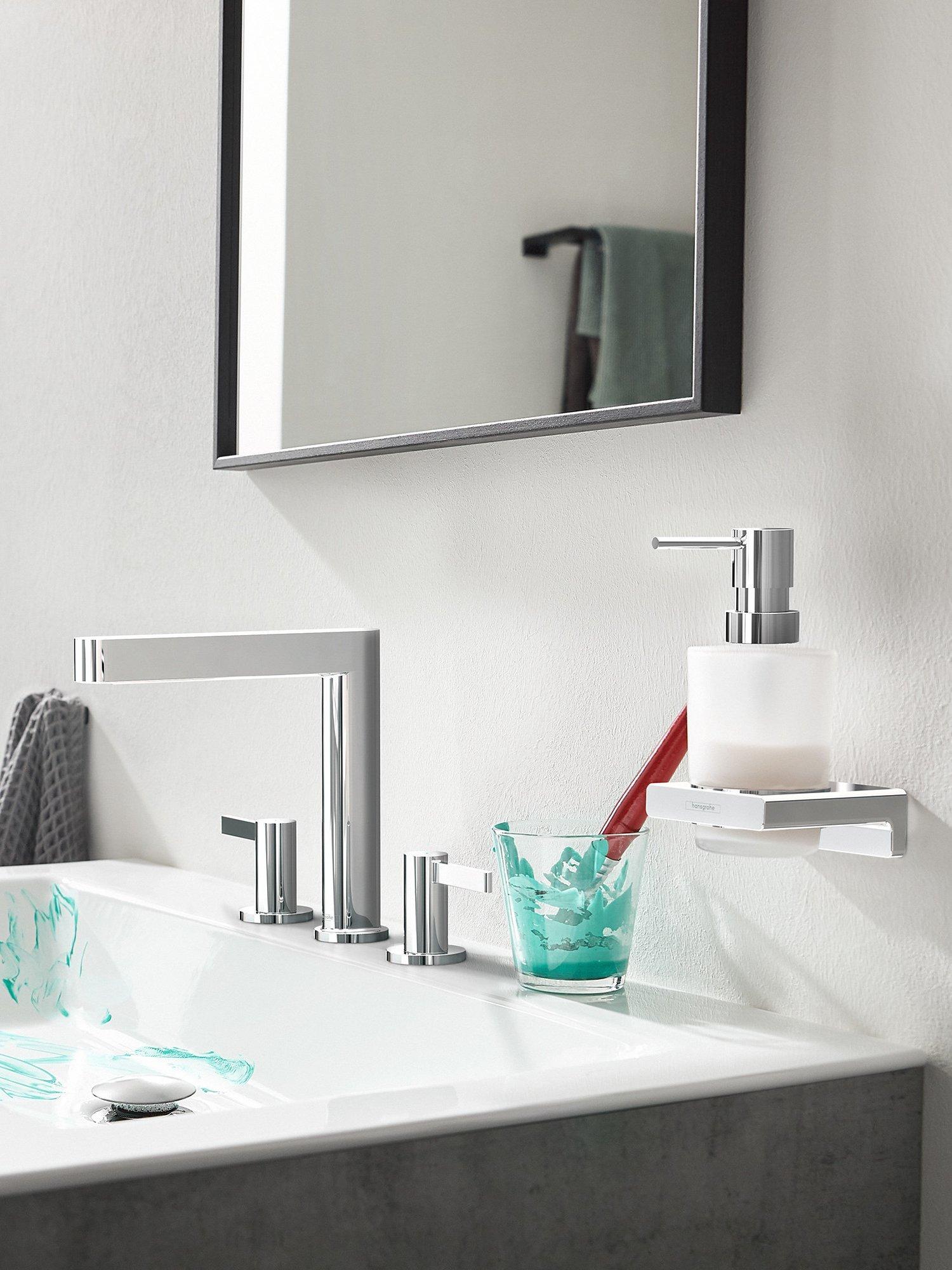 The AddStoris soap dispenser from Hansgrohe adds visual and functional flair to a bathroom or kitchen. With this modern and minimalist design, a metal wall-mounted support holds a glass pump-action container. It holds approximately 200ml of liquid soap and it releases 2ml clean portions when pressure is applied to the pump.