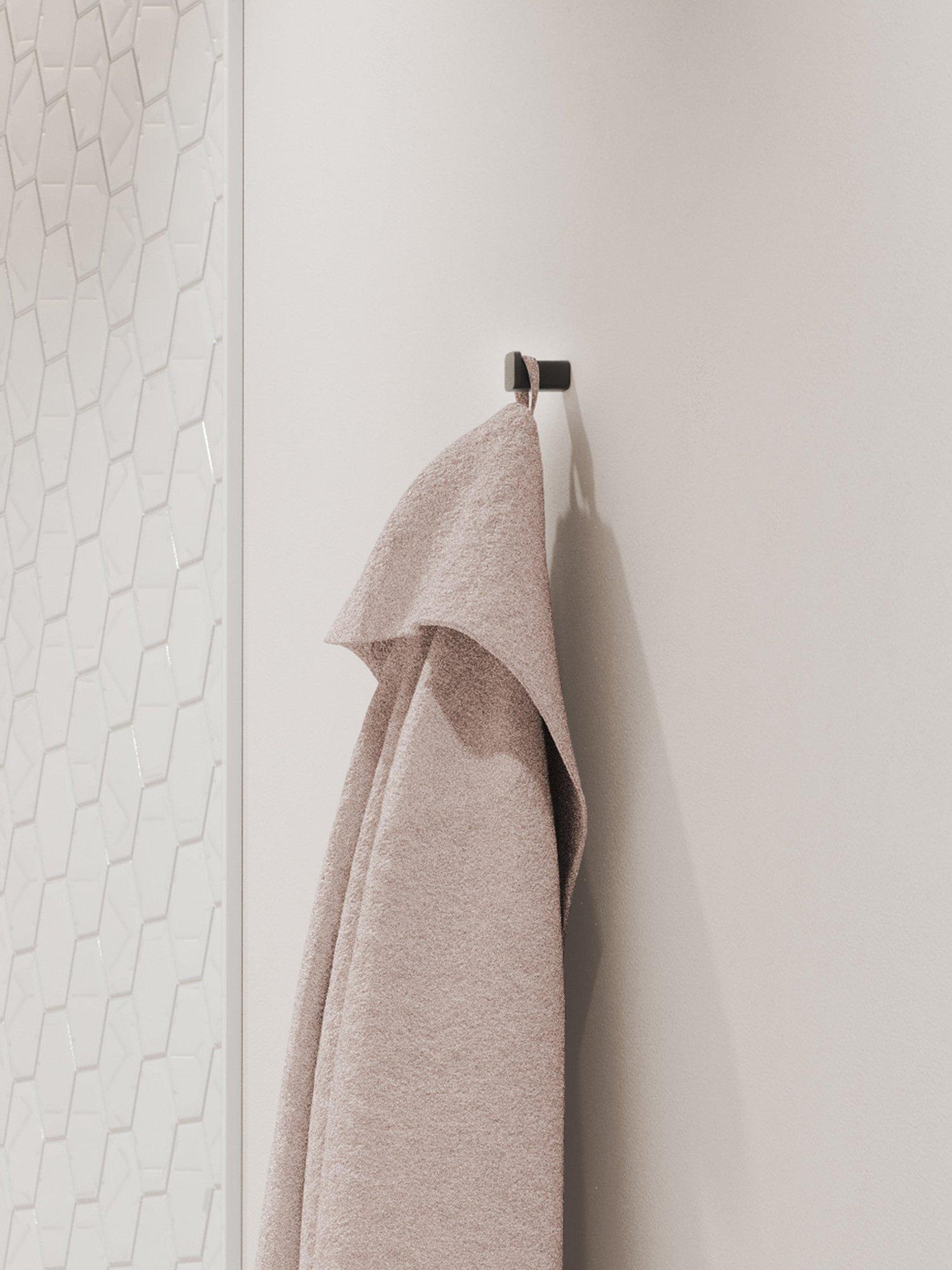 A stylish AddStoris wall-mounted bath towel hook, from Hansgrohe, adding visual and functional flair to a bathroom. With this modern and minimalist design, the compact hook keeps a bath towel or bathrobe within easy reach.