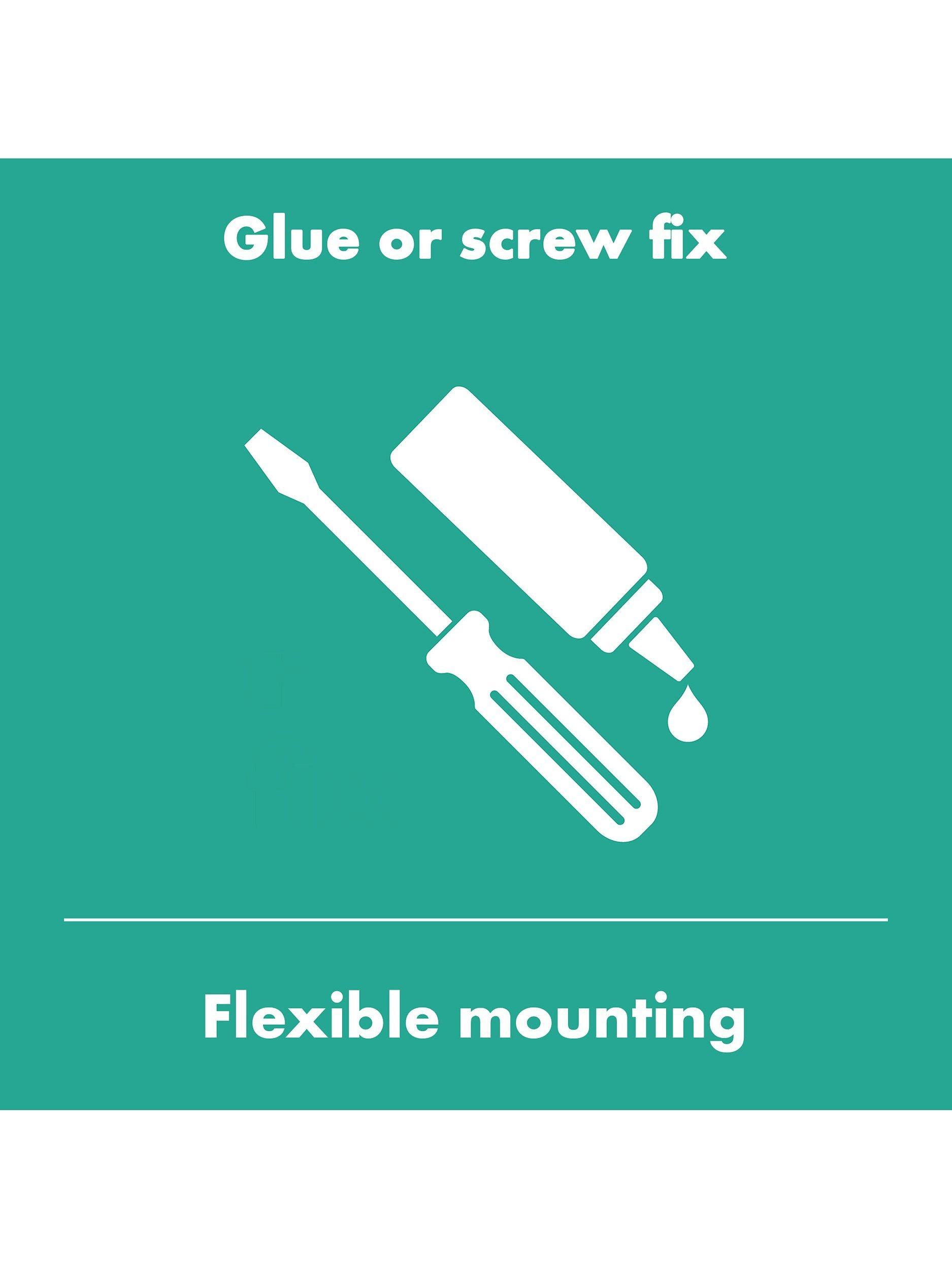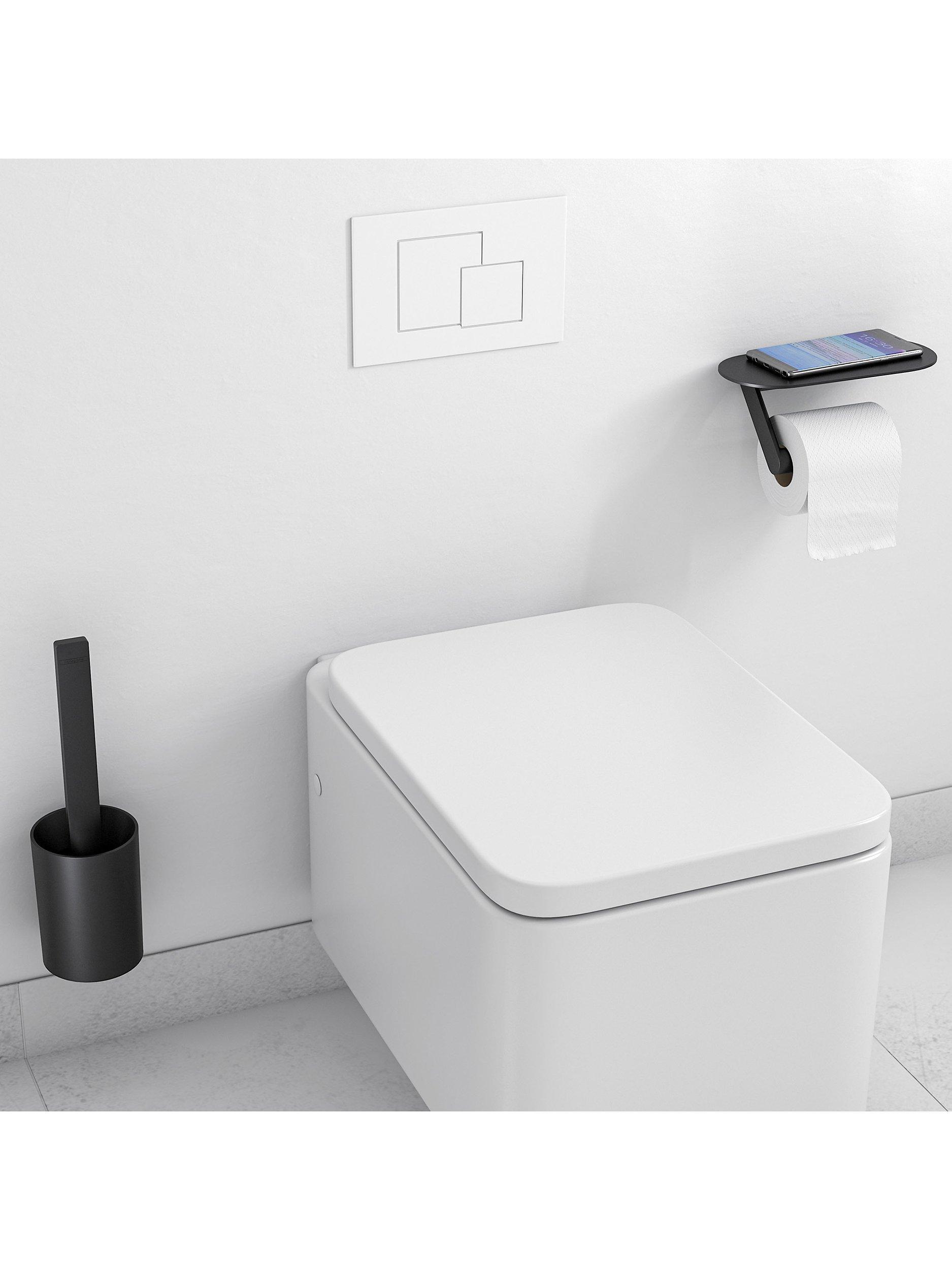 The toilet roll holder has a handy shelf and there's room for hygiene items or a replacement roll. Both can be fastened with screws, or glued with the included adhesive that can be removed without leaving any residue.