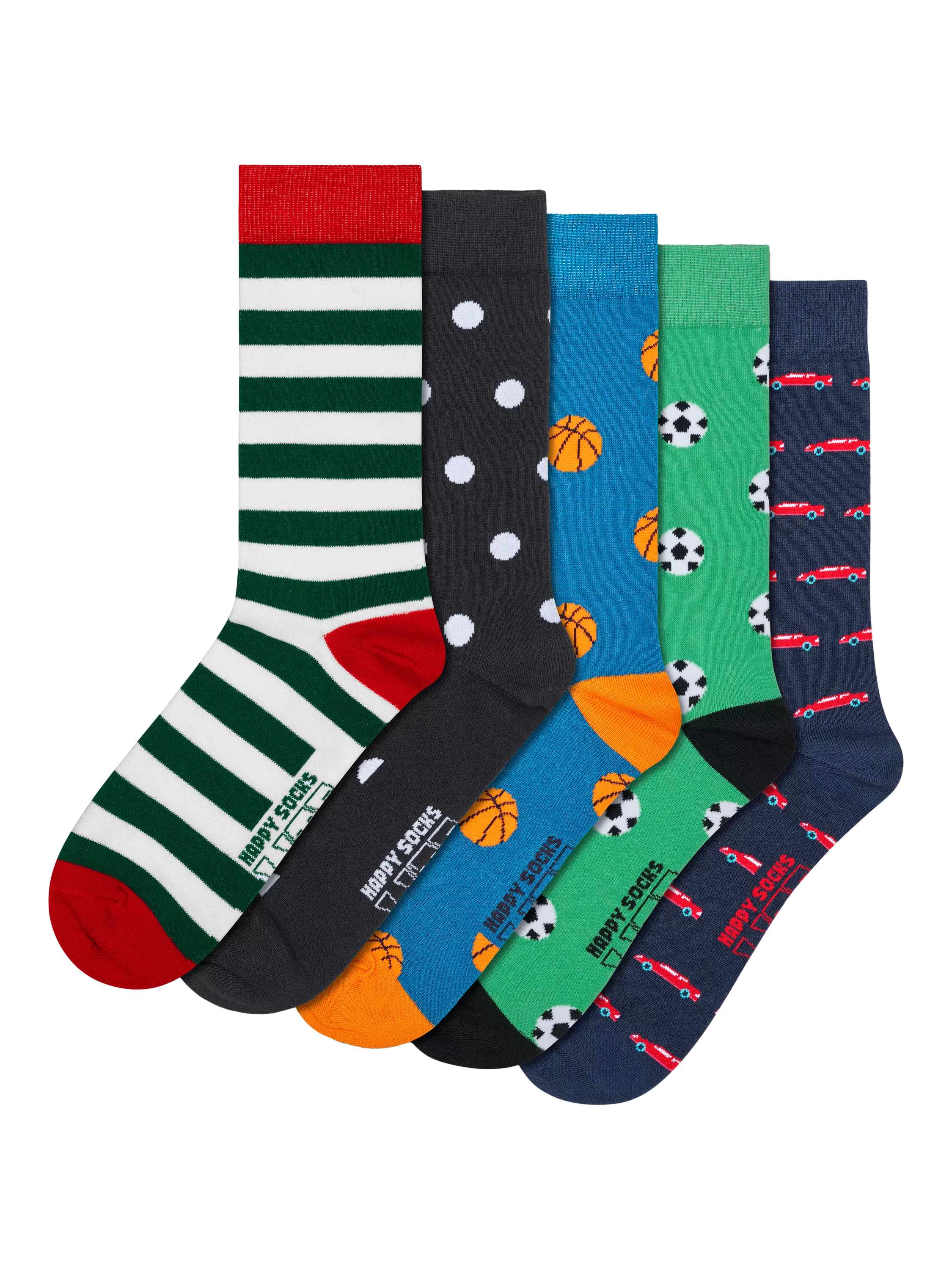 Happy Socks cheer up your feet! A delightful selection for the sporty one in your life. This five-pack includes footballs, basketballs, spots and stripes. Oh, plus a repeating car pattern pair for the less sporty too.