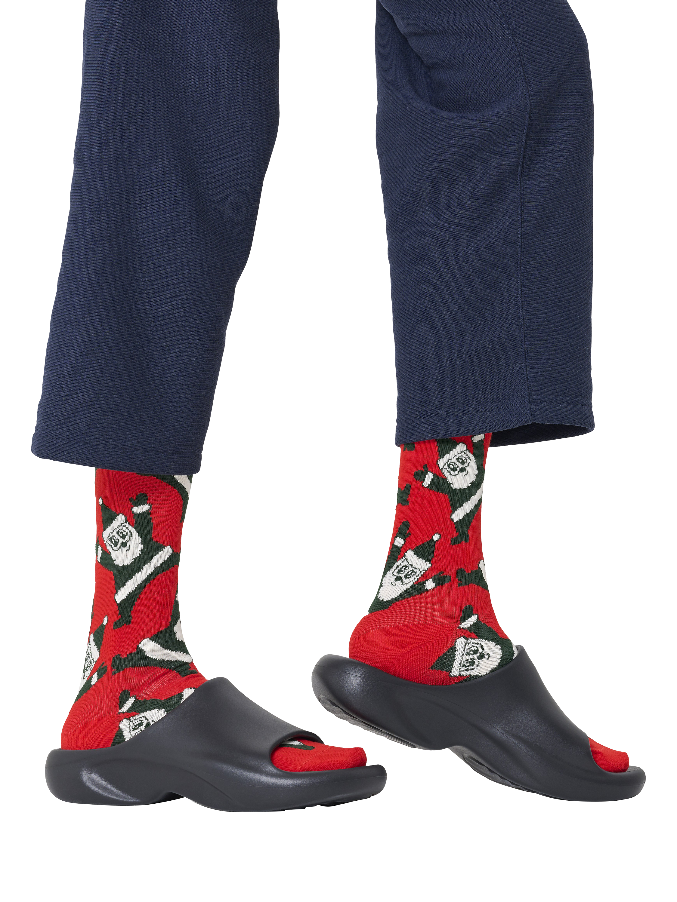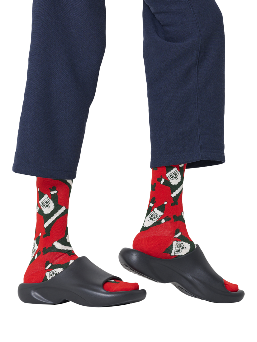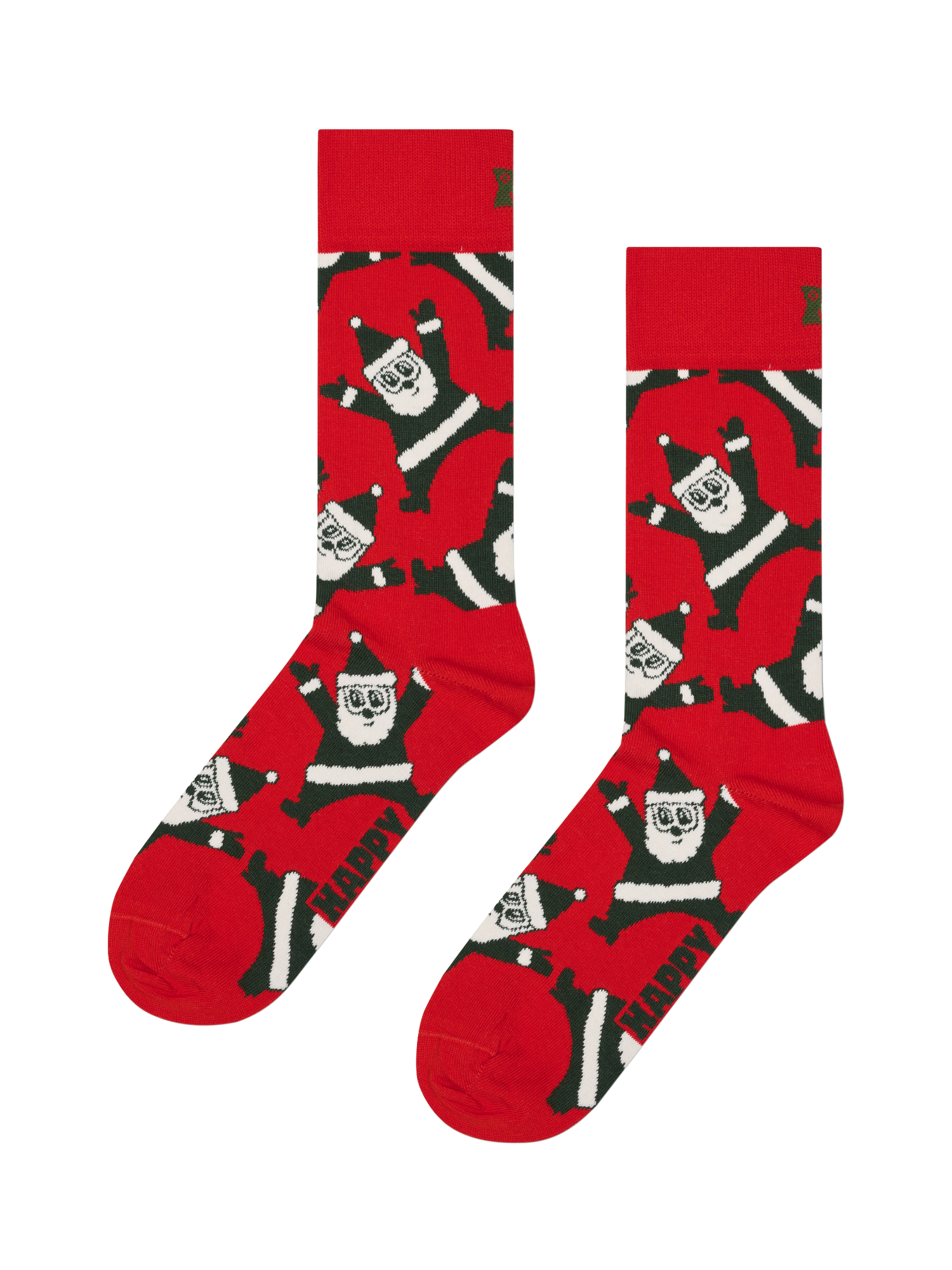 Happy Socks cheer up your feet! Festive Christmas socks showcasing cartwheeling Santas on a vibrant red background, ideal for Secret Santa gifts to bring cheer and joy.