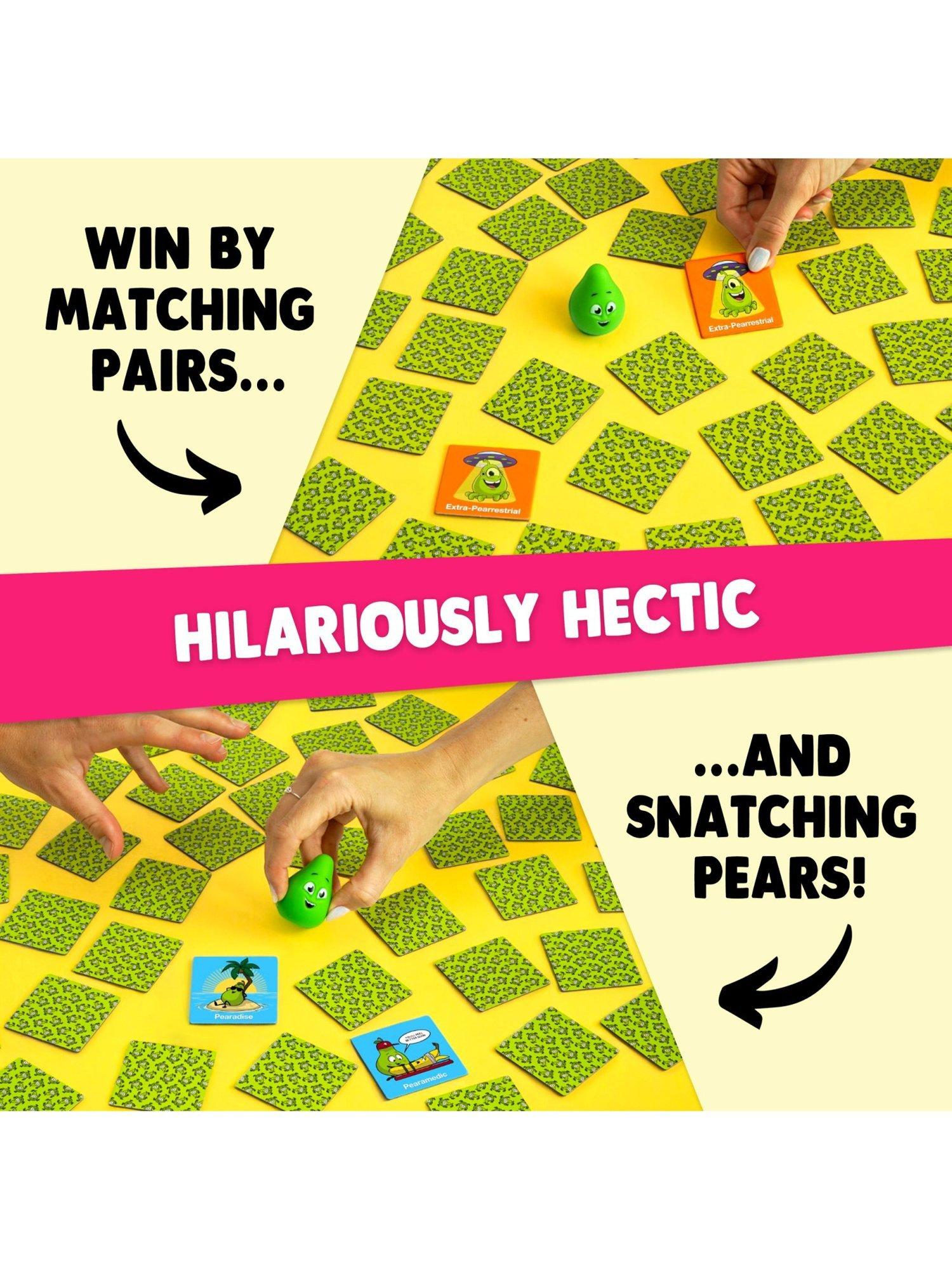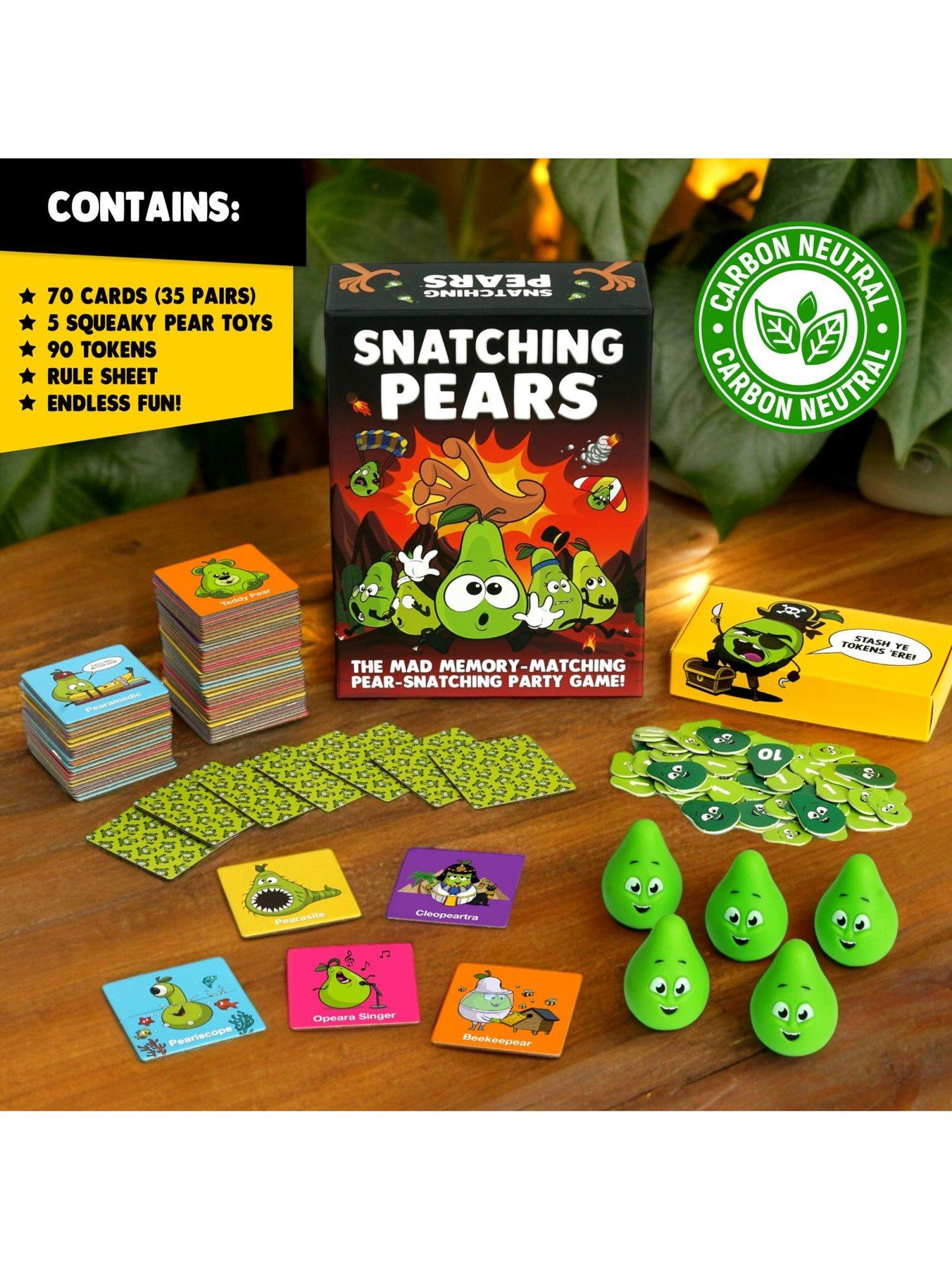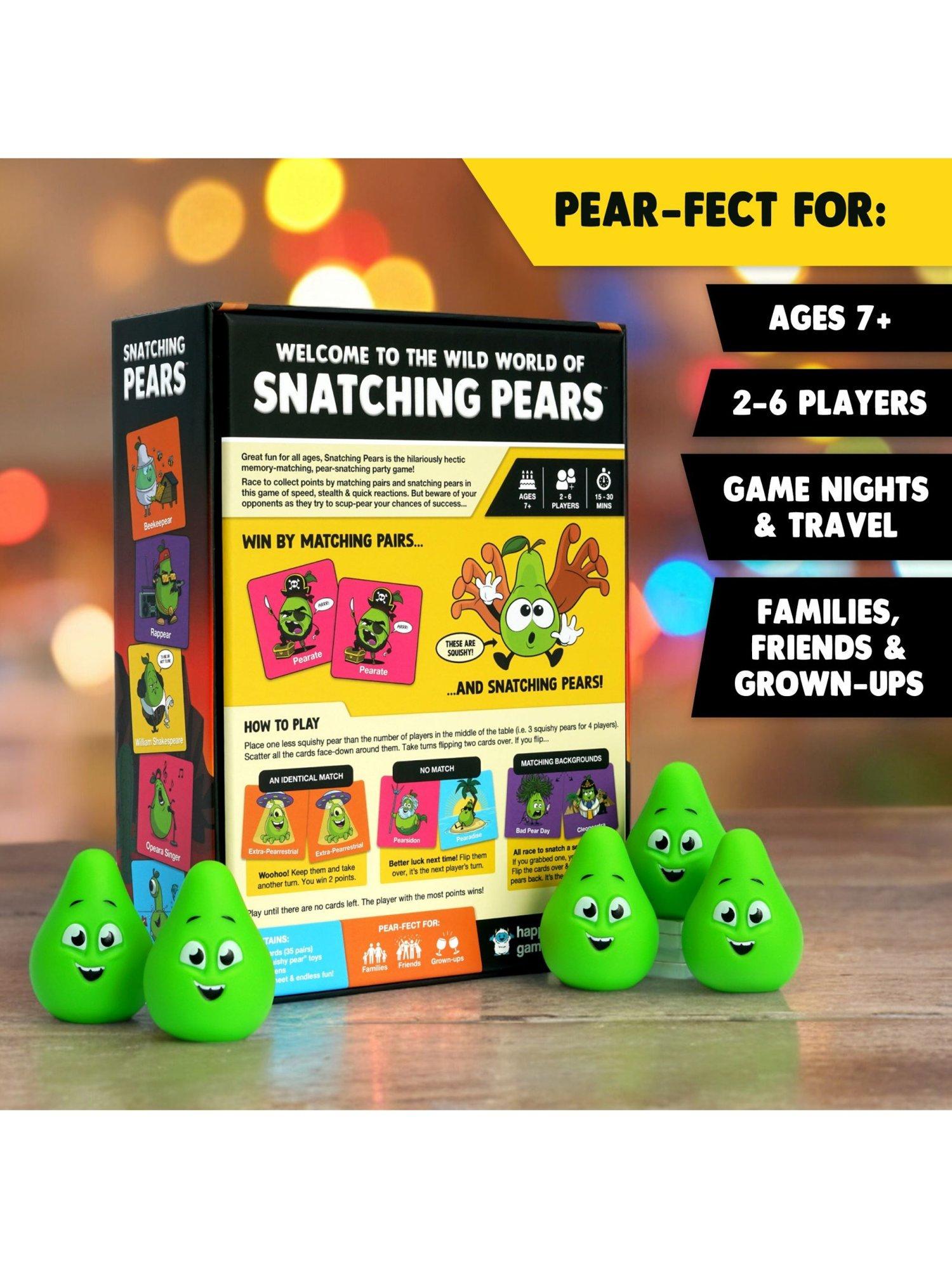 FLIP, MATCH, SNATCH! Flip over cards to find matching pairs and earn points. But watch out! When certain cards are flipped, it's a race to snatch squishy pears for extra points. The player with the most points wins.