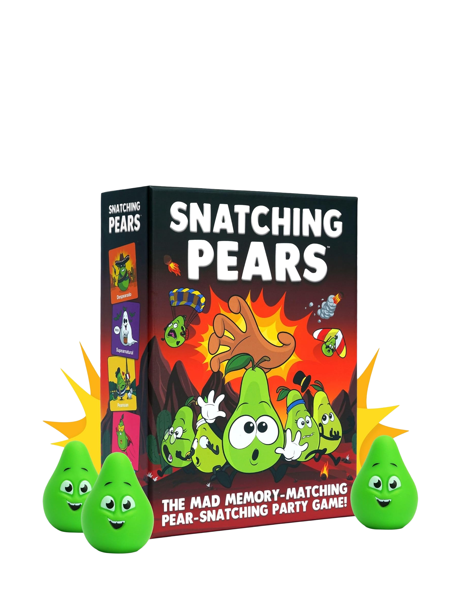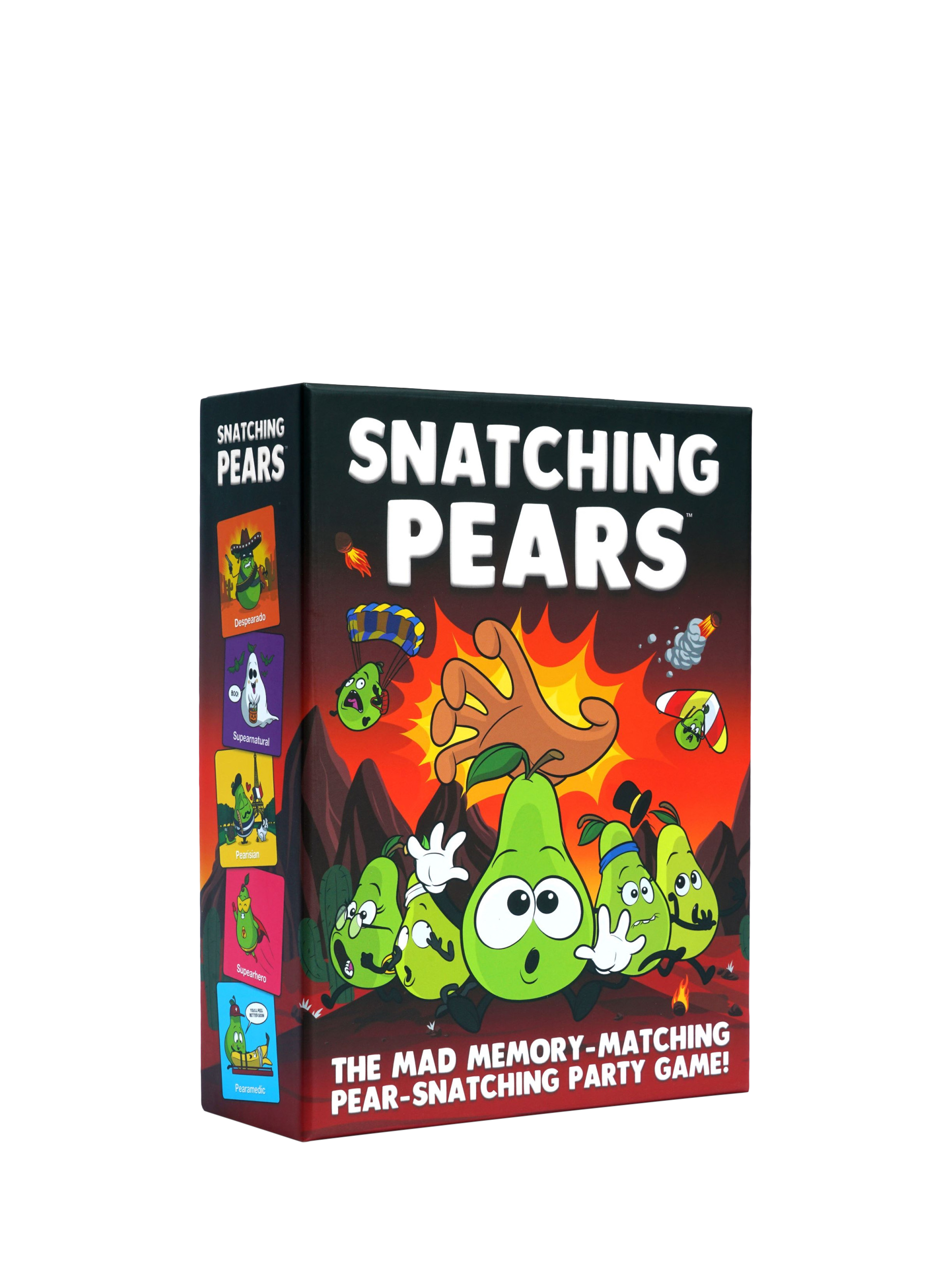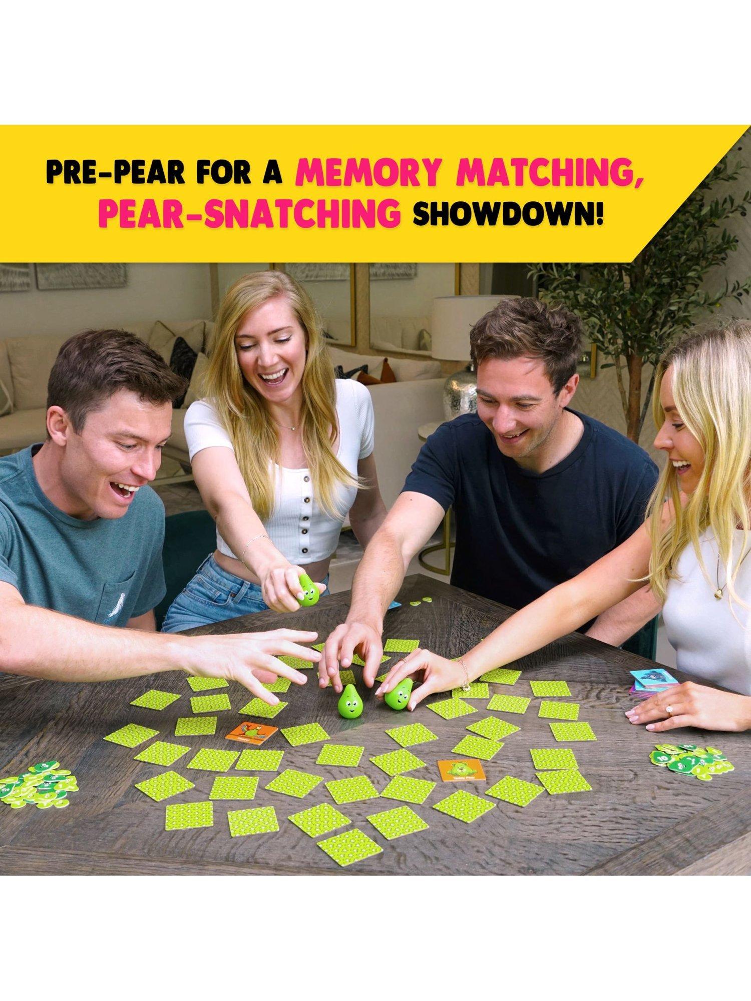 FLIP, MATCH, SNATCH! Flip over cards to find matching pairs and earn points. But watch out! When certain cards are flipped, it's a race to snatch squishy pears for extra points. The player with the most points wins.