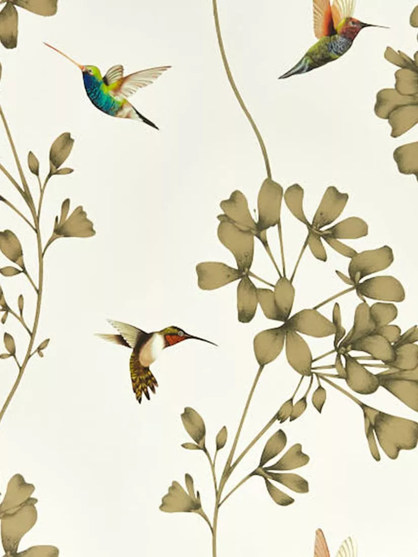 A combination of hand-drawn botanical etchings and hummingbirds adorn this graceful wide-width wallpaper that's available in a range of colourways.