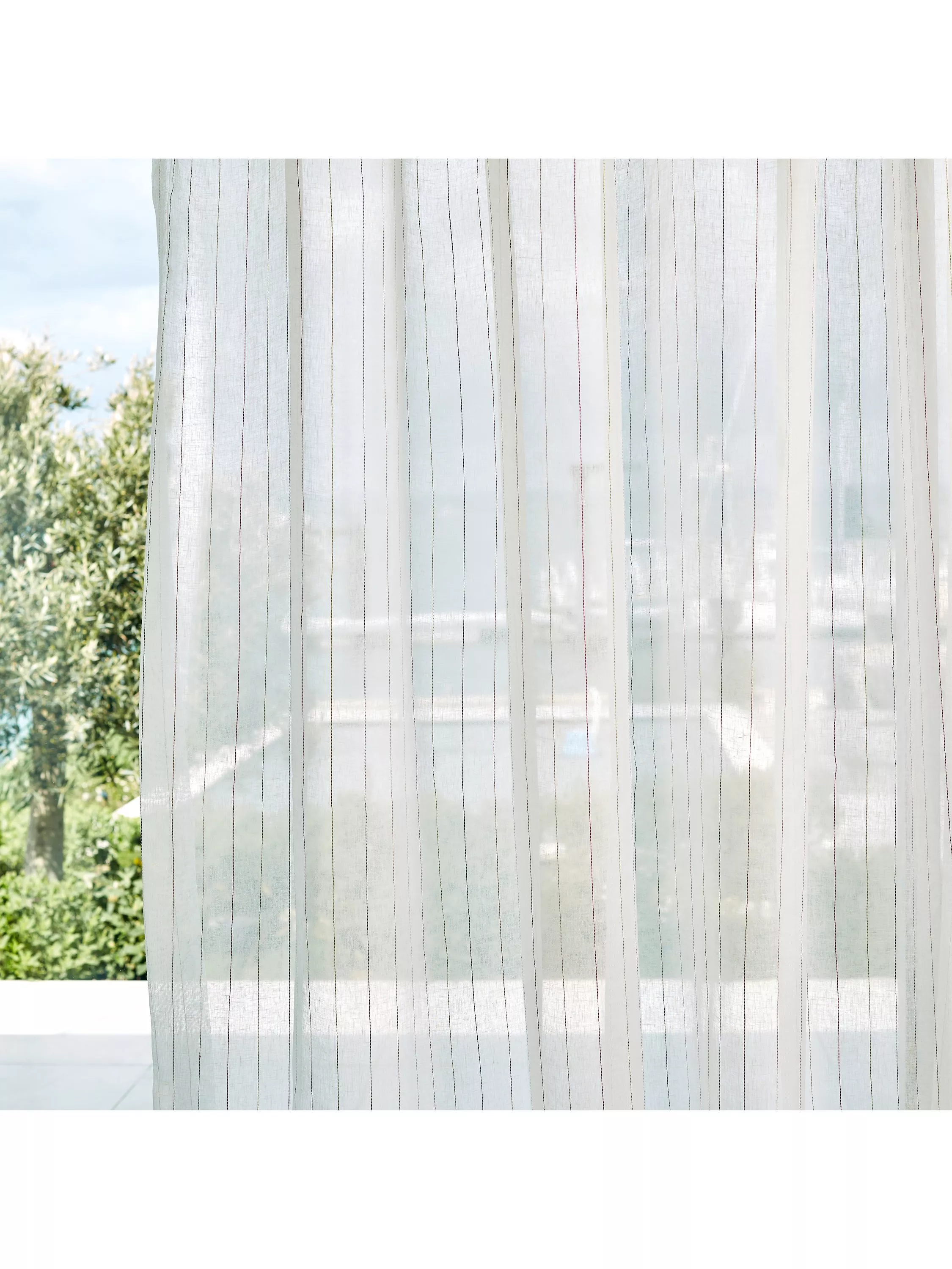 A finely stitched stripe stretches skyward across the plain ground of this wide width sheer, made from 100% linen.
