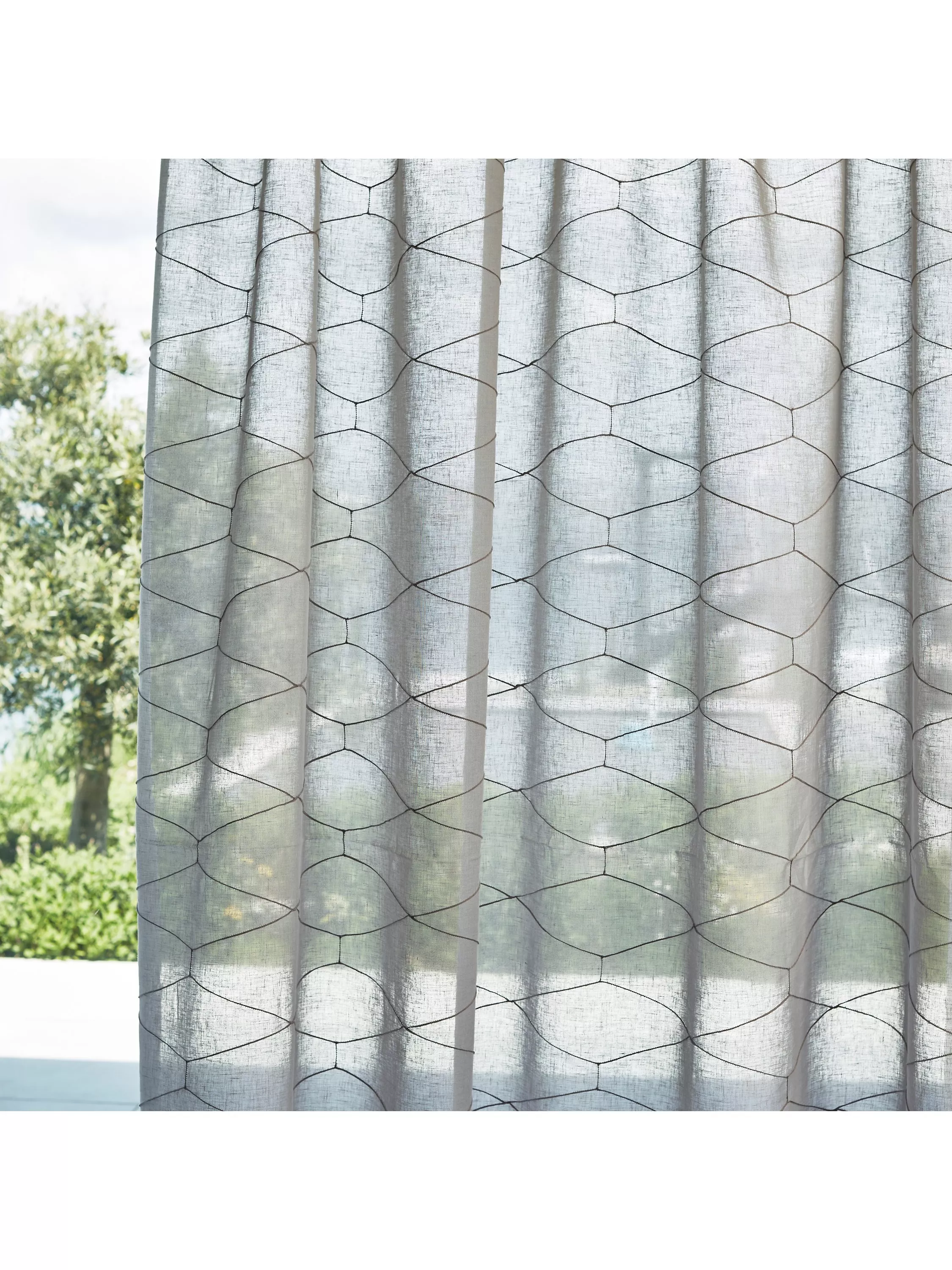 A finely pleated embroidered diamond trellis covers this stylish linen look sheer. With a lovely handle and beautiful drape it's a relaxed elegant choice.