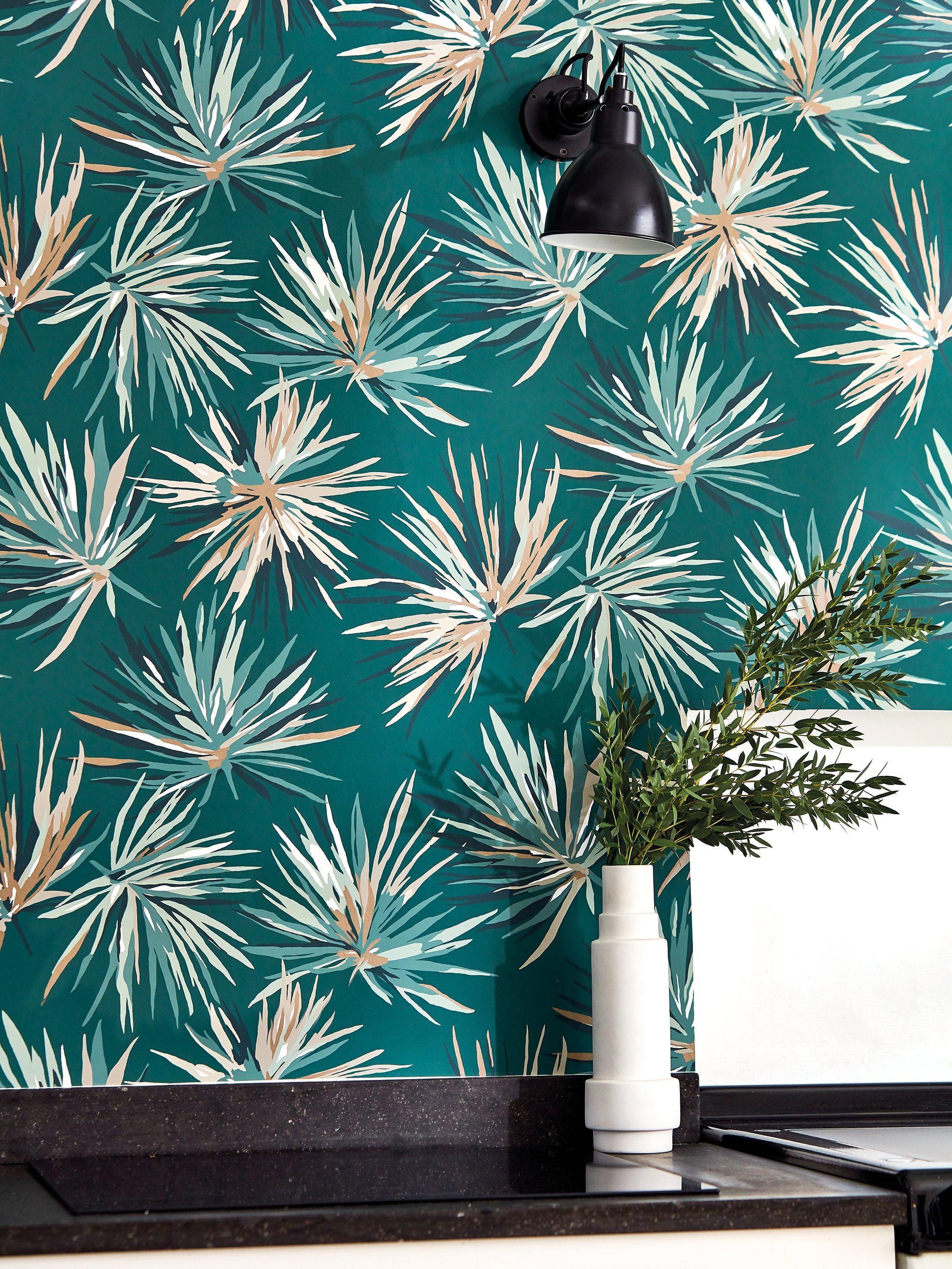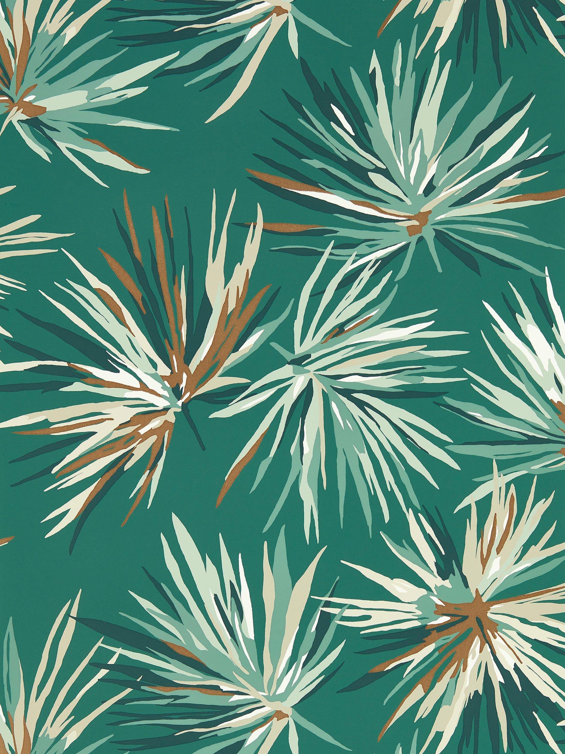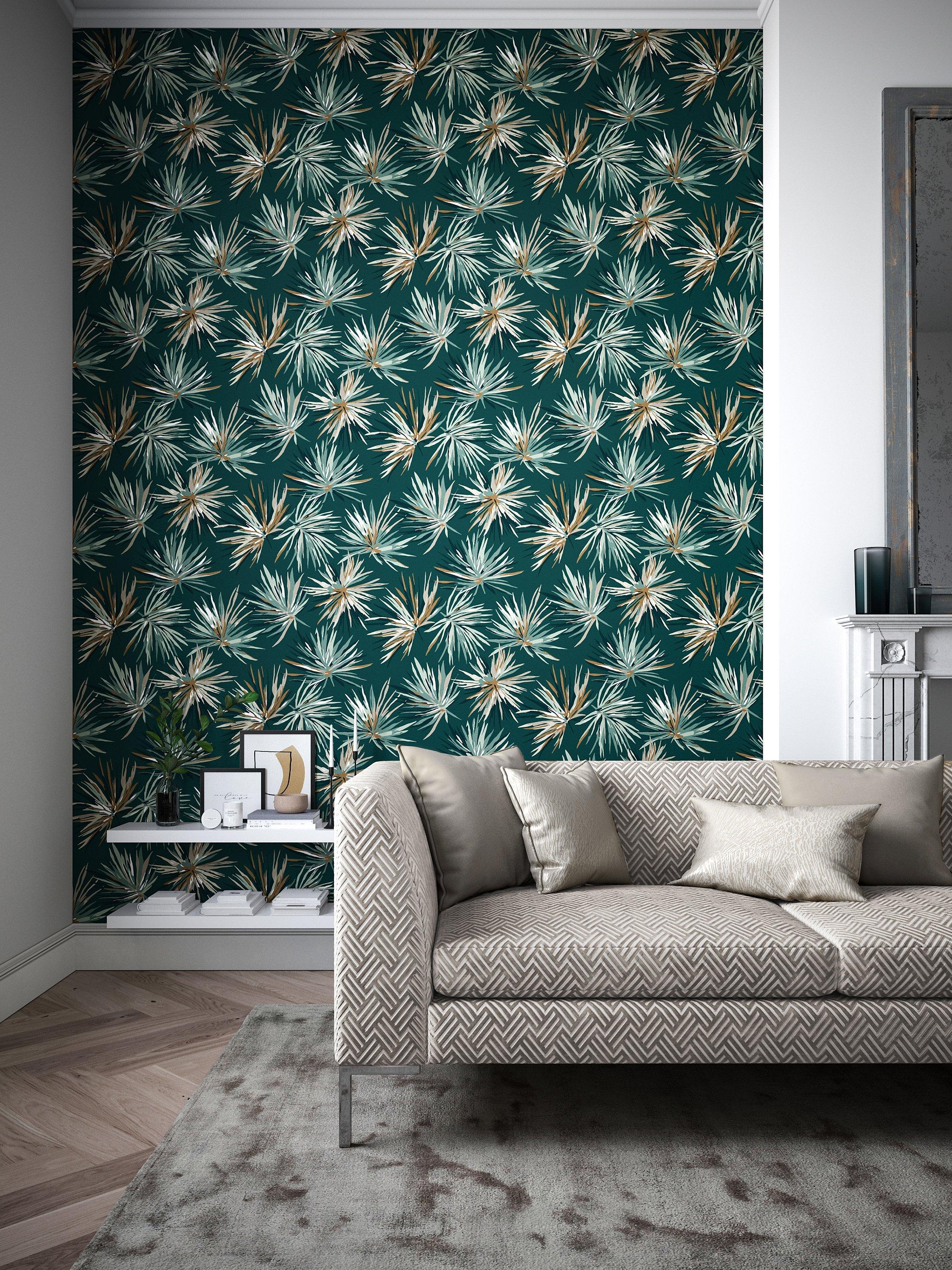 Aucuba is a striking botanical feature wallpaper from Harlequin in a variety of contemporary colourways. Layered leaves are silhouetted against a rich, chalky ground and metallic highlights add an extra glamourous detail.
