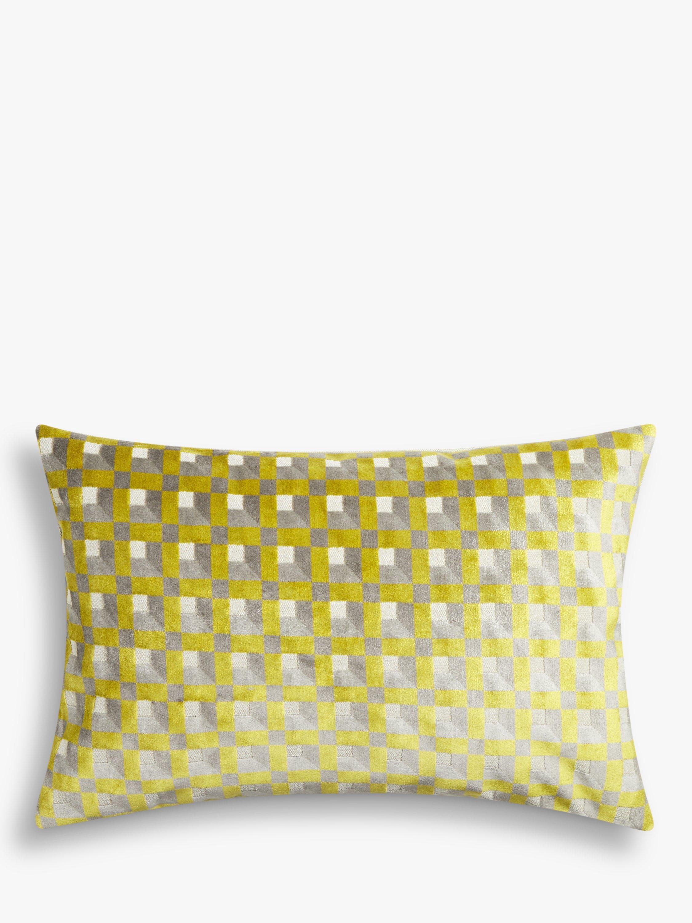 A geometric block design combined with a tactile velvet texture. The back is plain.