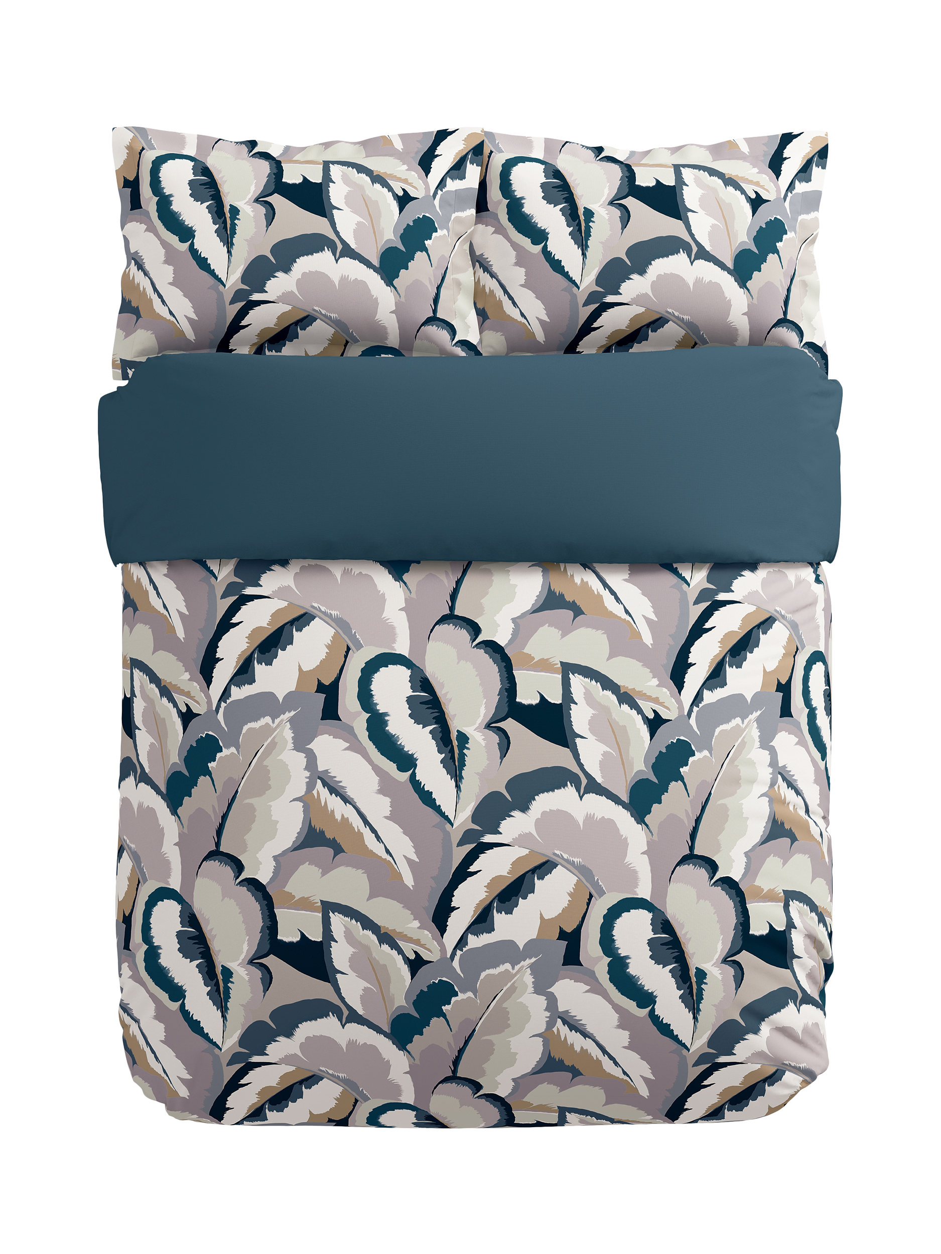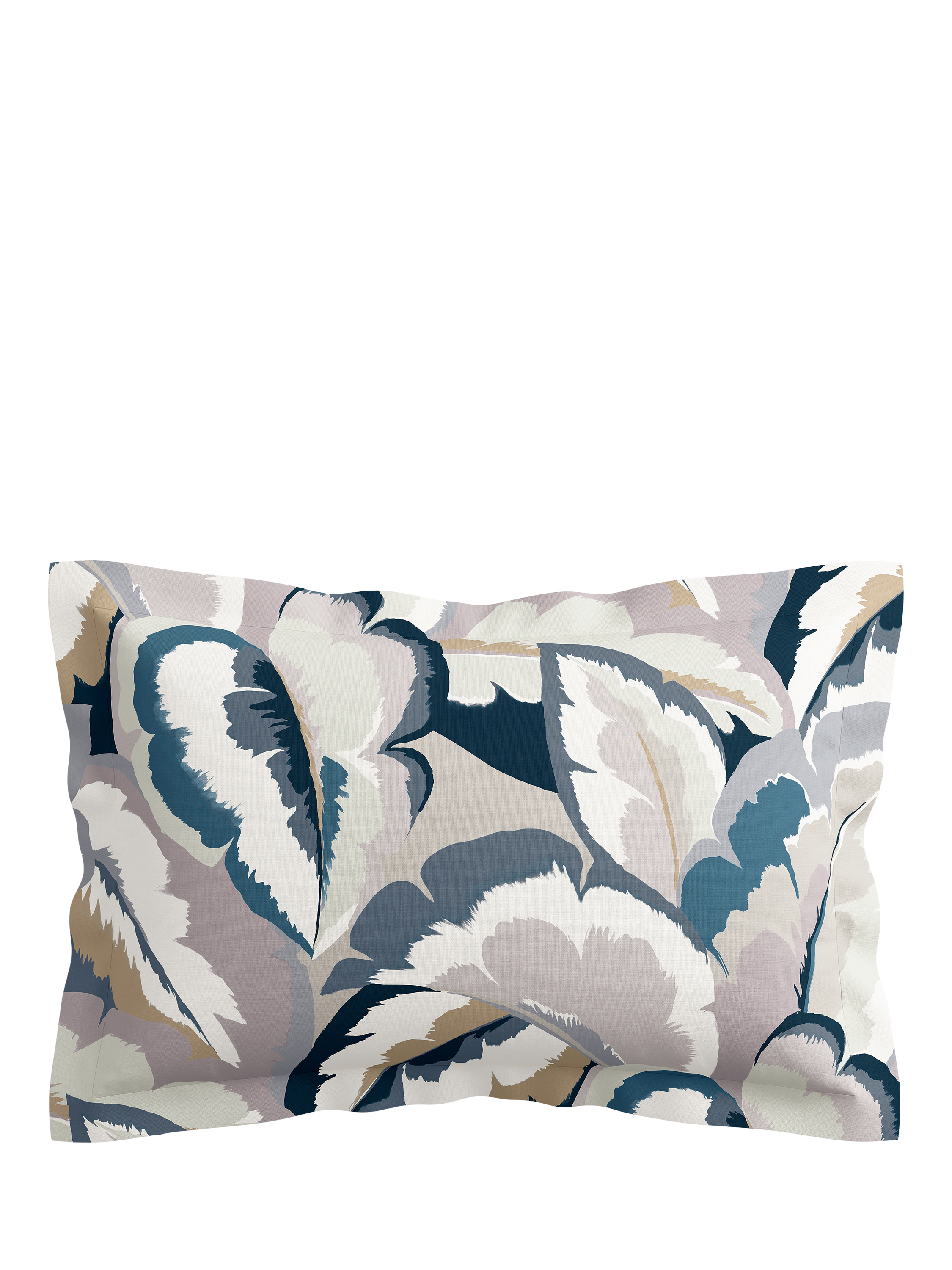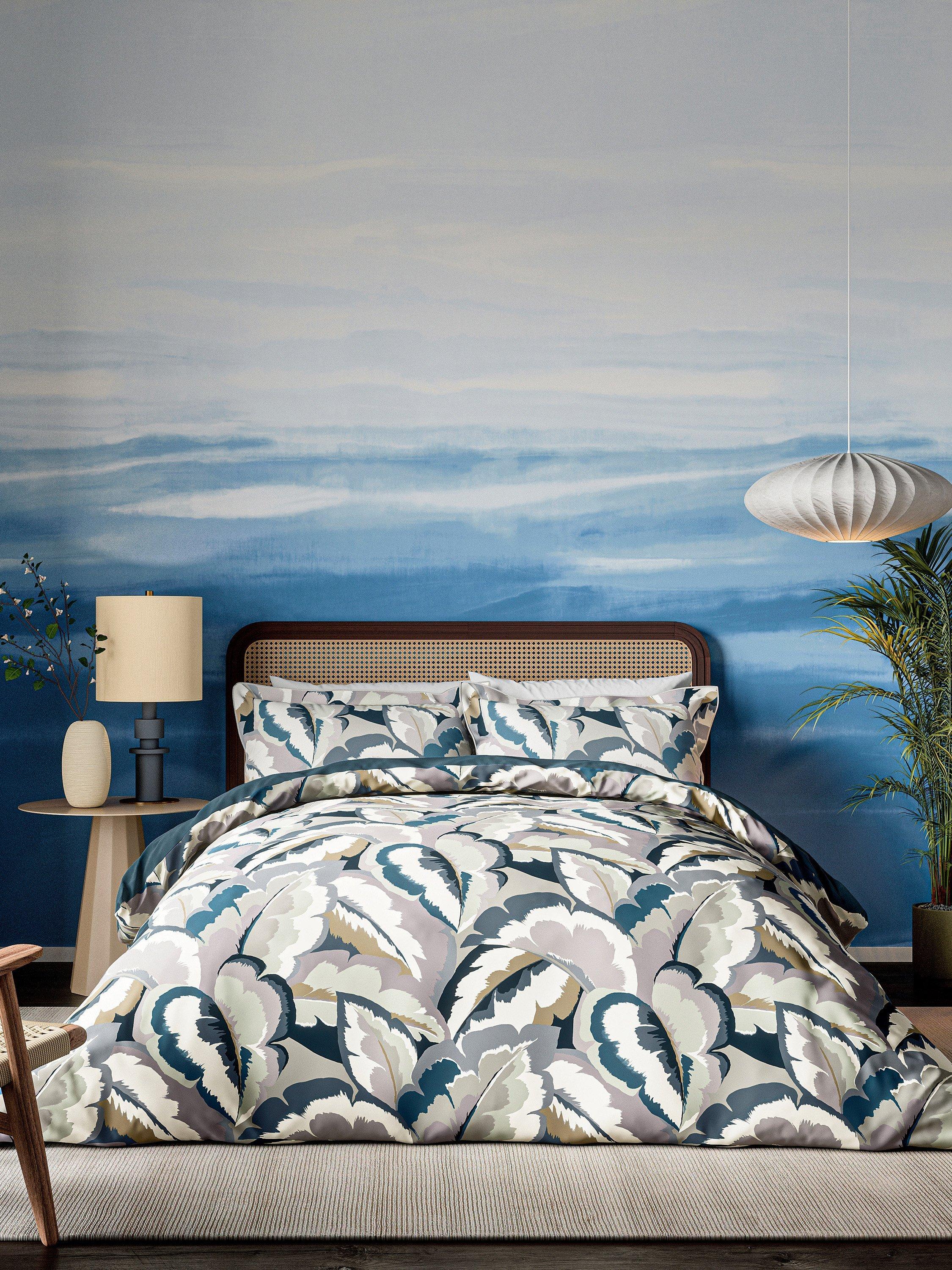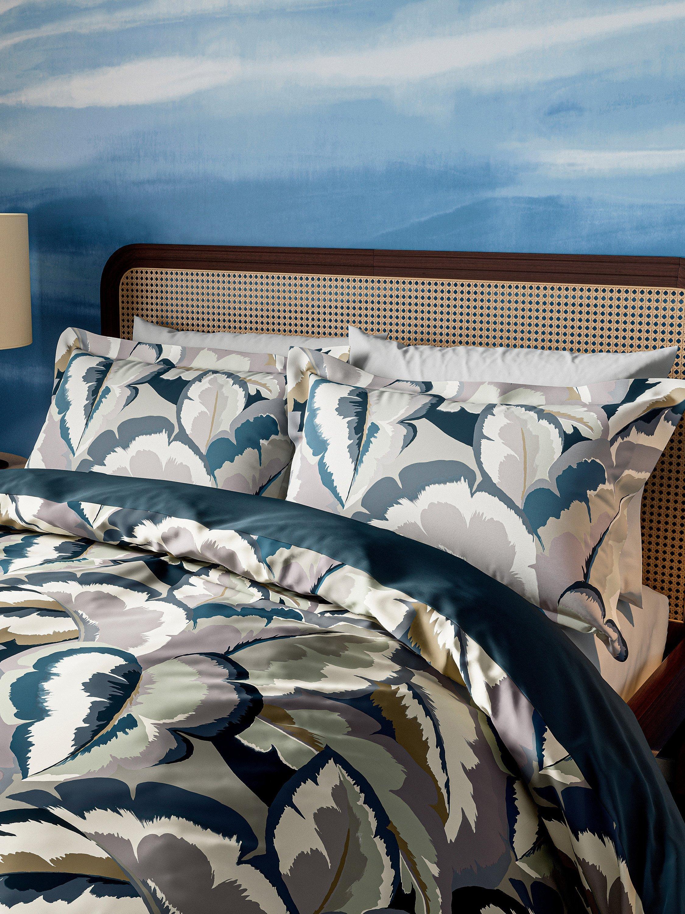 With layers of tonal brush marks and graduated colour, Calathea's overlapping tropical leaves make a bold, large-scale statement in cotton sateen bedding. A hybrid design with fluid painterly edges, this soft, cornflower tone bedding is made from 100% cotton sateen and complemented by a matching pair of Oxford pillowcases.