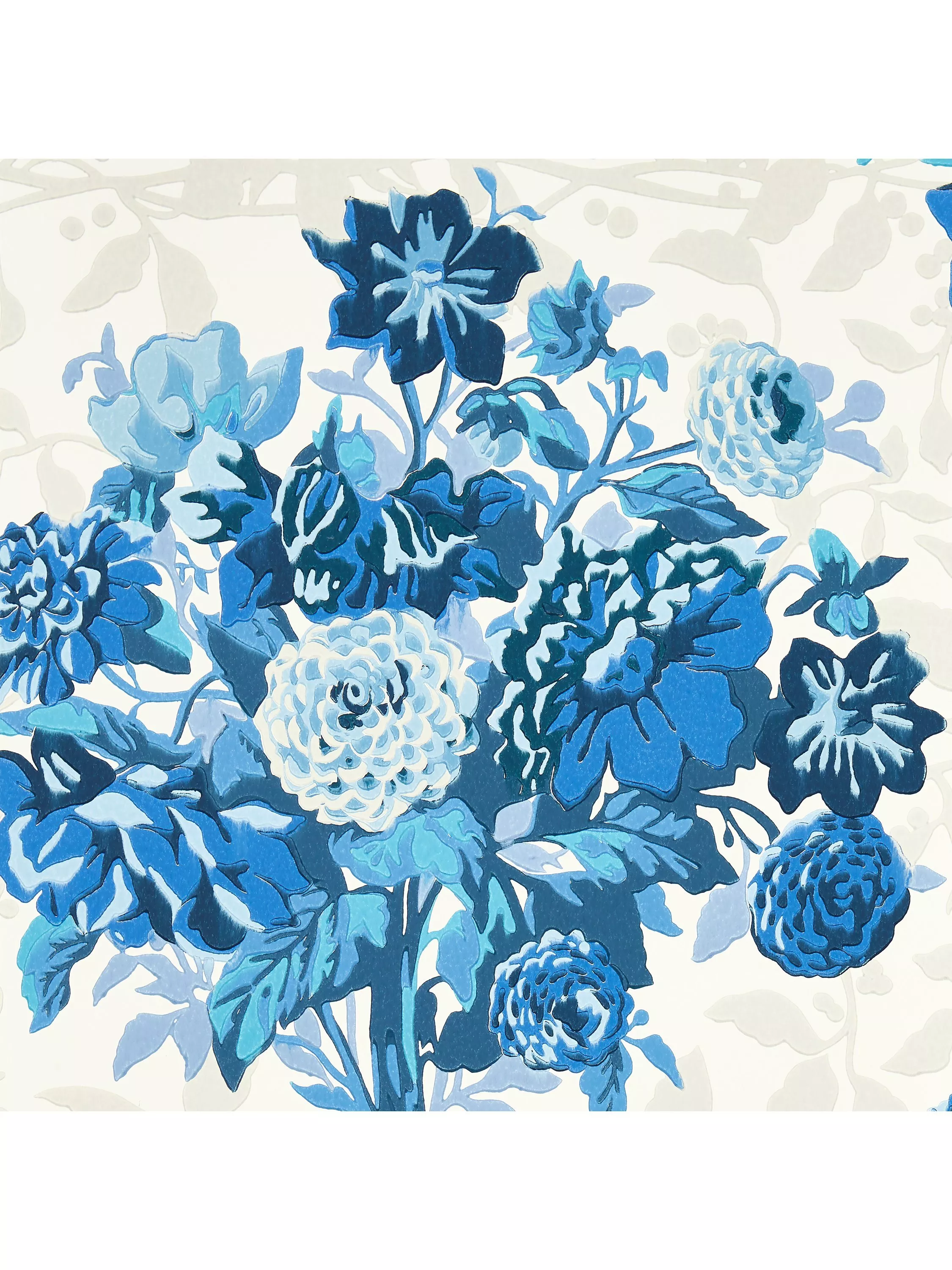 Freshly picked dahlia bouquets stand proudly against a shadowed trellis background. An archived document repainted in the Harlequin studio, its vibrant colourway makes a guaranteed statement.