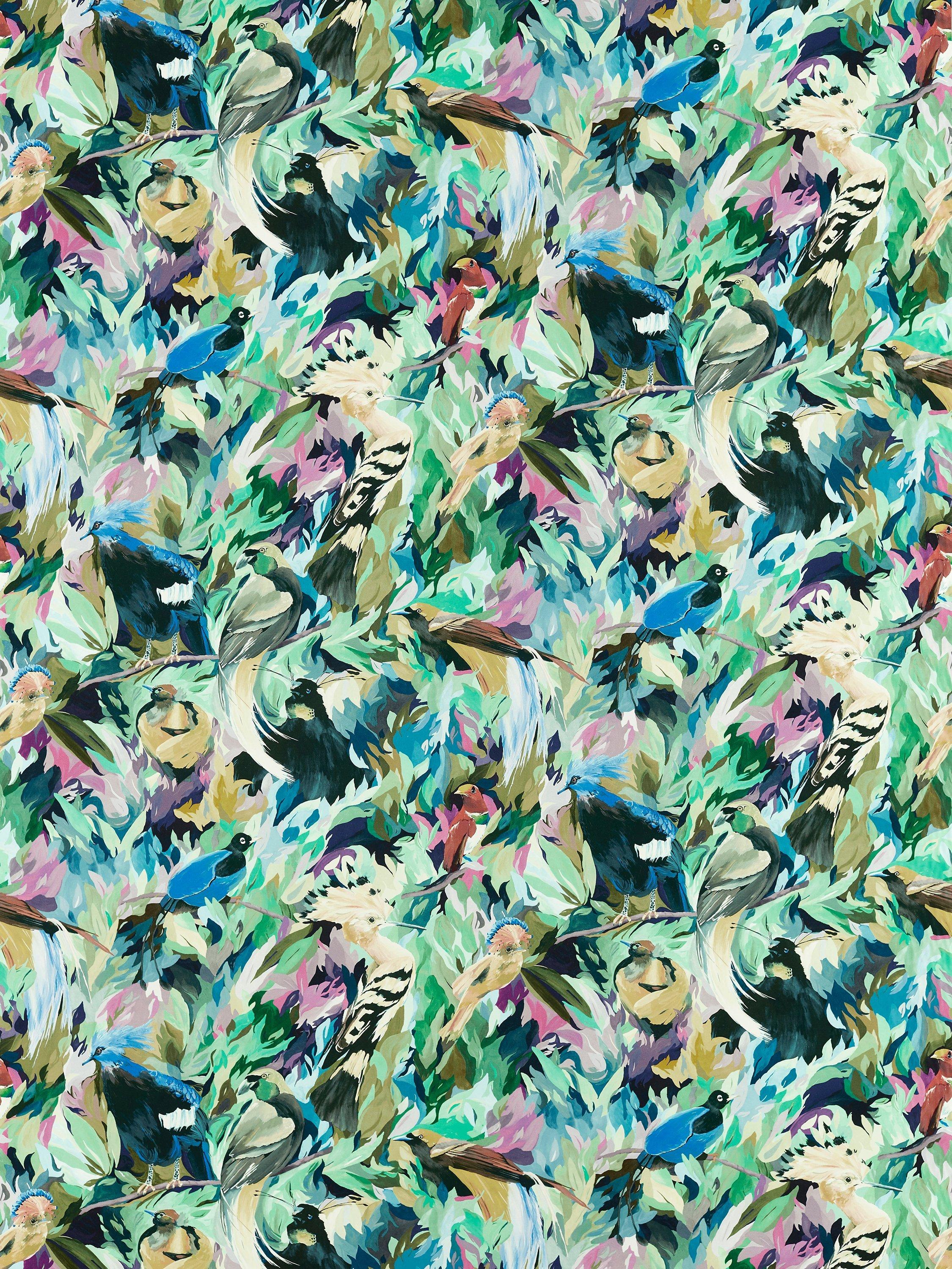 Blink and you'll miss them! Spectacular birds of paradise dance amongst the darkness of their rainforest home on this Harlequin fabric. Look twice - how many incredible plumages and tailfeathers can you spot? Full of movement, yet colourful and camouflaged, this dual-purpose cotton is an absolute showstopper.