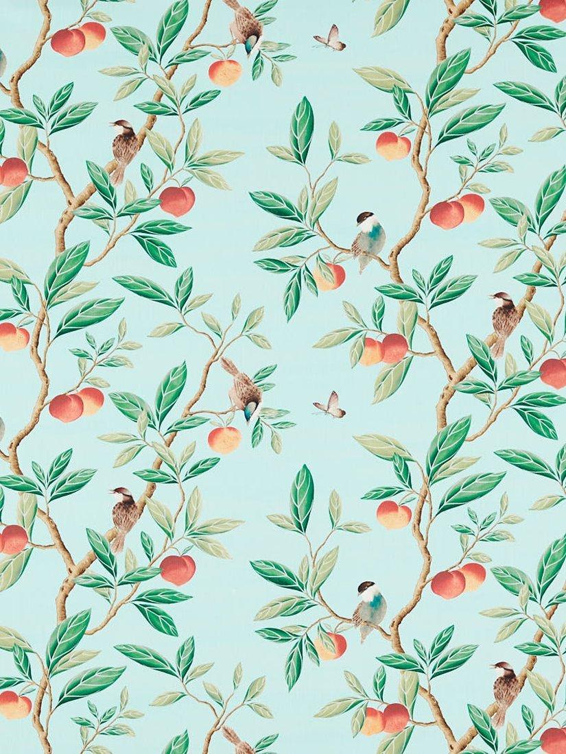 This cotton/linen fabric from Harlequin is a sleek interpretation of an antique chinoiserie wallpaper, depicting stylised birds and ripe fruits. A modern take on a traditional panoramic scene, it's been reinterpreted into a repeating pattern, where less is more. The focus is on the design's almost 3D leaves and hand-brushed wash effect ground that's crafted to look like the sky.