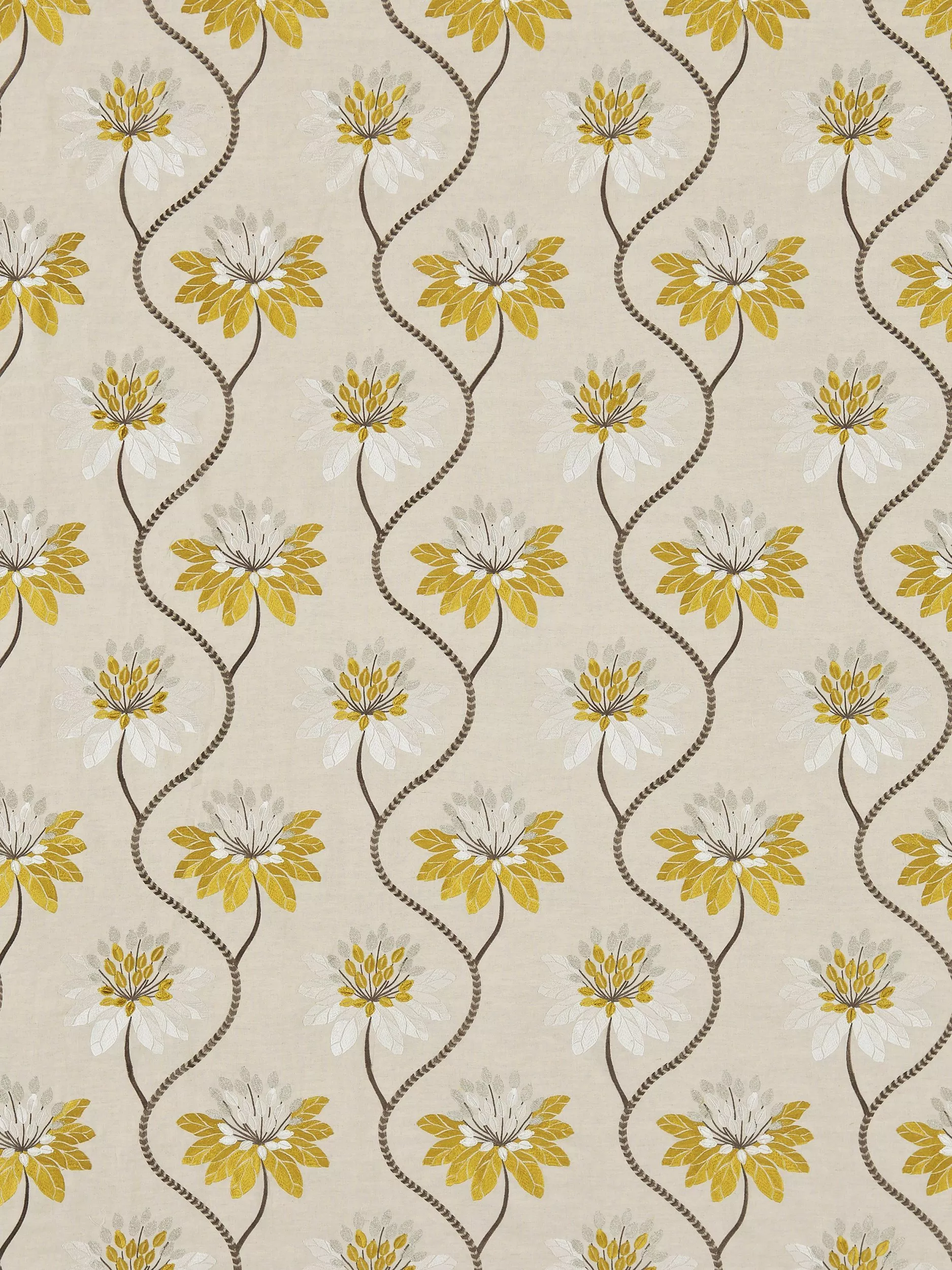 Eloise is a pretty, viscose-blend, floral fabric from Harlequin. Trailing flowerheads are embroidered onto the fabric, then cut by hand to add fray and texture. It also features coloured petals offset with metallic hints.