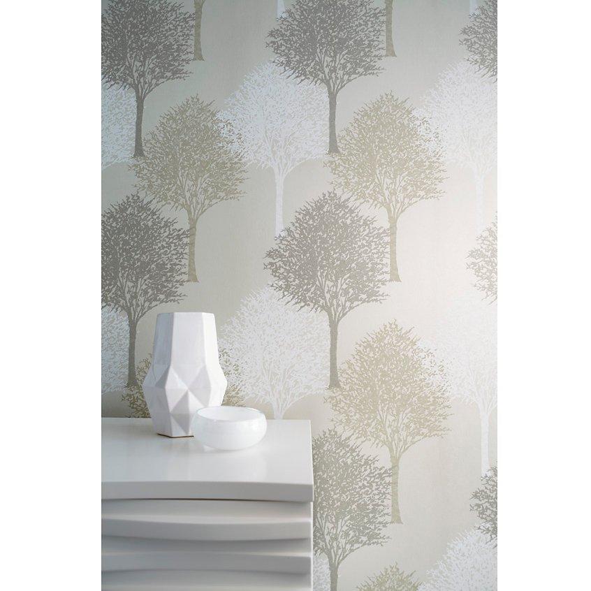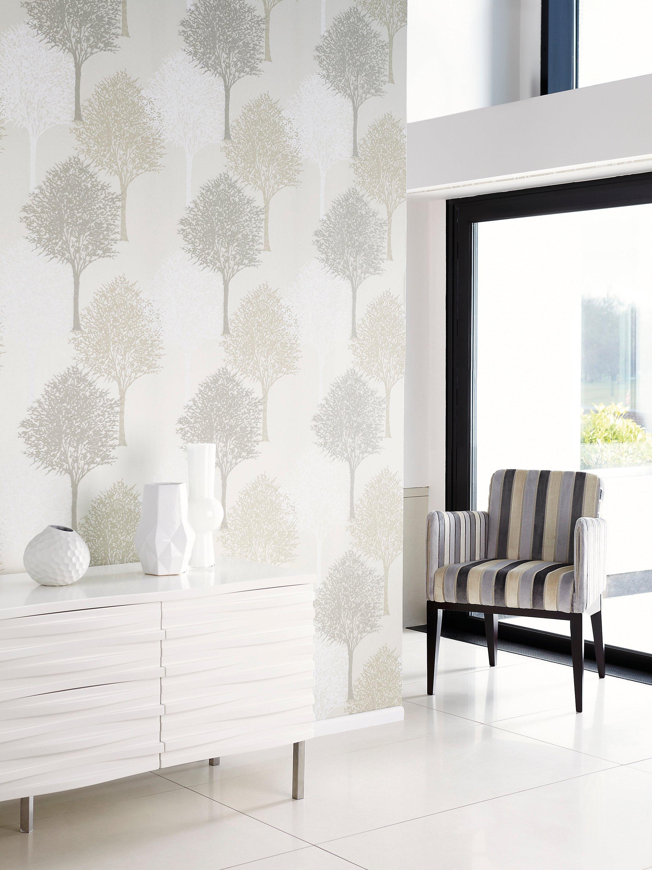 Spongeable wallpaper, decorated with a stunning tree silhouette pattern with sparkling beaded detail.