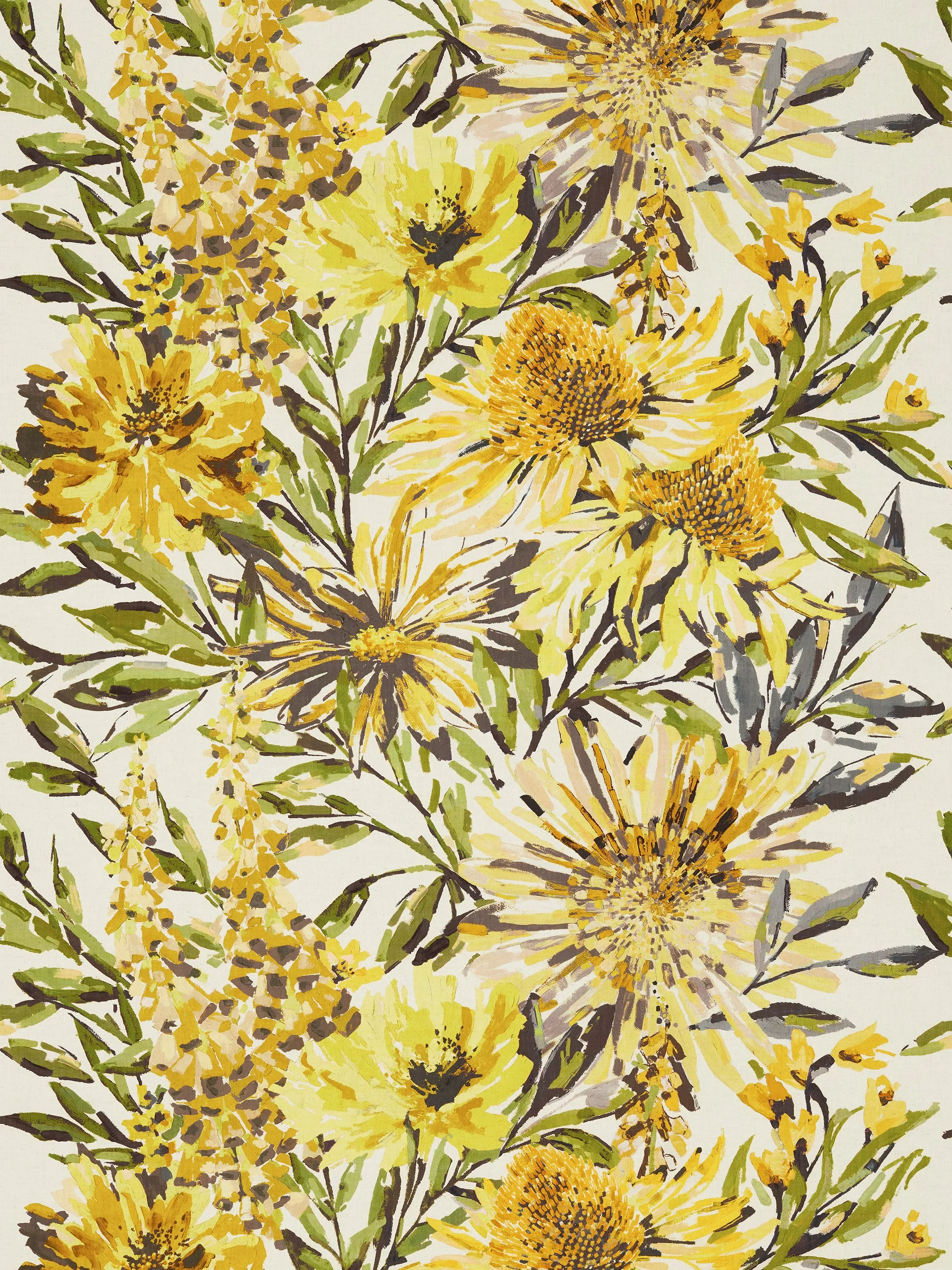 A vivacious floral fabric design digitally printed with overblown peonies, foxgloves and foliage.