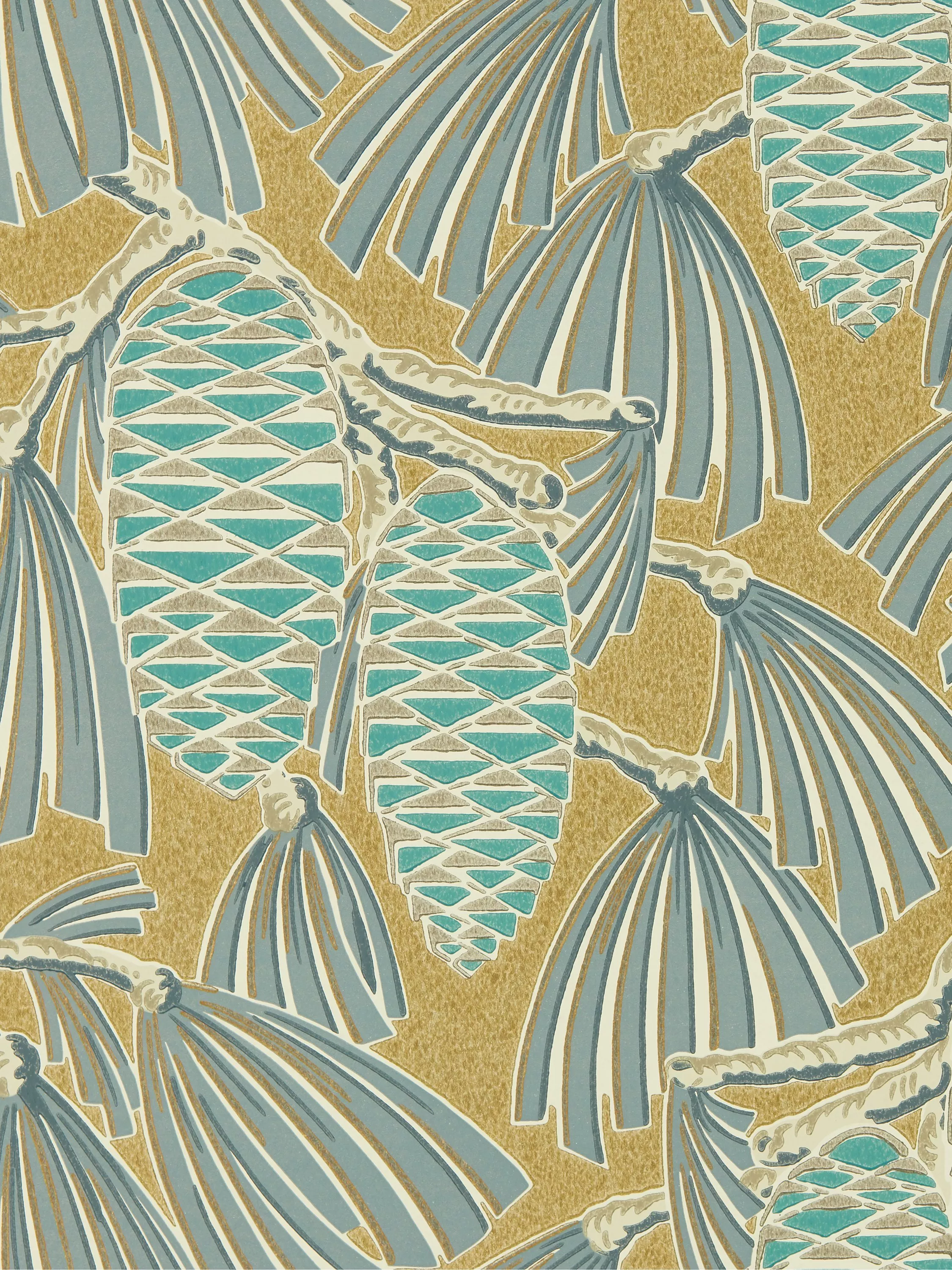 Softly-coloured pine cones share metallic highlights and stylised leaves.