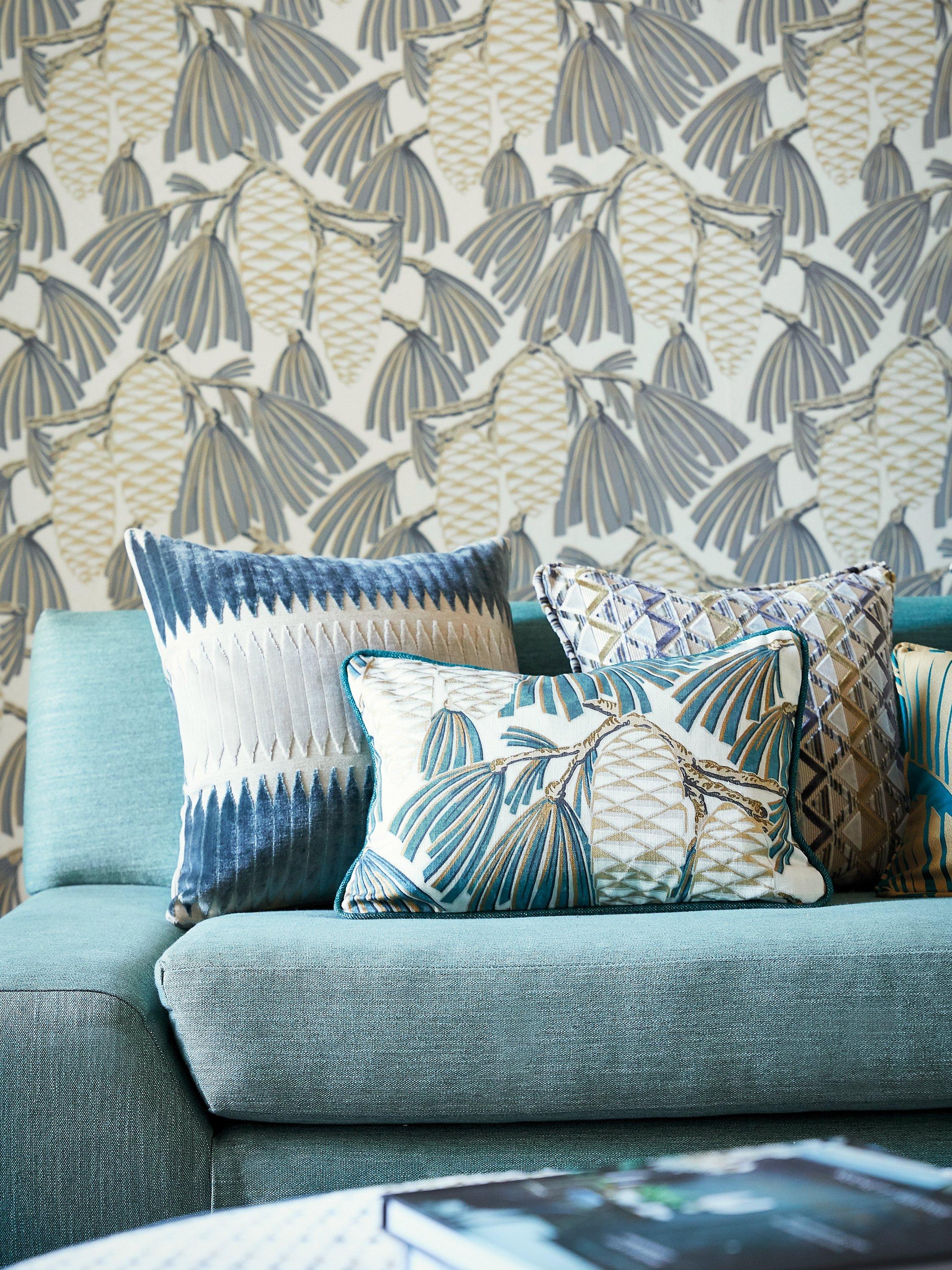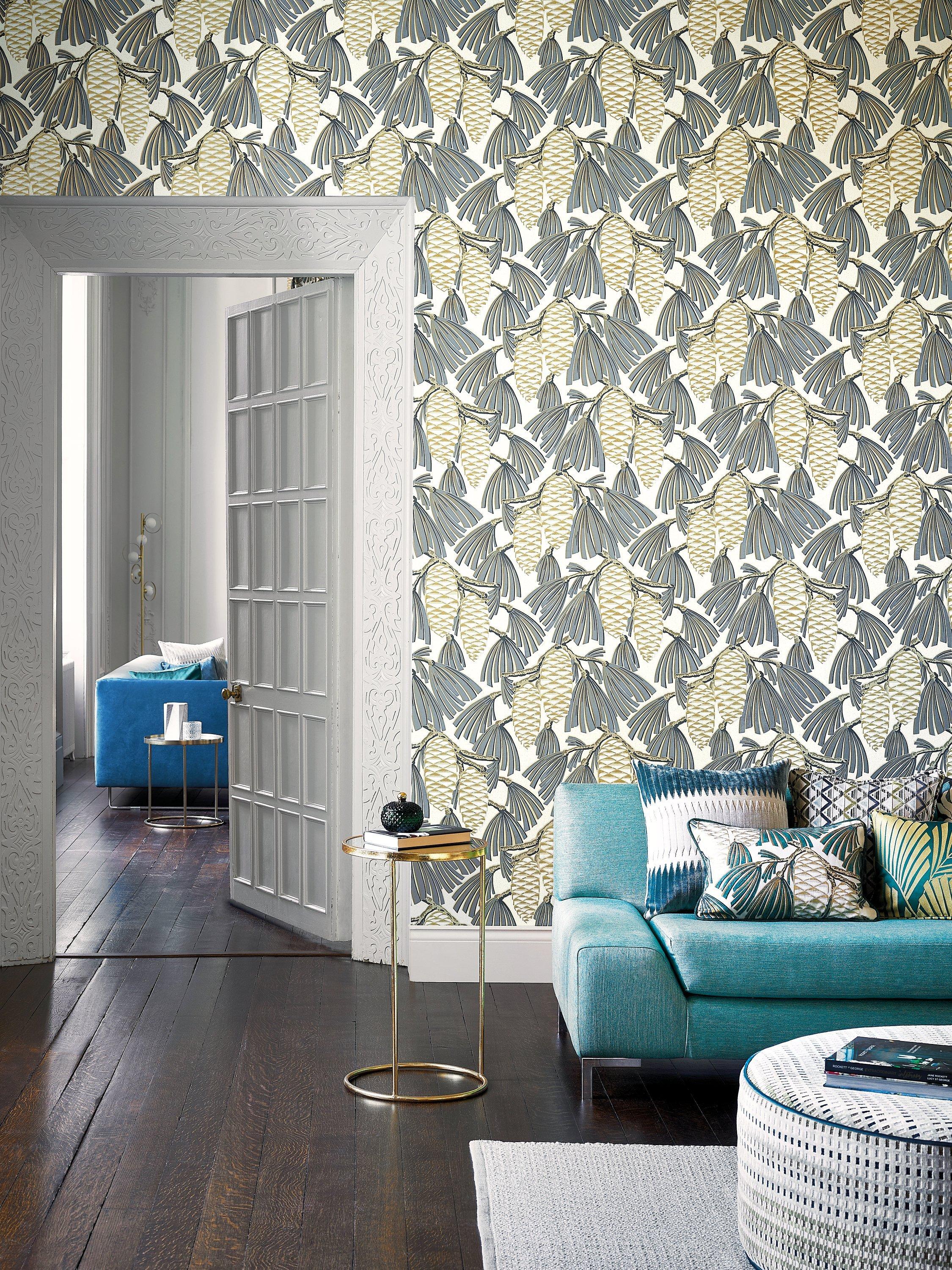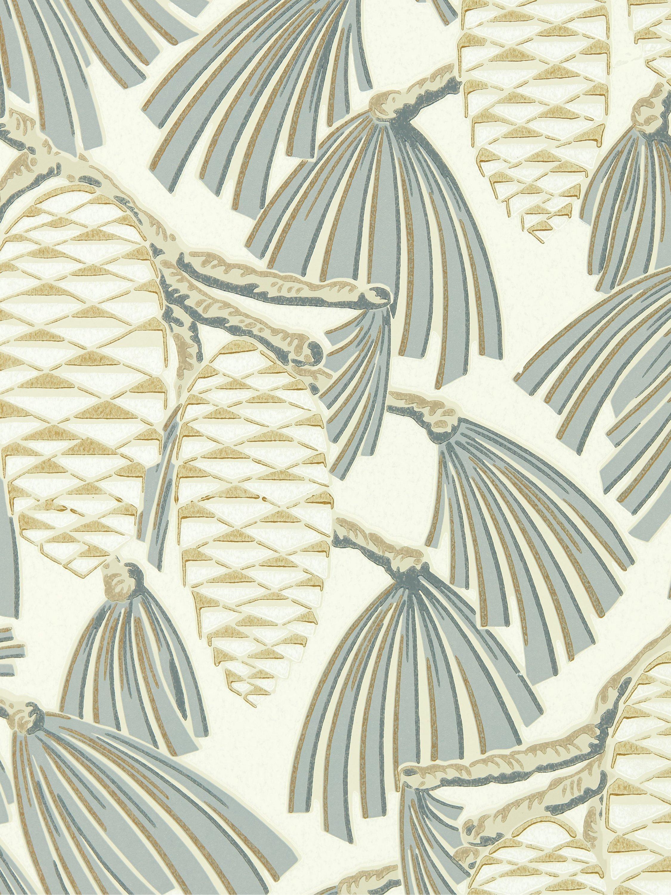 Softly-coloured pine cones share metallic highlights and stylised leaves.