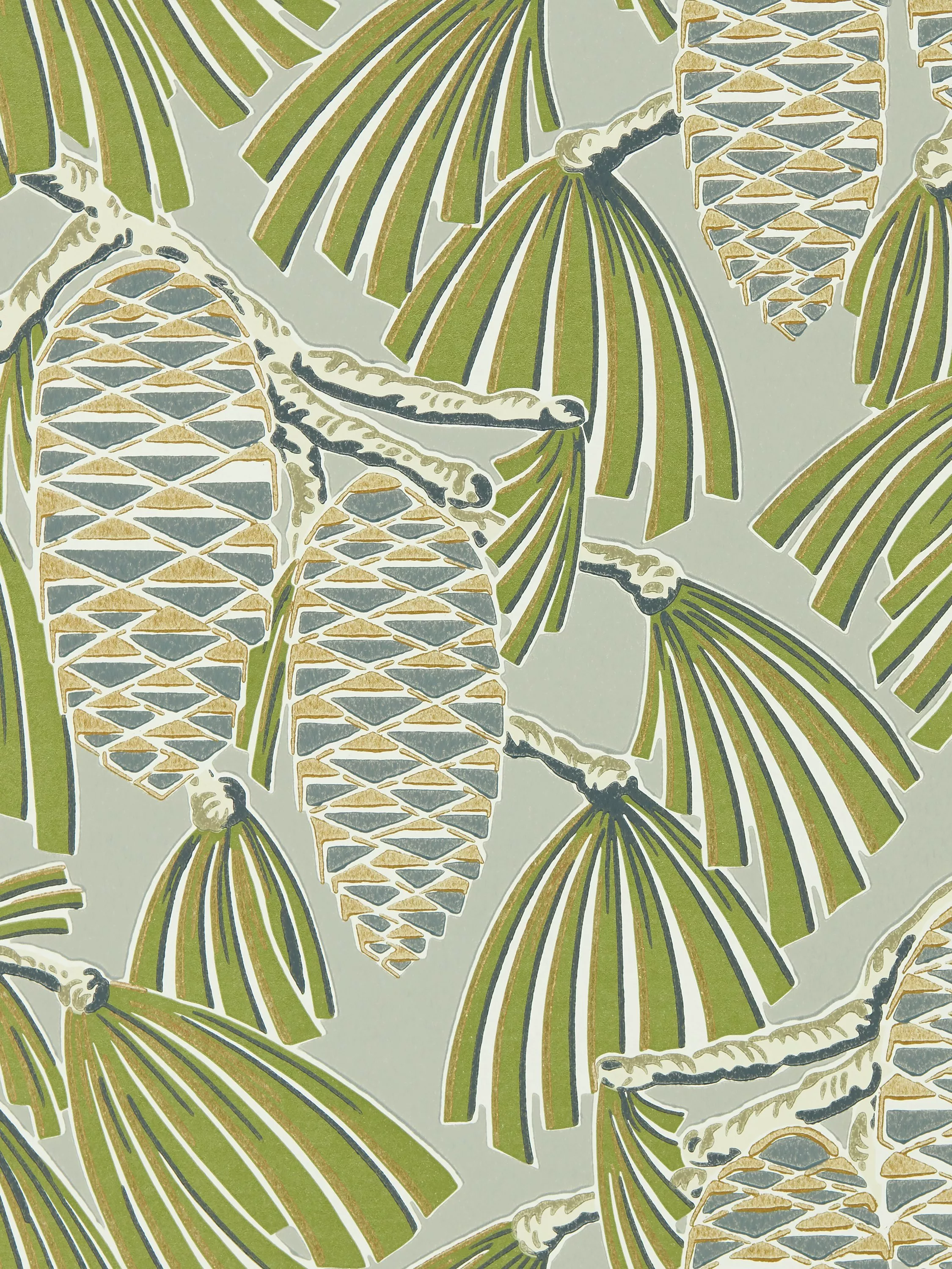 Softly-coloured pine cones share metallic highlights and stylised leaves.