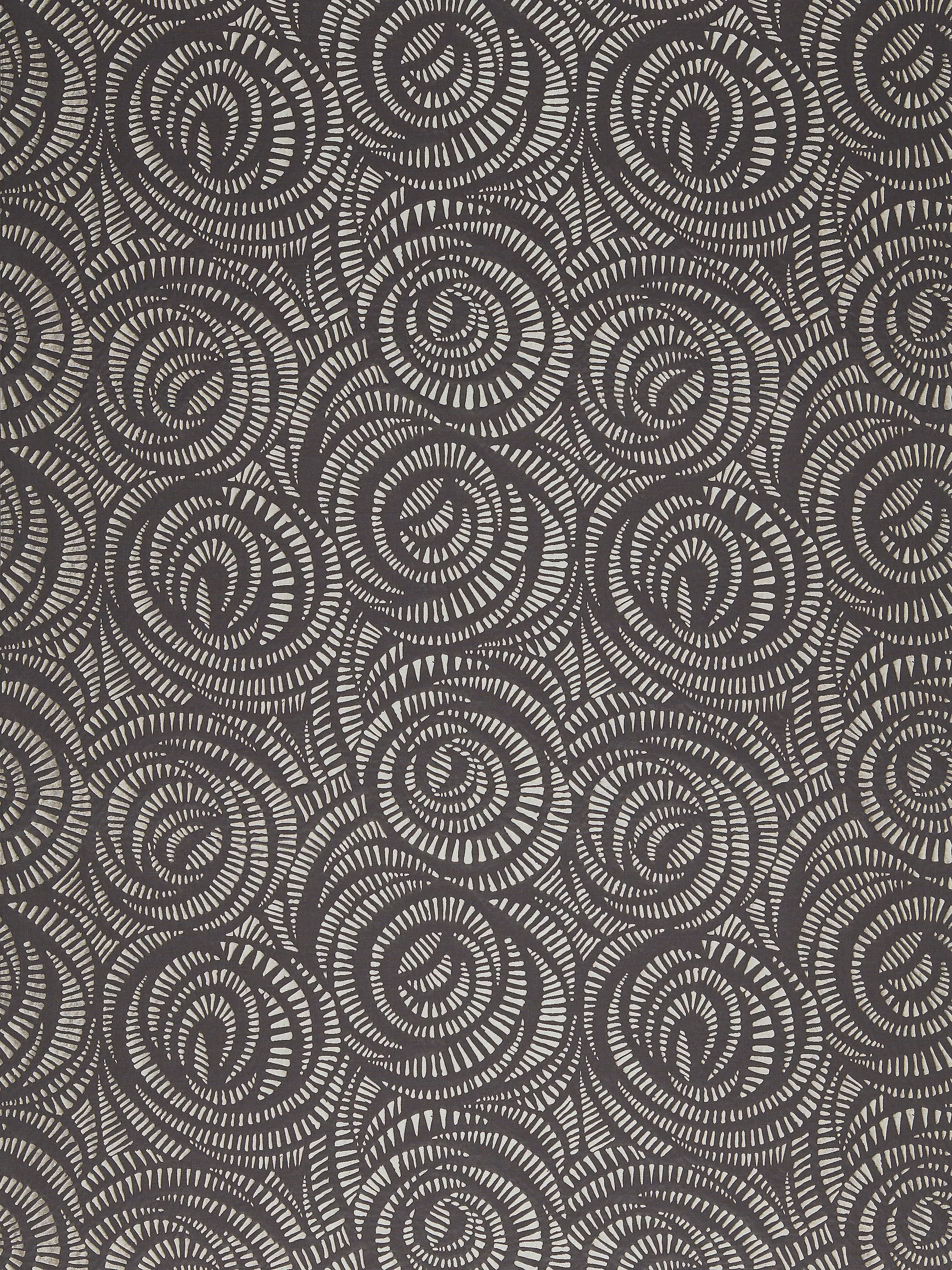 A dramatic fabric featuring a spiral, fossil-like motif woven on a textured background for a sophisticated finish.