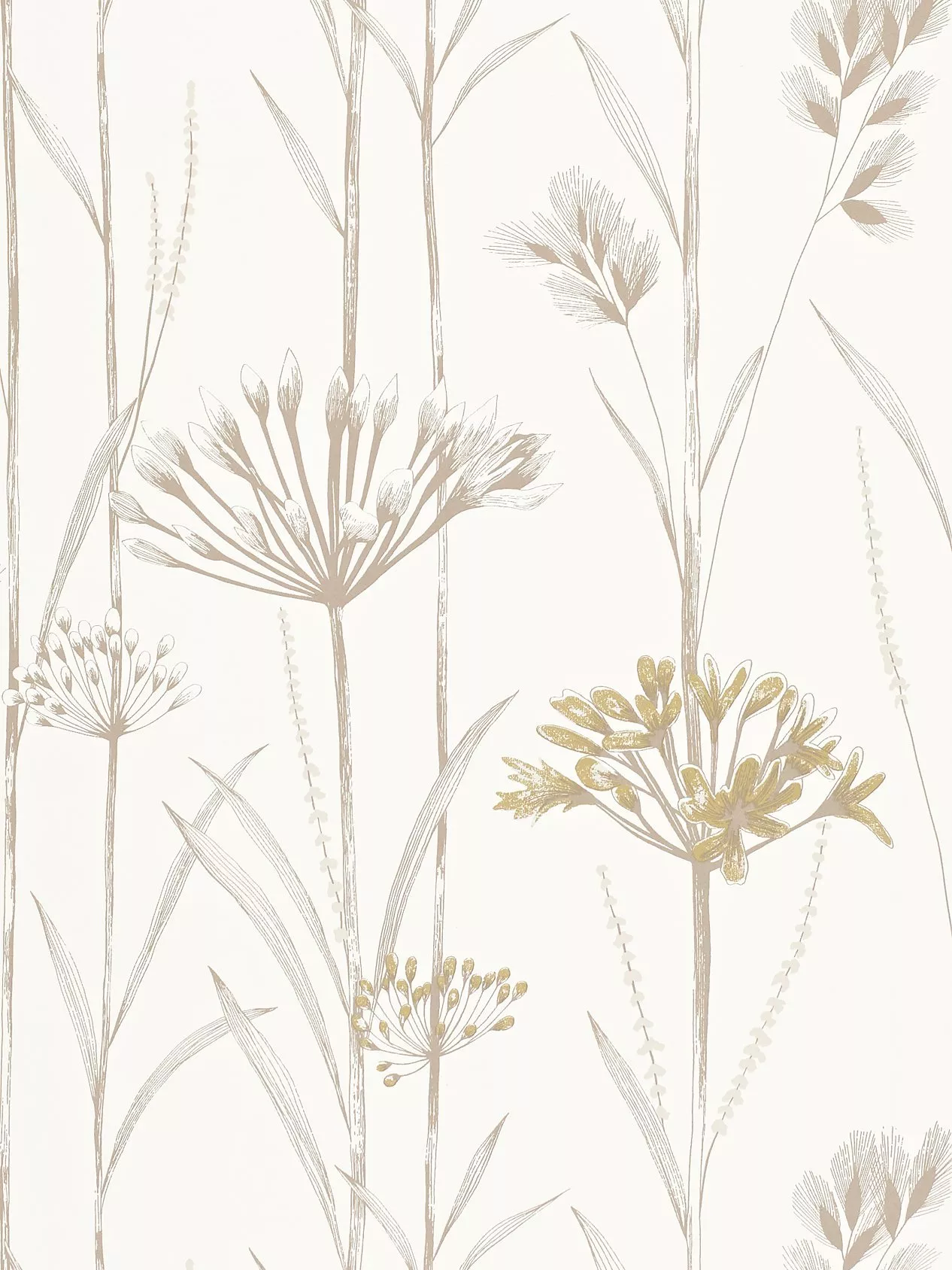 A beautiful wallpaper depicting seed heads and grasses, embellished with layered printed effects and flashes of metallic.