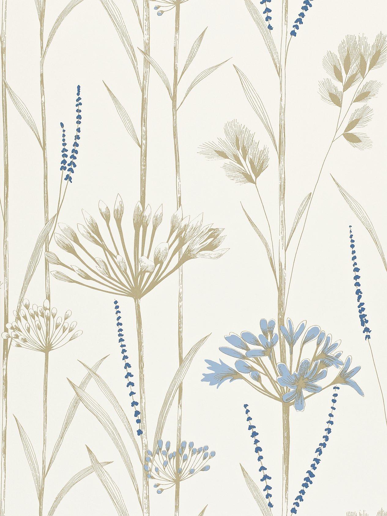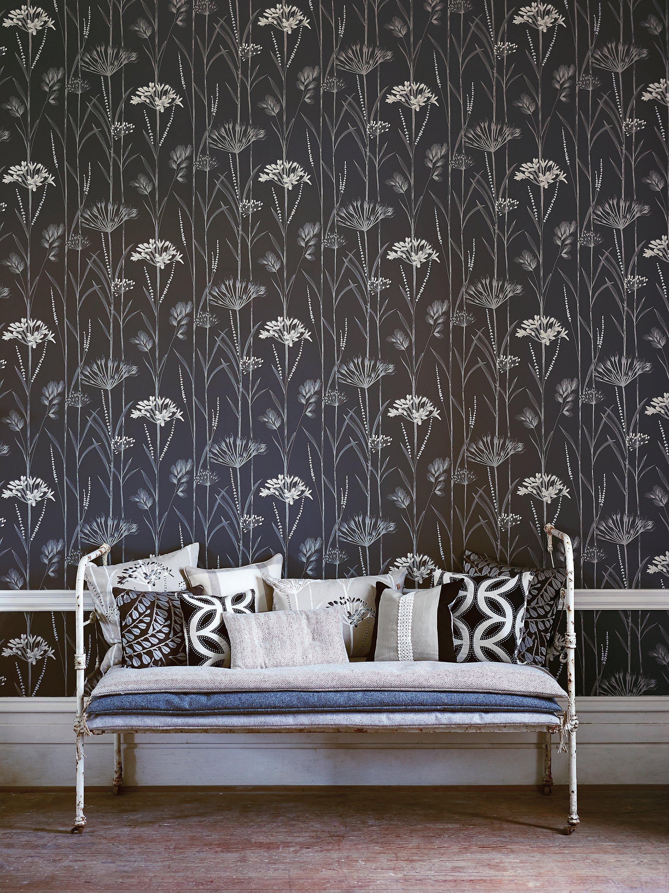 A beautiful wallpaper depicting seed heads and grasses, embellished with layered printed effects and flashes of metallic.