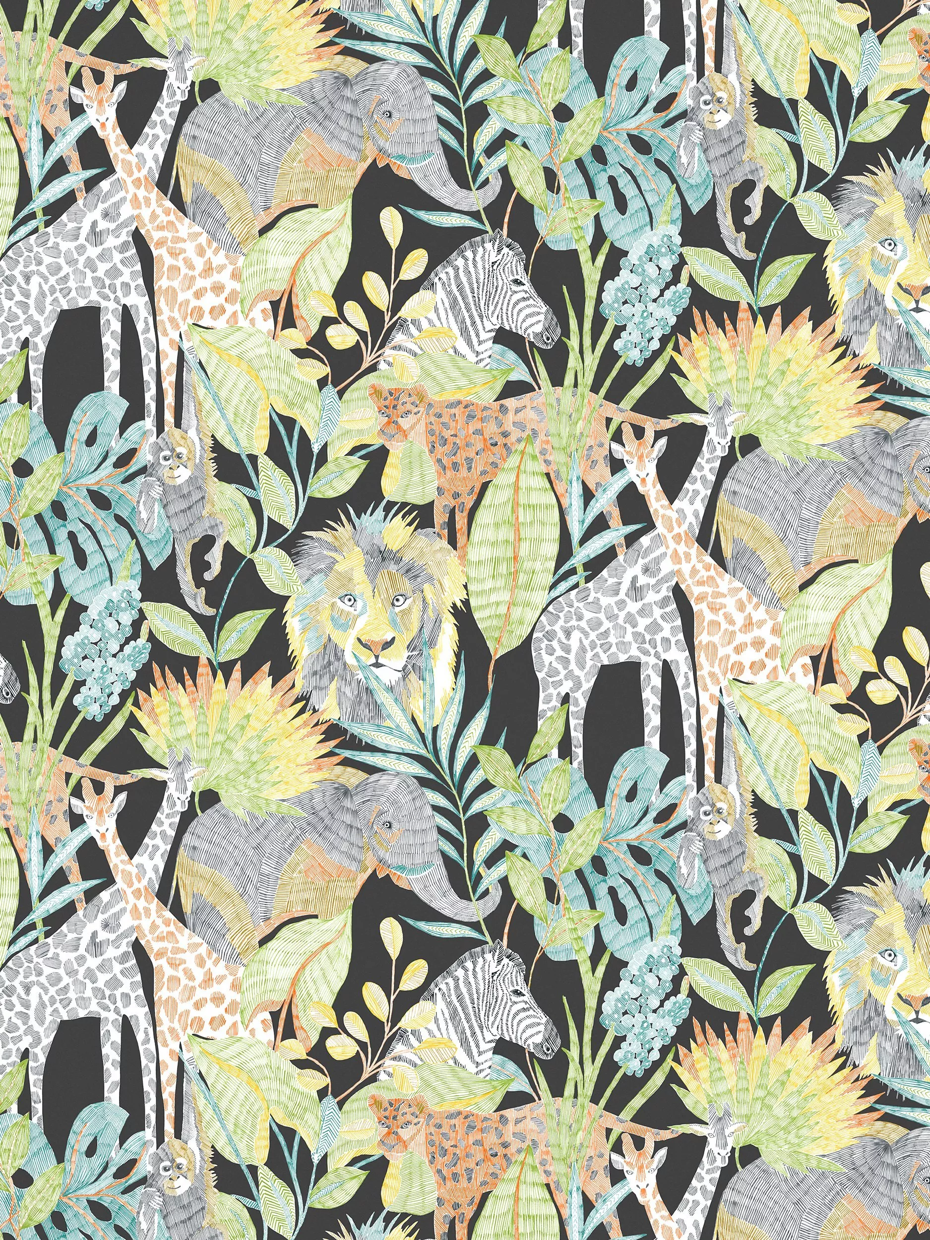 Journey through this midnight jungle of acacia leaves and tall trees in search of friendly giraffes, proud lions, striped zebras and majestic elephants. Hand drawn with felt tip, this chalkboard-inspired design is truly stunning.