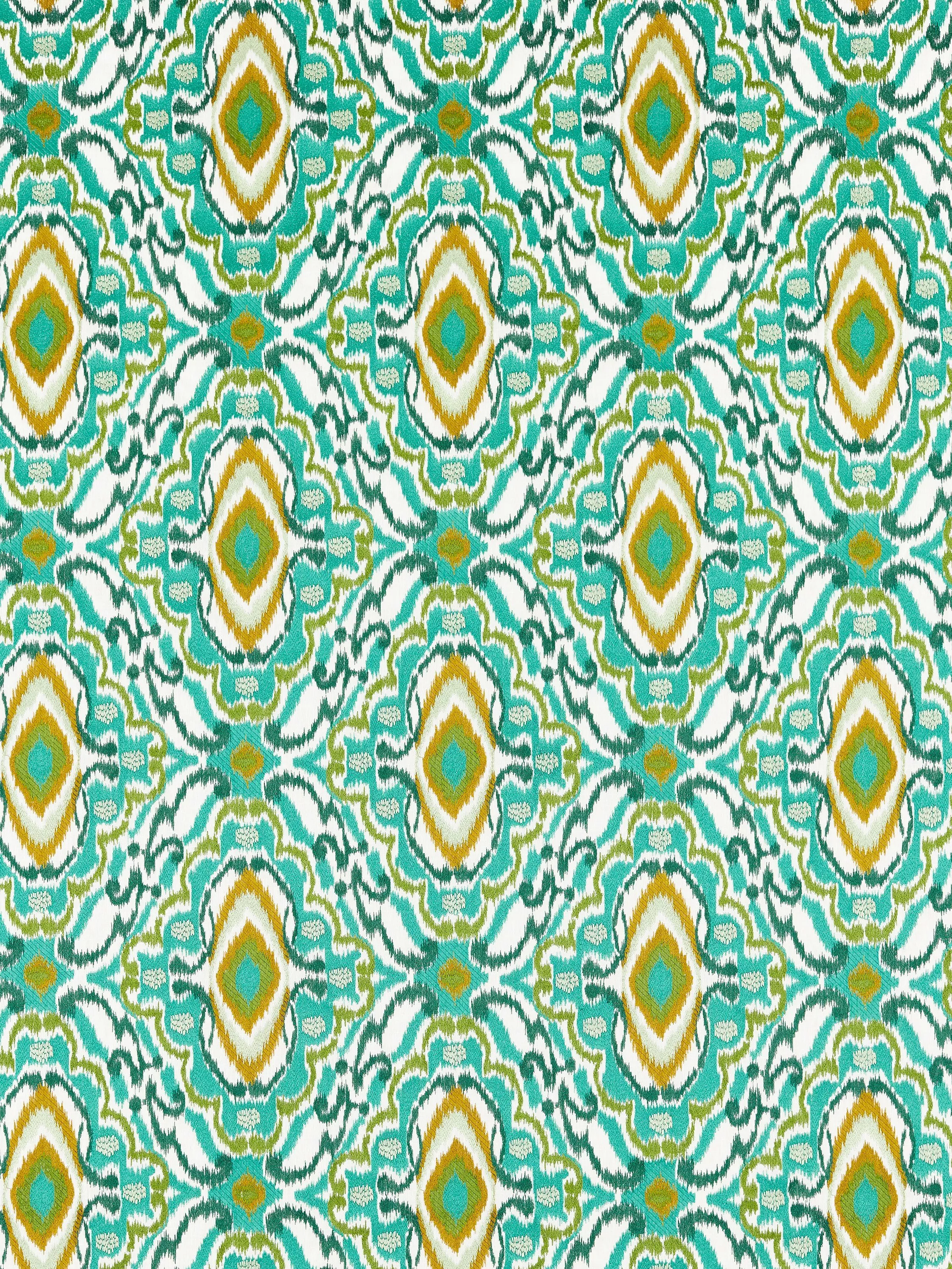 Harlequin's Ixora fabric is an ikat-edged Persian-inspired embroidery with layered stitching and joyous colours in a damask style design.