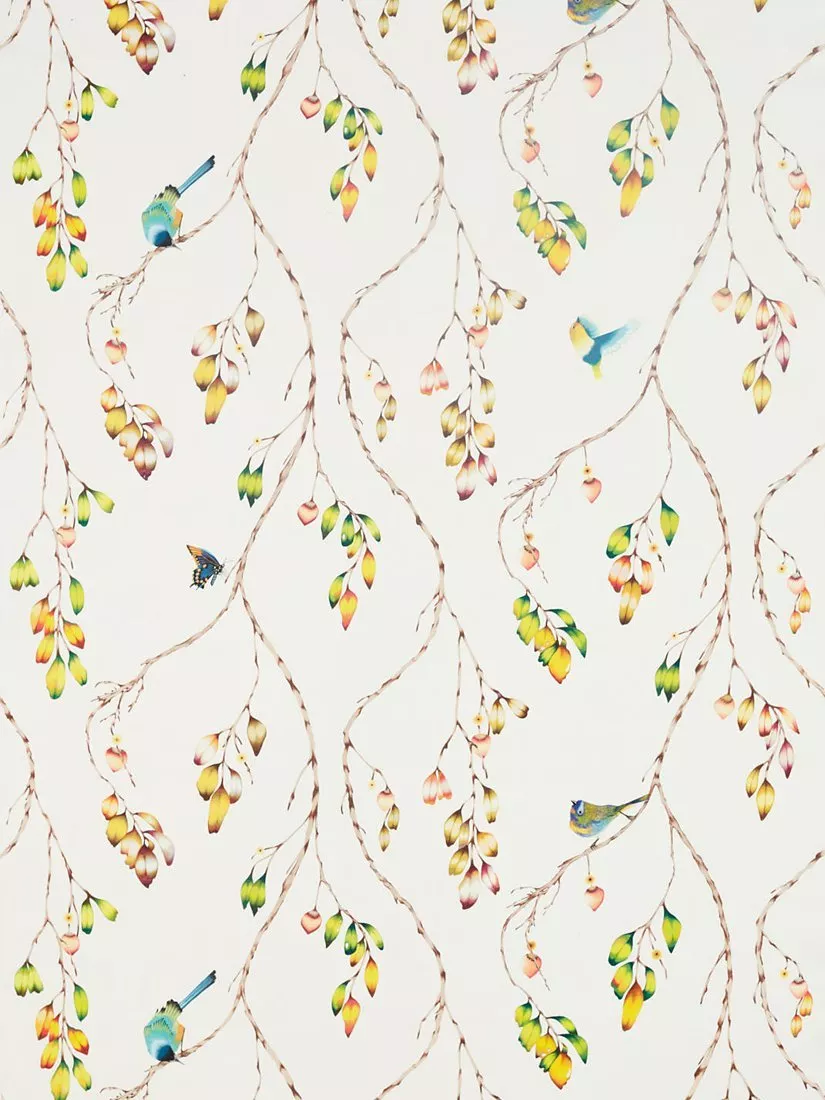 Iyanu is a diaphanous voile fabric that features carefully etched butterflies and birds perching on willow-like branches.