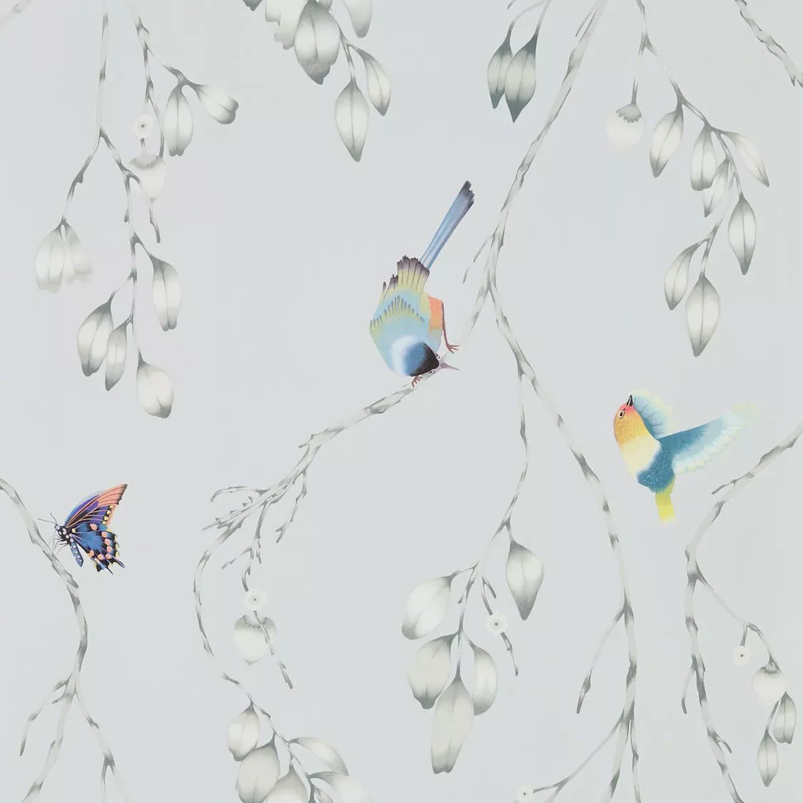A bird trail, featuring butterflies and birds perching on willow-like branches.