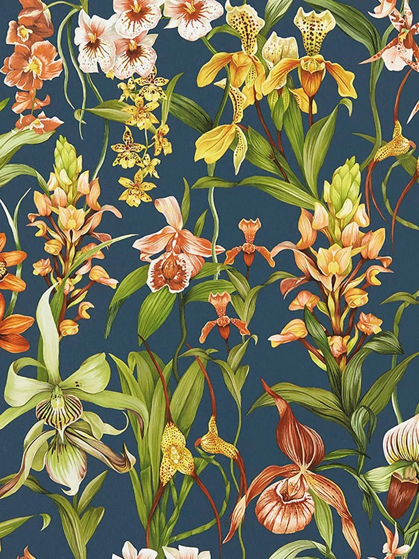 Harlequin's take on a botanical drawing, a bouquet of finely illustrated wild orchids creates this tranquil scene. Vibrant colours with a contrast ground, making petals pop.