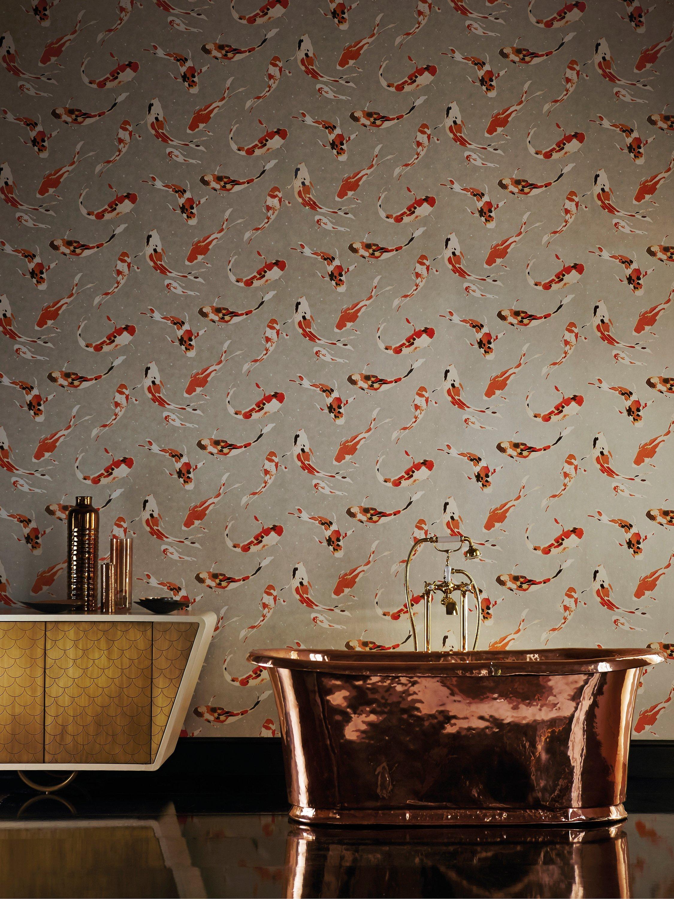 Capture the serenity of the aquatic with this painterly wallpaper, as delicately rendered Koi fish swim across its surface.