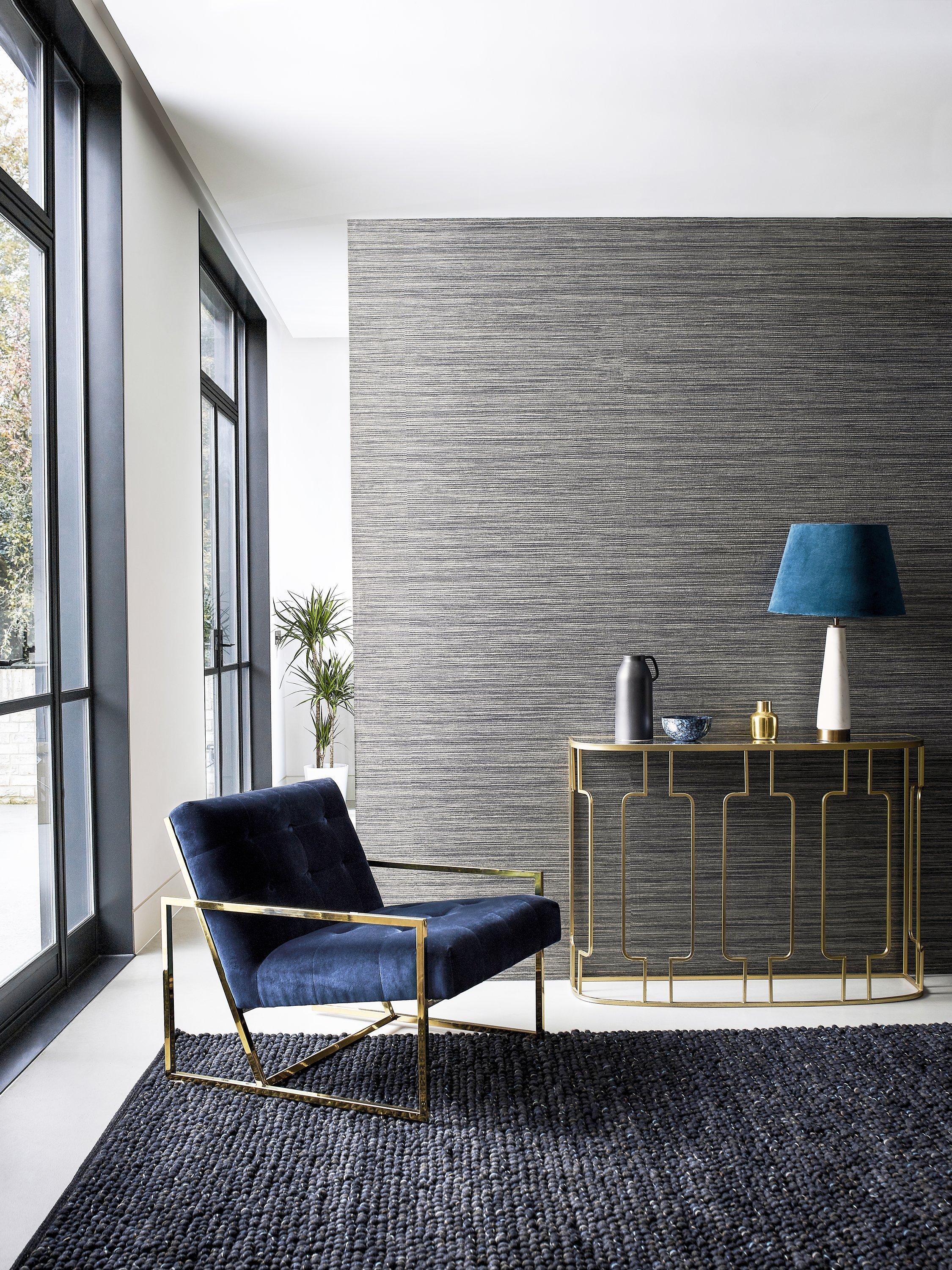 With its grass cloth feel, Lisle is a "go to" wallcovering for texture, with metallic highlights blended throughout the design's horizontal stripes.