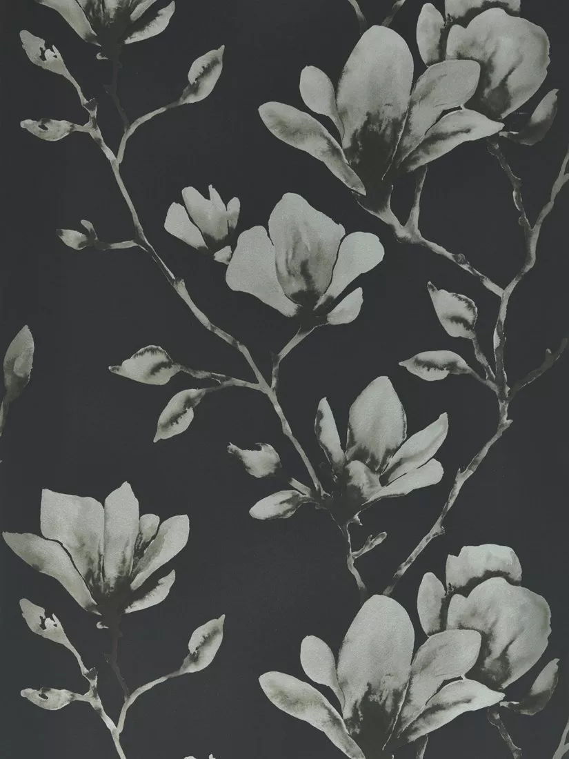 A painterly magnolia trailing wallpaper design produced in a wide width, finely engraved on a soft metallic background.