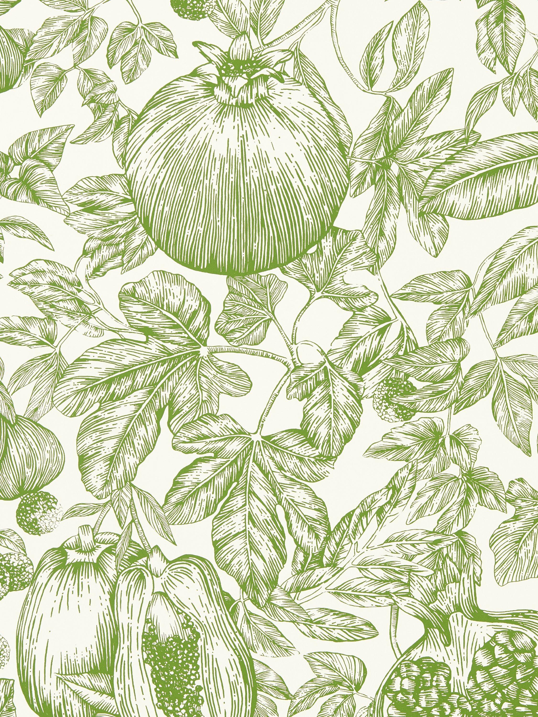 A contemporary interpretation of fruits found along the Silk Road, pomegranates, figs and lichees mingle in this modern toile wallpaper, hand drawn in pen.