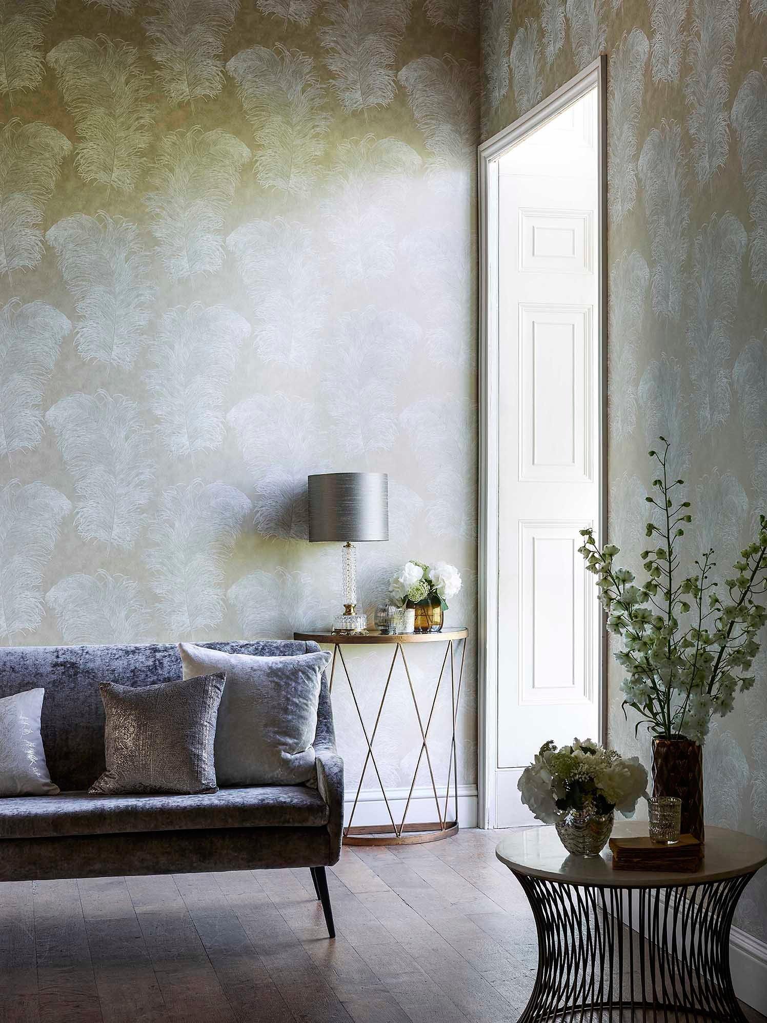 An extravagant ostrich feather set against a metallic textured ground.