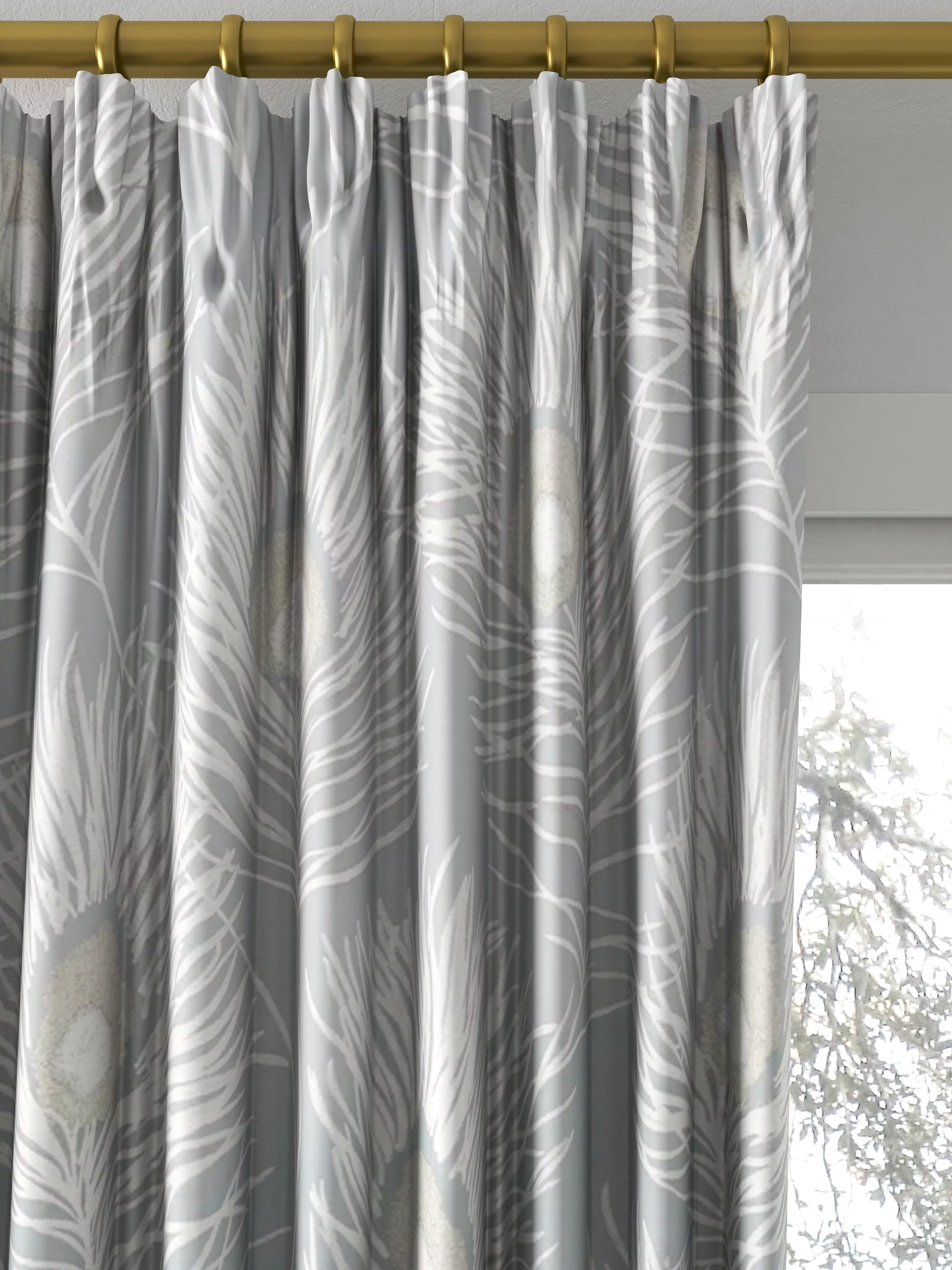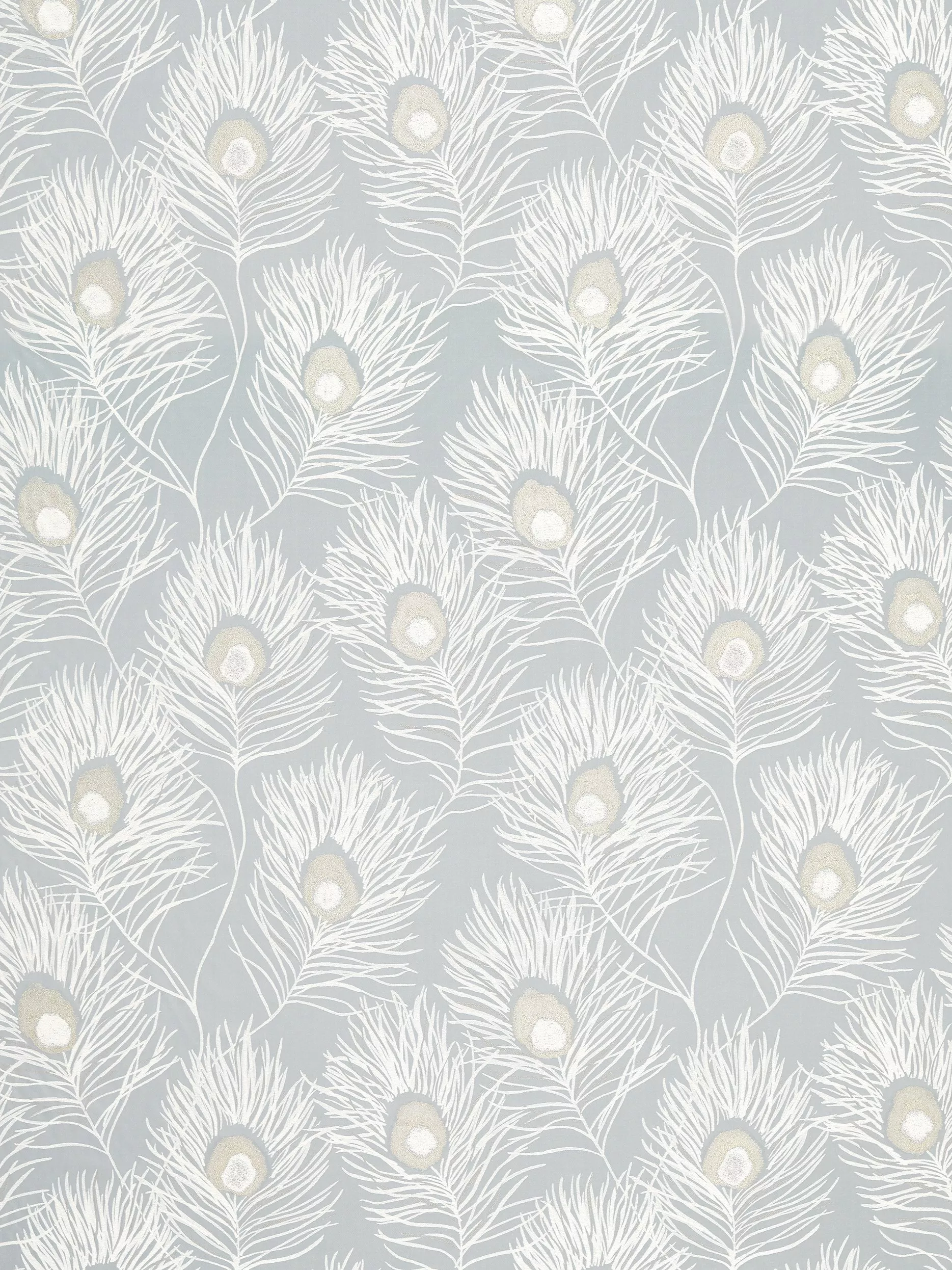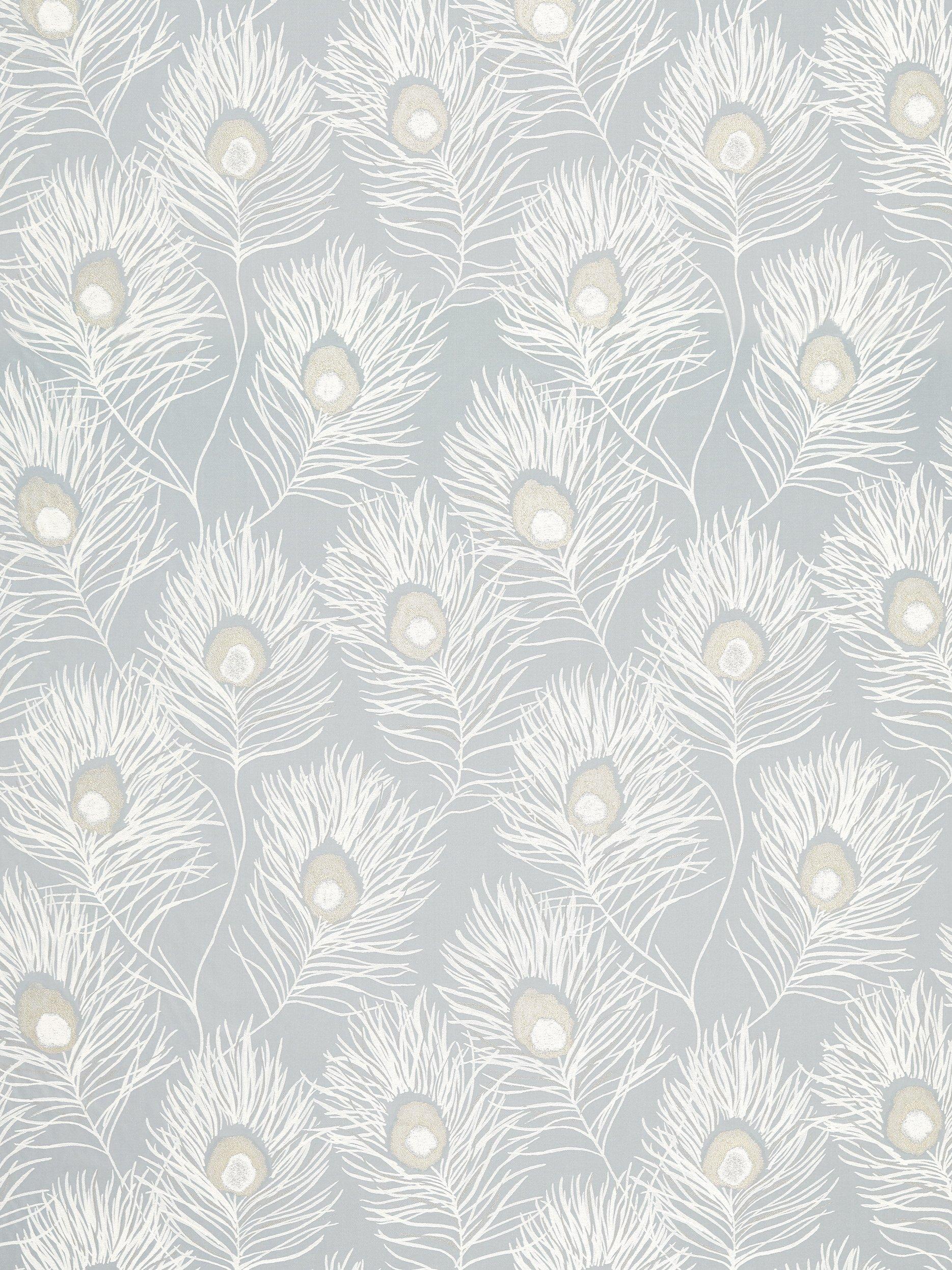 From Harlequin, Orlena is a woven jacquard fabric featuring large peacock feathers with metallic accents against a muted backdrop.