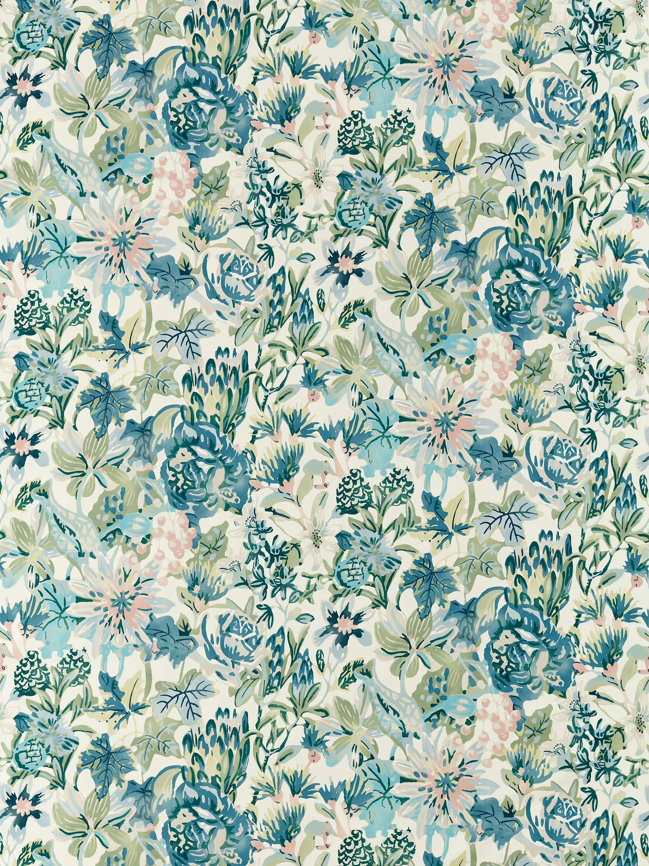 An incredible design with luscious layered florals. A contemporary chintz with an almost block print appearance, this dual-purpose fabric is produced on 100% cotton.