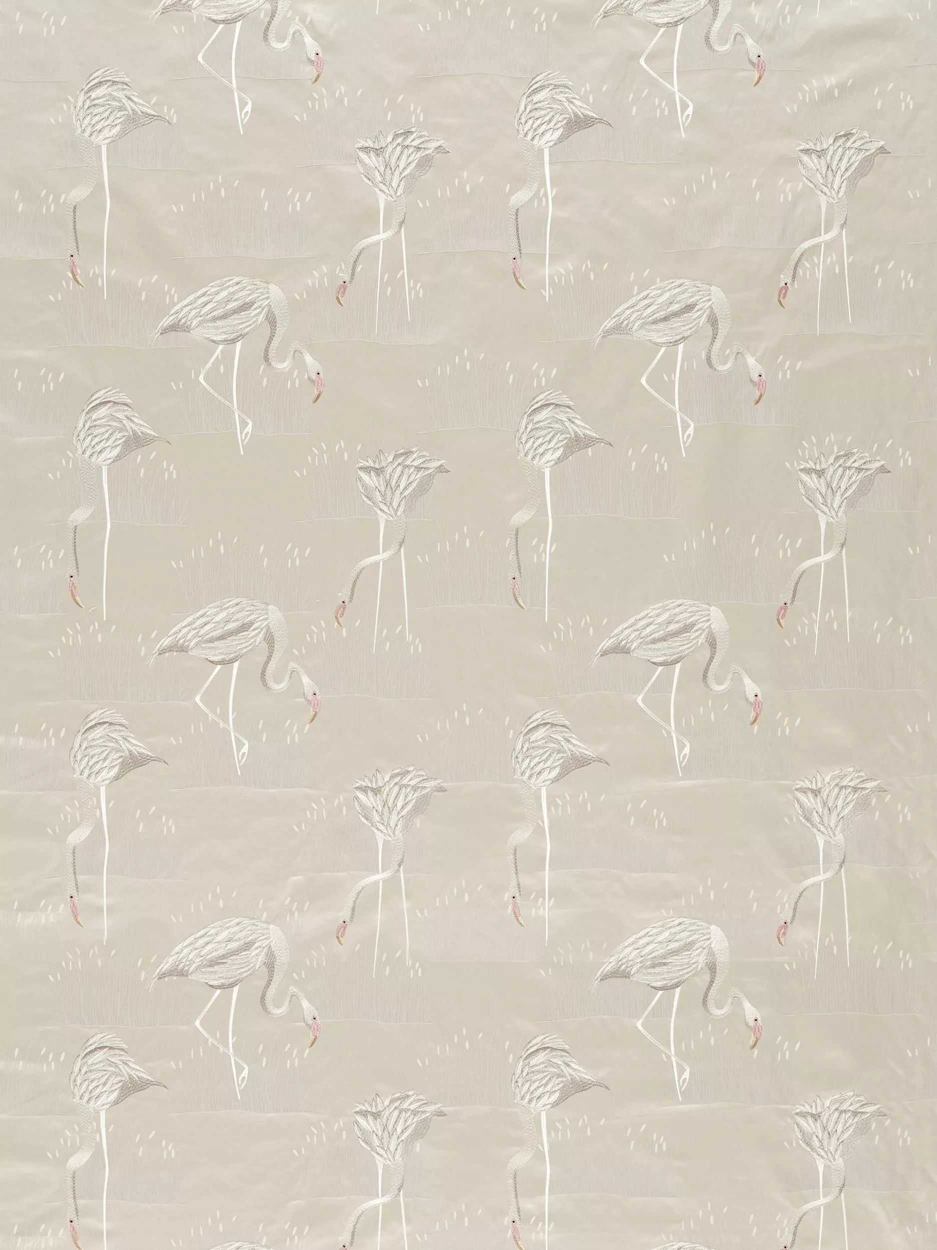 Flamingos dabbling delicately in shallow waters feature on the Salinas fabric from Harlequin, their embroidered wings showing off exquisite detail.