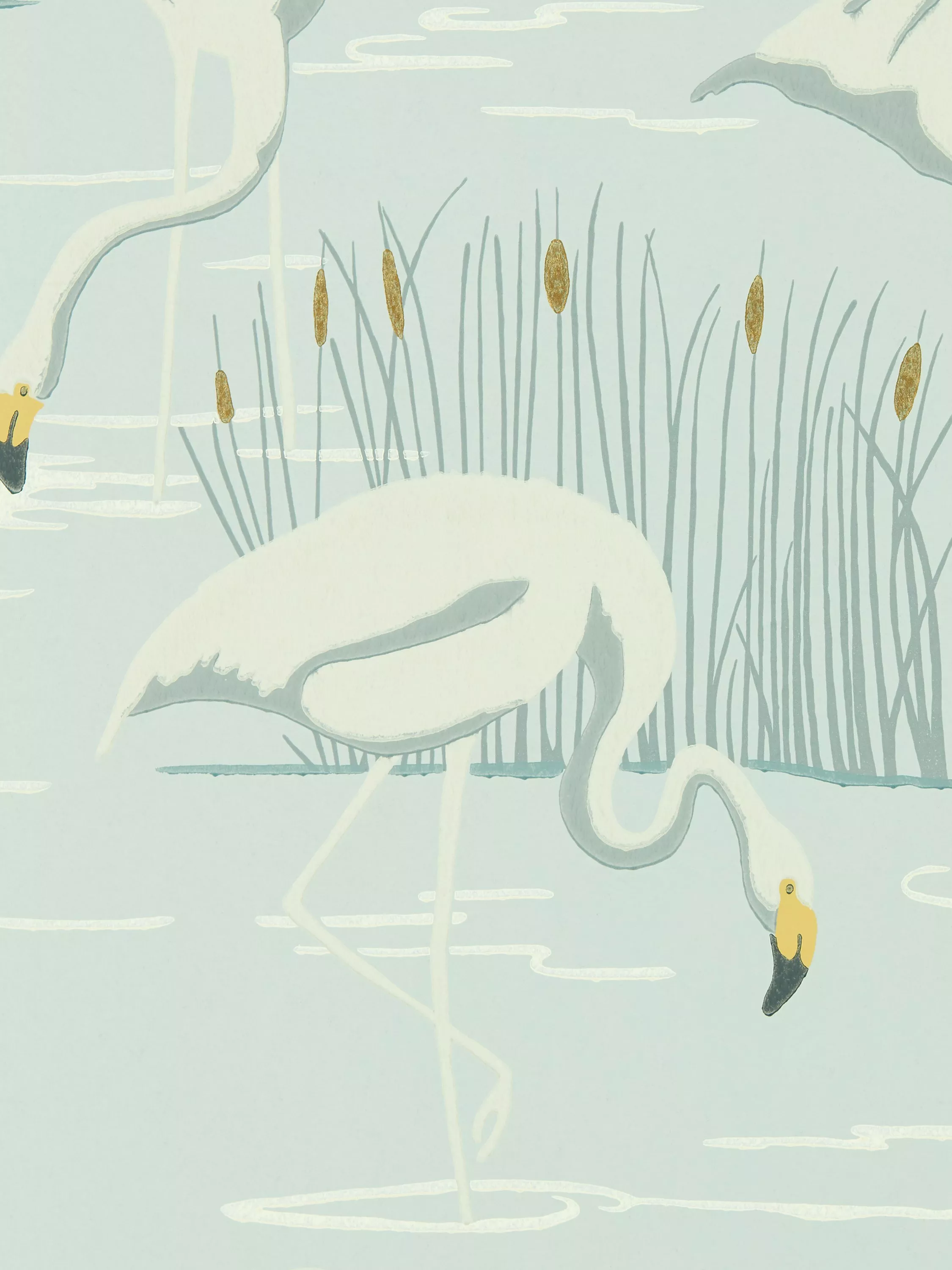 Surface printed flamingos, for adding a characterful twist to statement walls. With a chalky ground and metallic bullrush highlights.