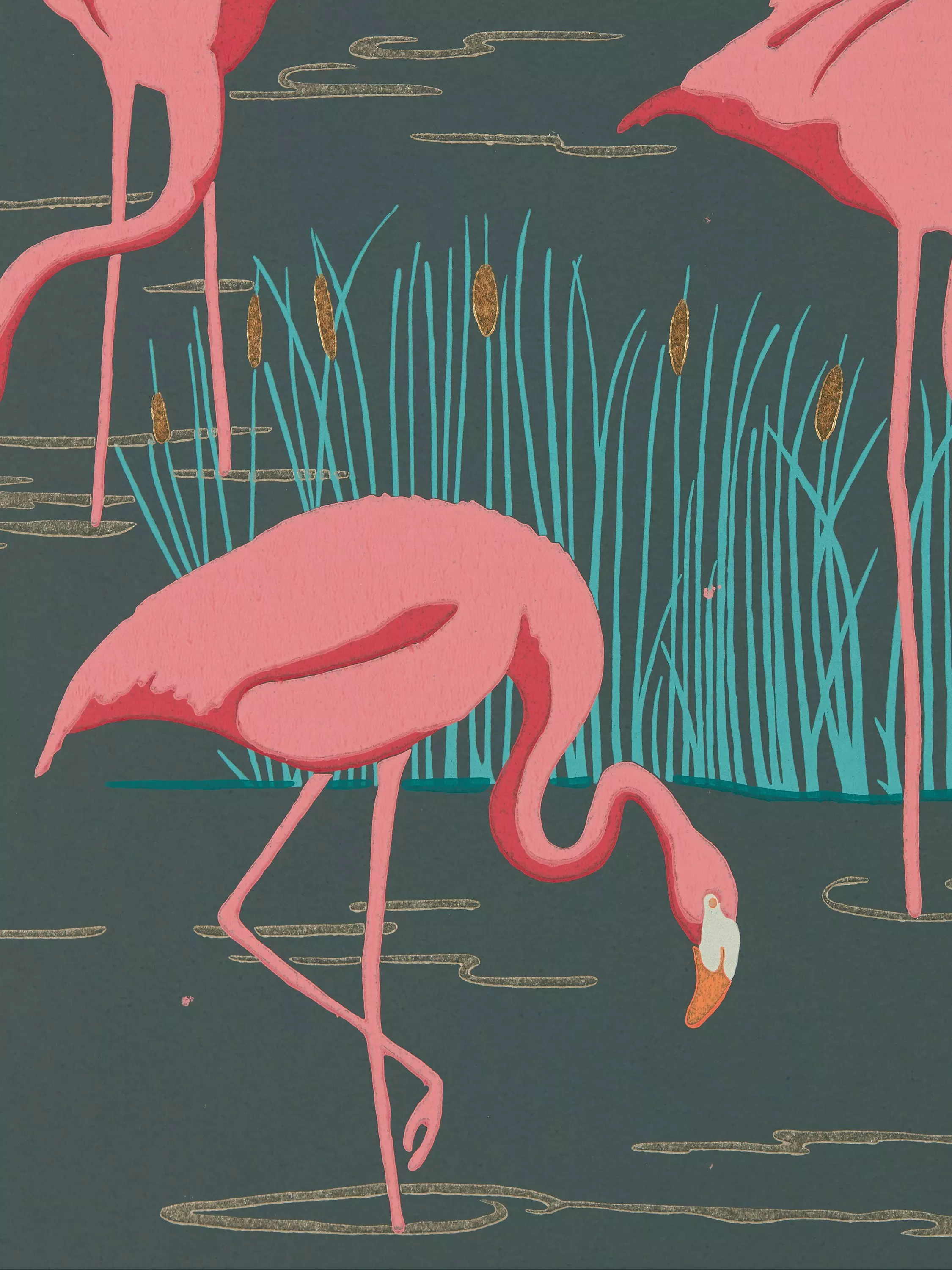 Surface printed flamingos, for adding a characterful twist to statement walls. With a chalky ground and metallic bullrush highlights.