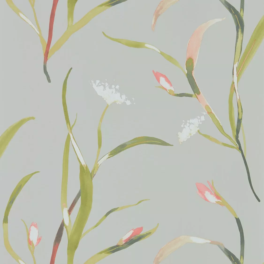Abstract flower heads resembling iris and lily as well as bulrushes and pondlike motifs.