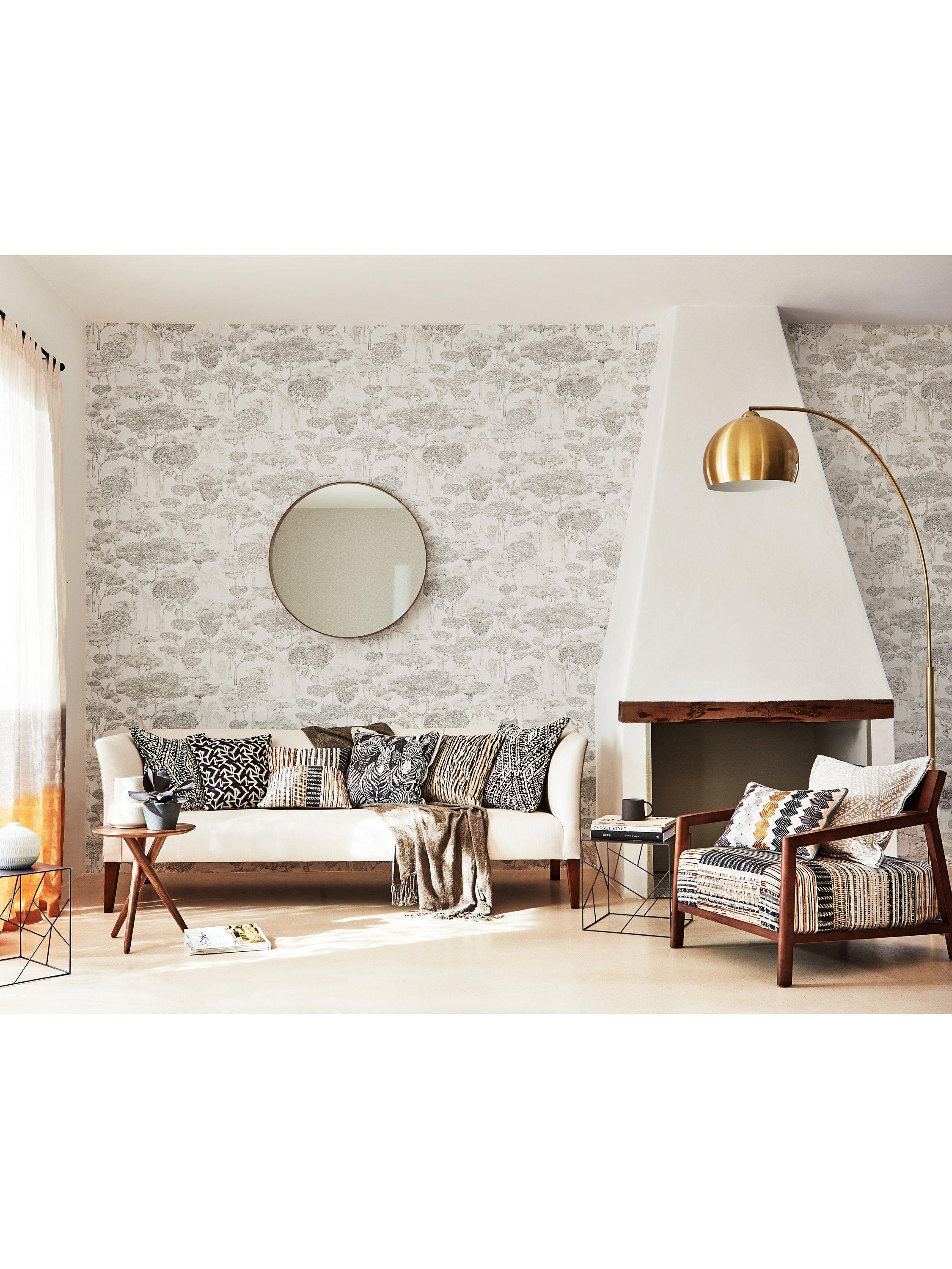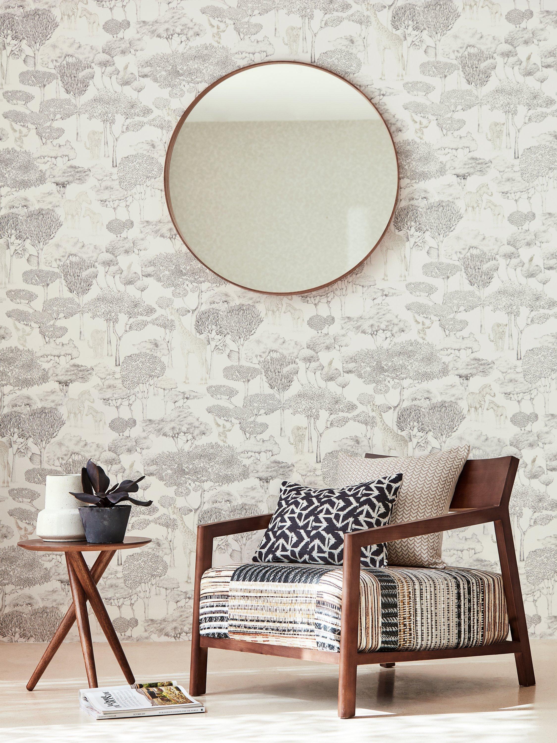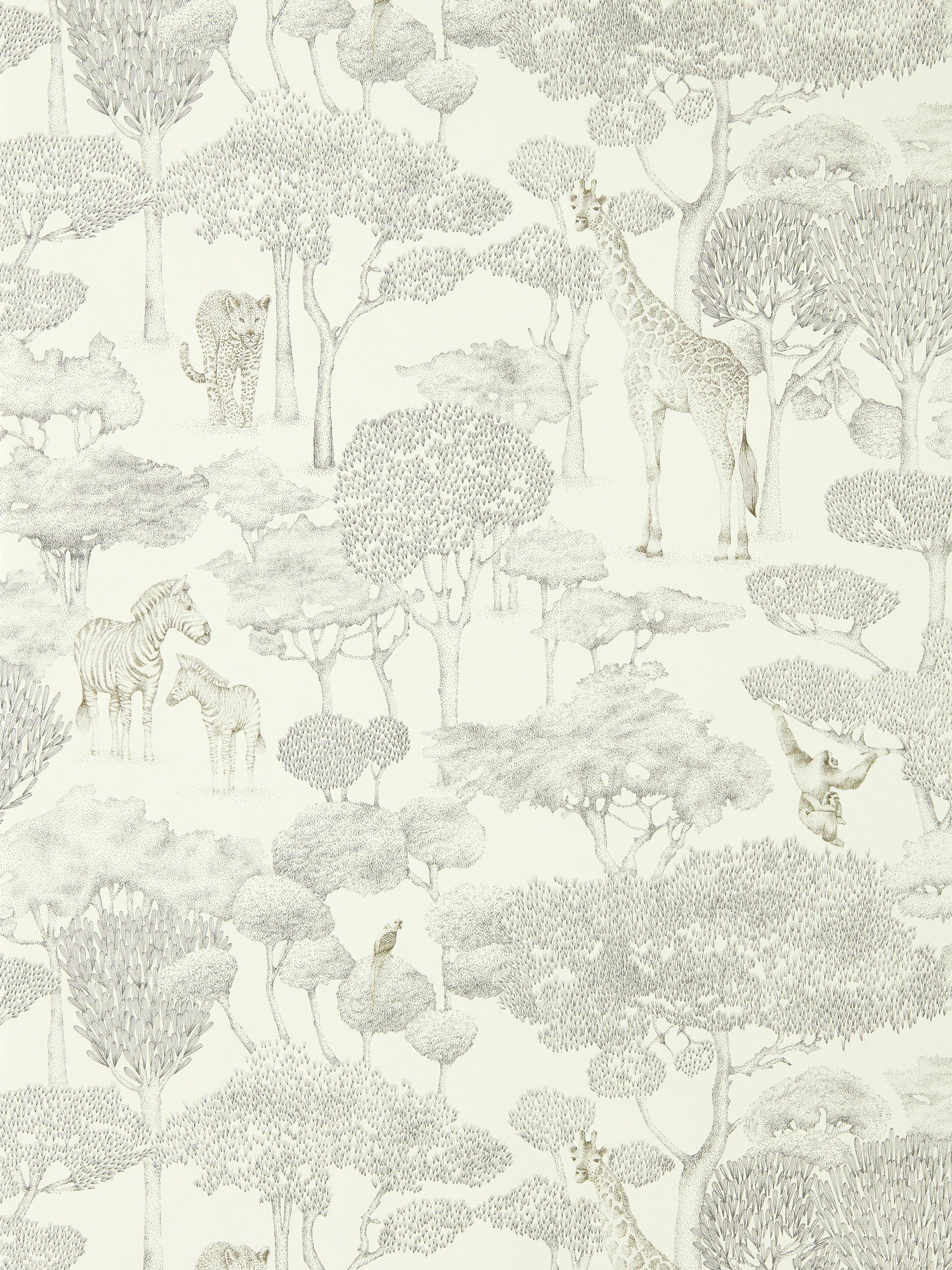 This striking modern toile was hand-drawn in the Harlequin studio using a fine ink pen. Look carefully at the wonderfully detailed design and see zebras, leopards, giraffes, monkeys and a tiny parrot shaded by beautifully shaped trees.