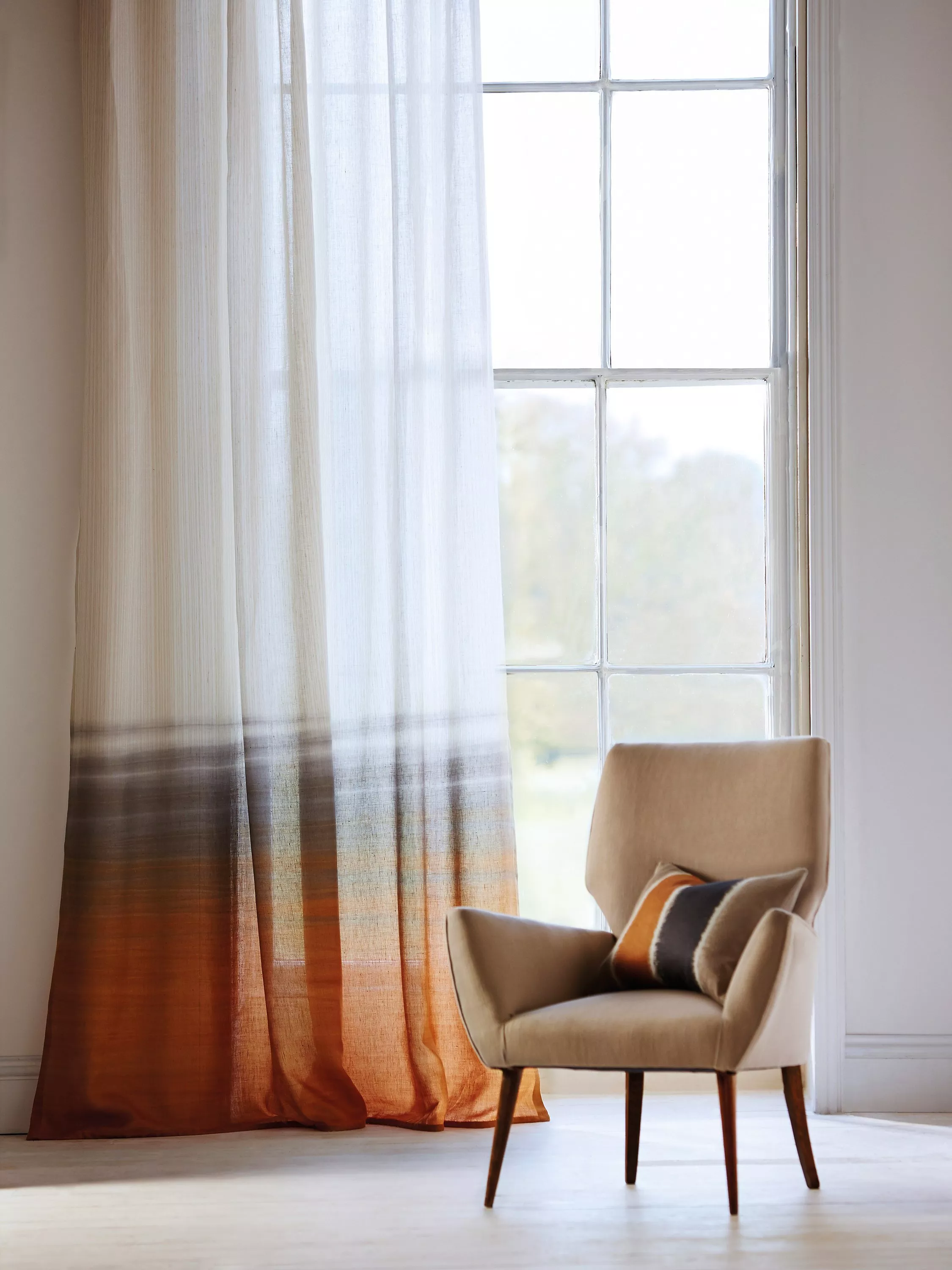 From Harlequin, this Tranquil voile fabric has dramatic colouring that gradually gives way to the soft neutral main body. This ombre effect is achieved by using a specialised spray-dye technique.