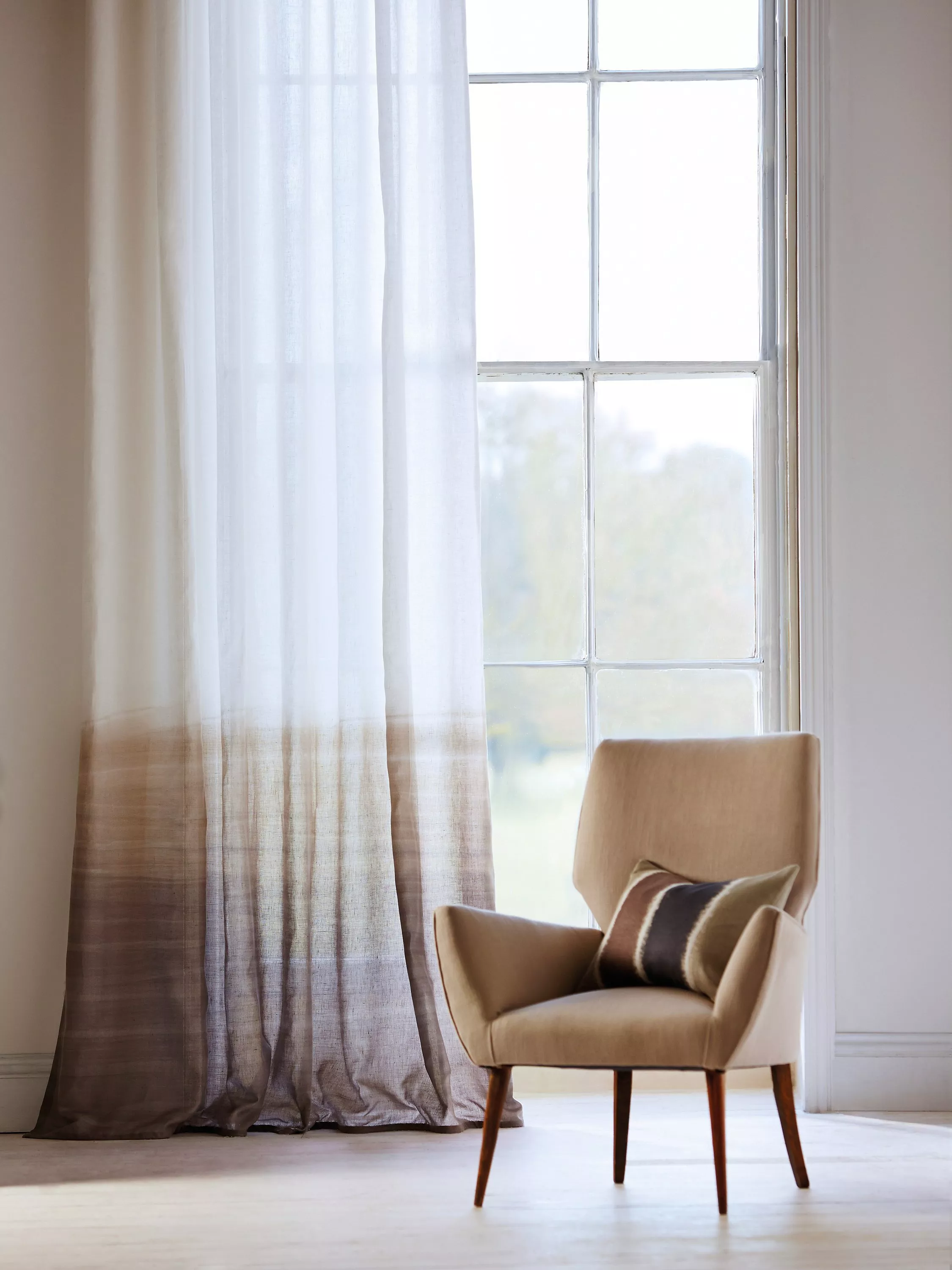 From Harlequin, this Tranquil voile fabric has dramatic colouring that gradually gives way to the soft neutral main body. This ombre effect is achieved by using a specialised spray-dye technique.