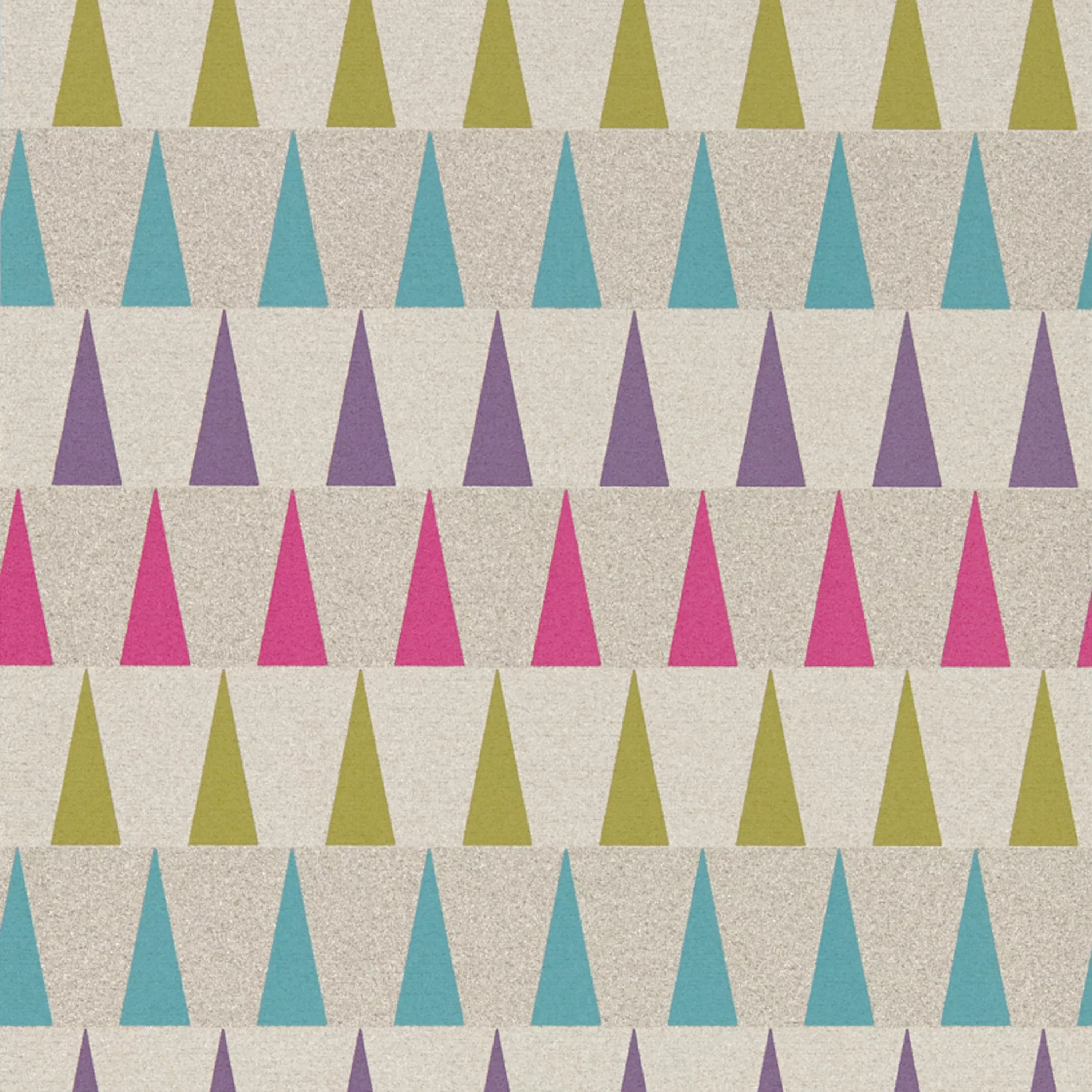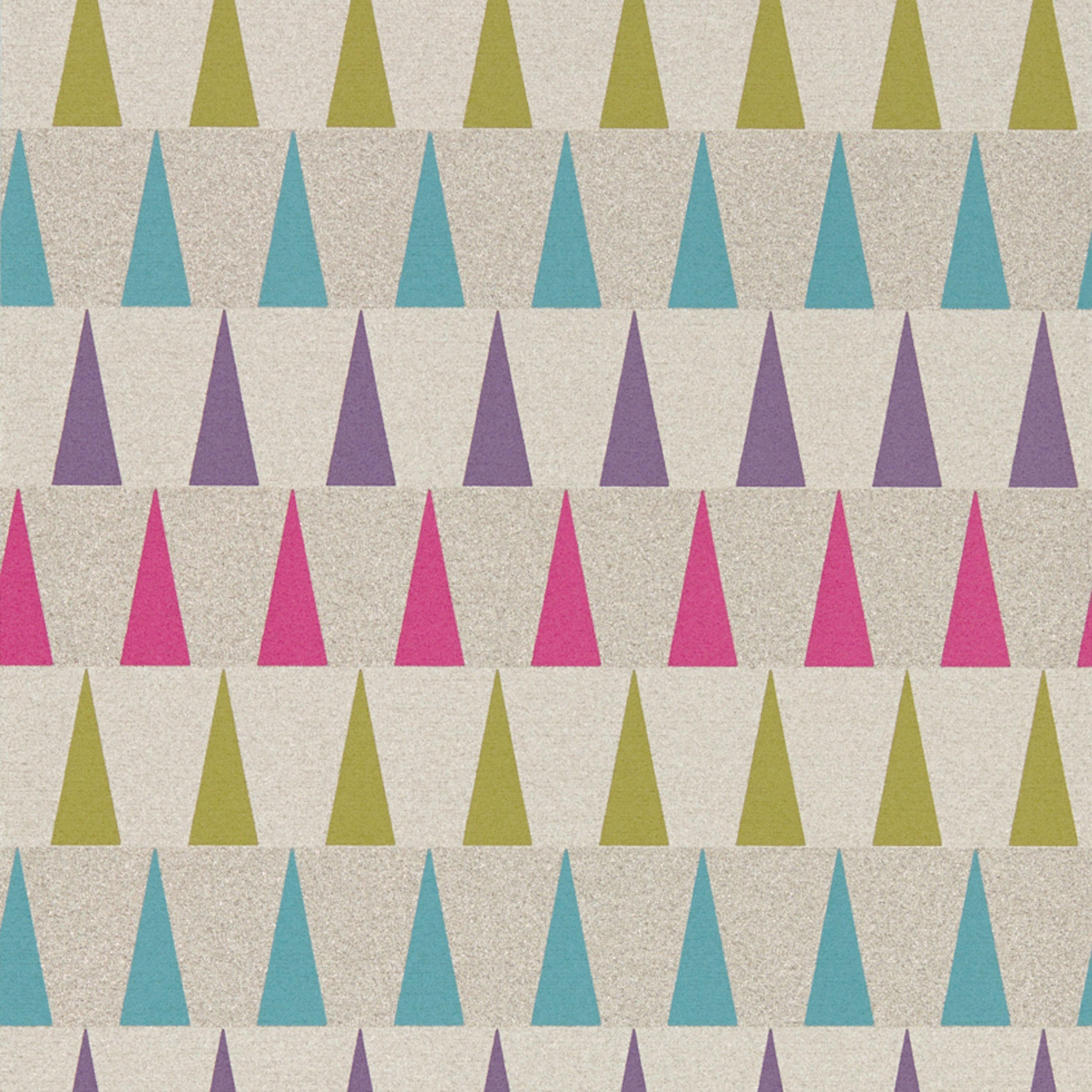 A contemporary geometric triangular design, this fashion-forward vinyl wallcovering is available on either a matte metallic or flush grey ground.