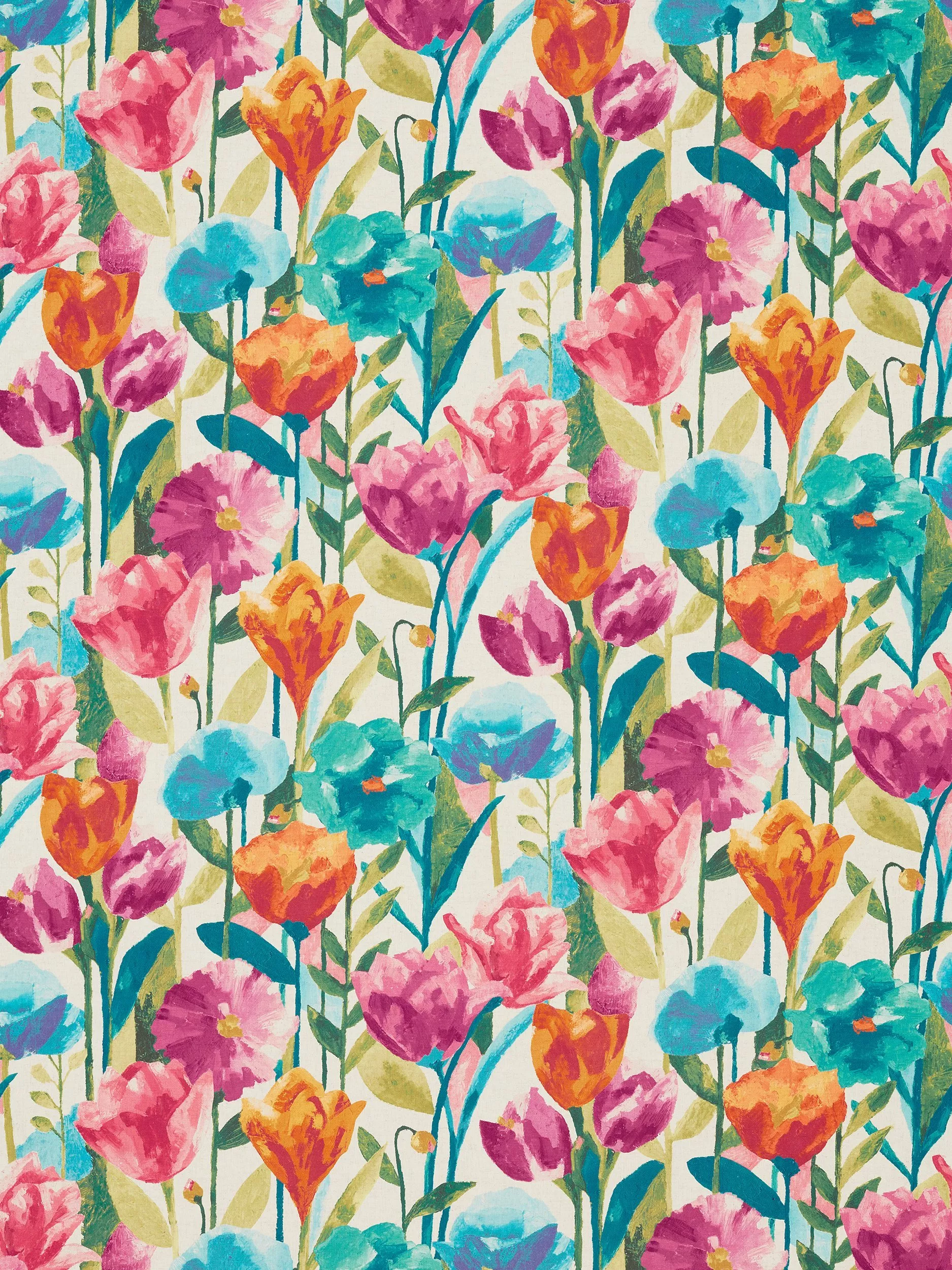 Colourful, painterly poppies and tulips decorate this Verdaccio fabric from Harlequin. It's a bright and joyful fabric to use for upholstery, curtains or bedcovers.