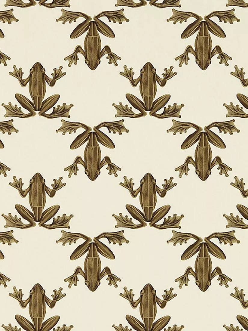 This playful wallpaper features a diamond pattern of whimsical frogs sitting in a trellis formation.