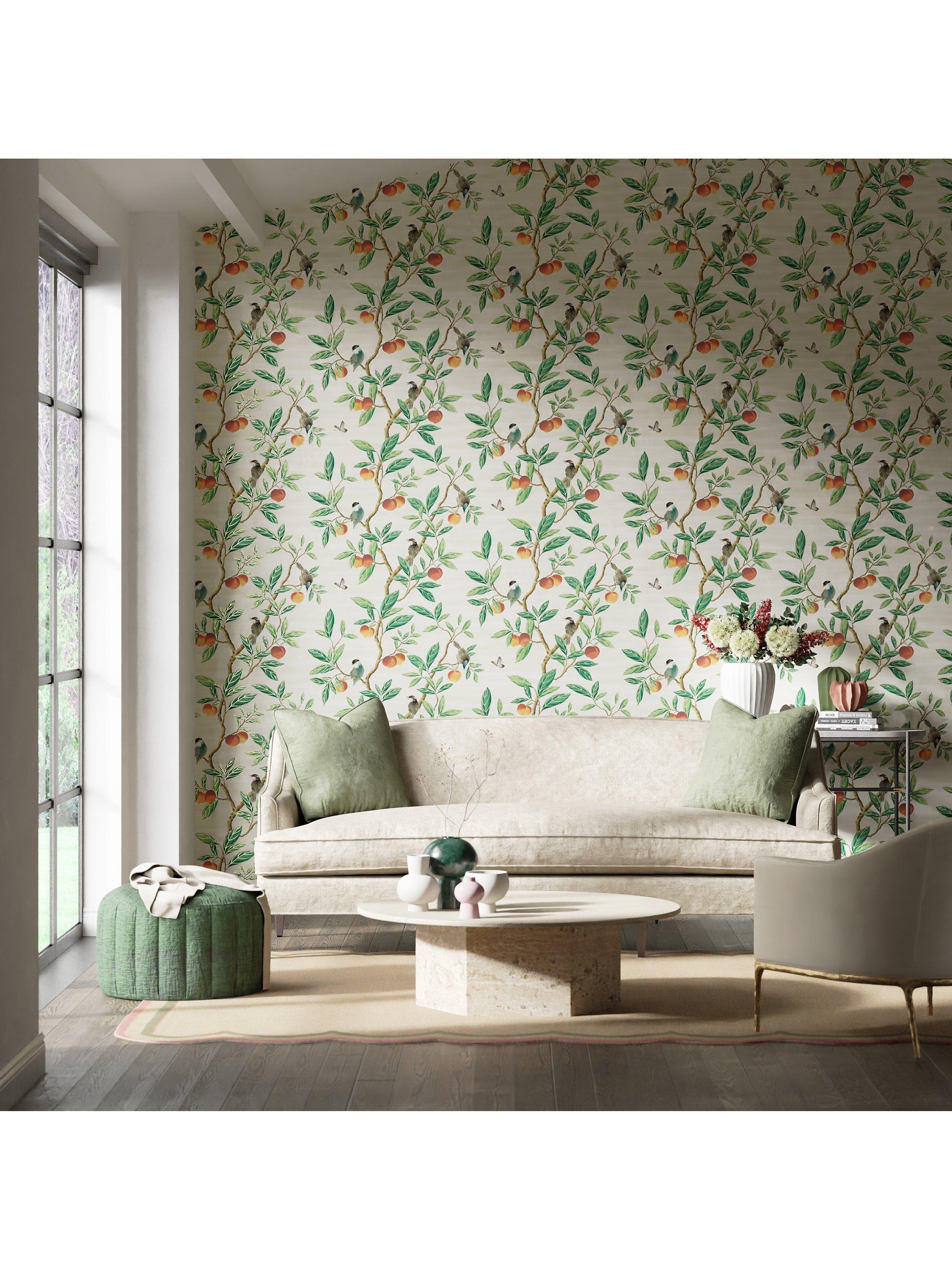 This charming interpretation of an antique chinoiserie wallpaper depicts stylised birds and ripe fruits. A modern take on a traditional panoramic scene, it's been reinterpreted into a repeating pattern, where less is more.